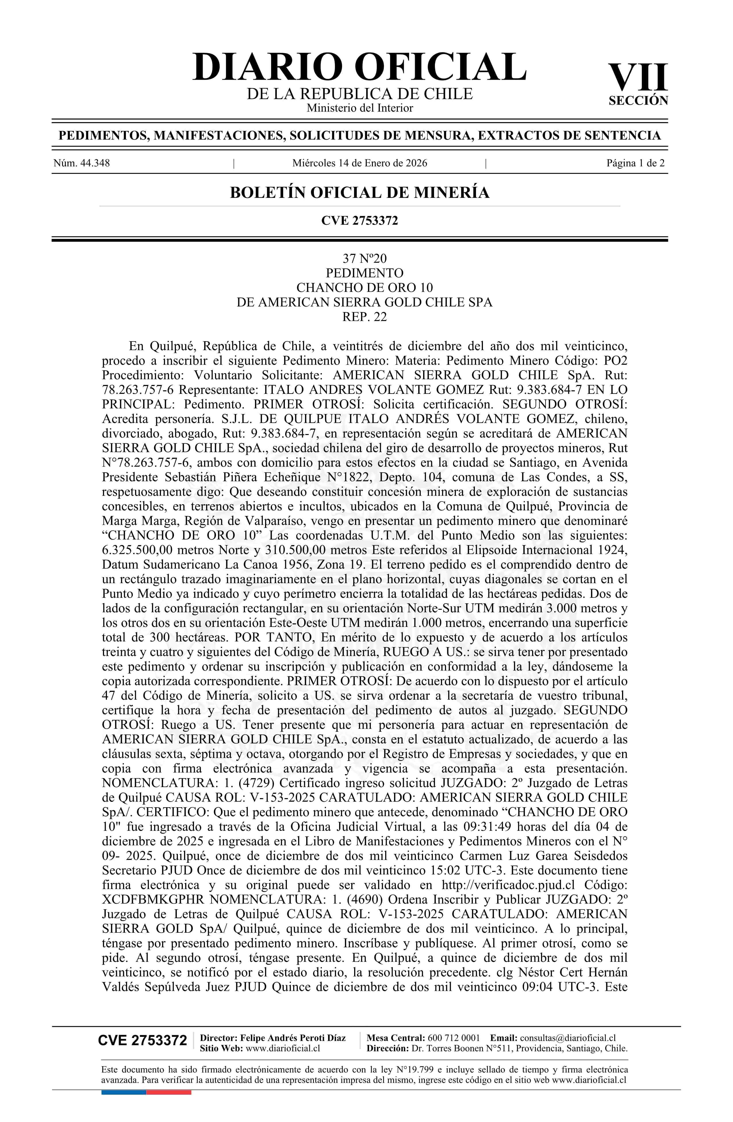 CHANCHO DE ORO 10 / American Sierra Gold Chile SpA 14-01-2026 DIARIO OFICIAL CHILE - BOLETÍN OFICIAL DE MINERÍA |