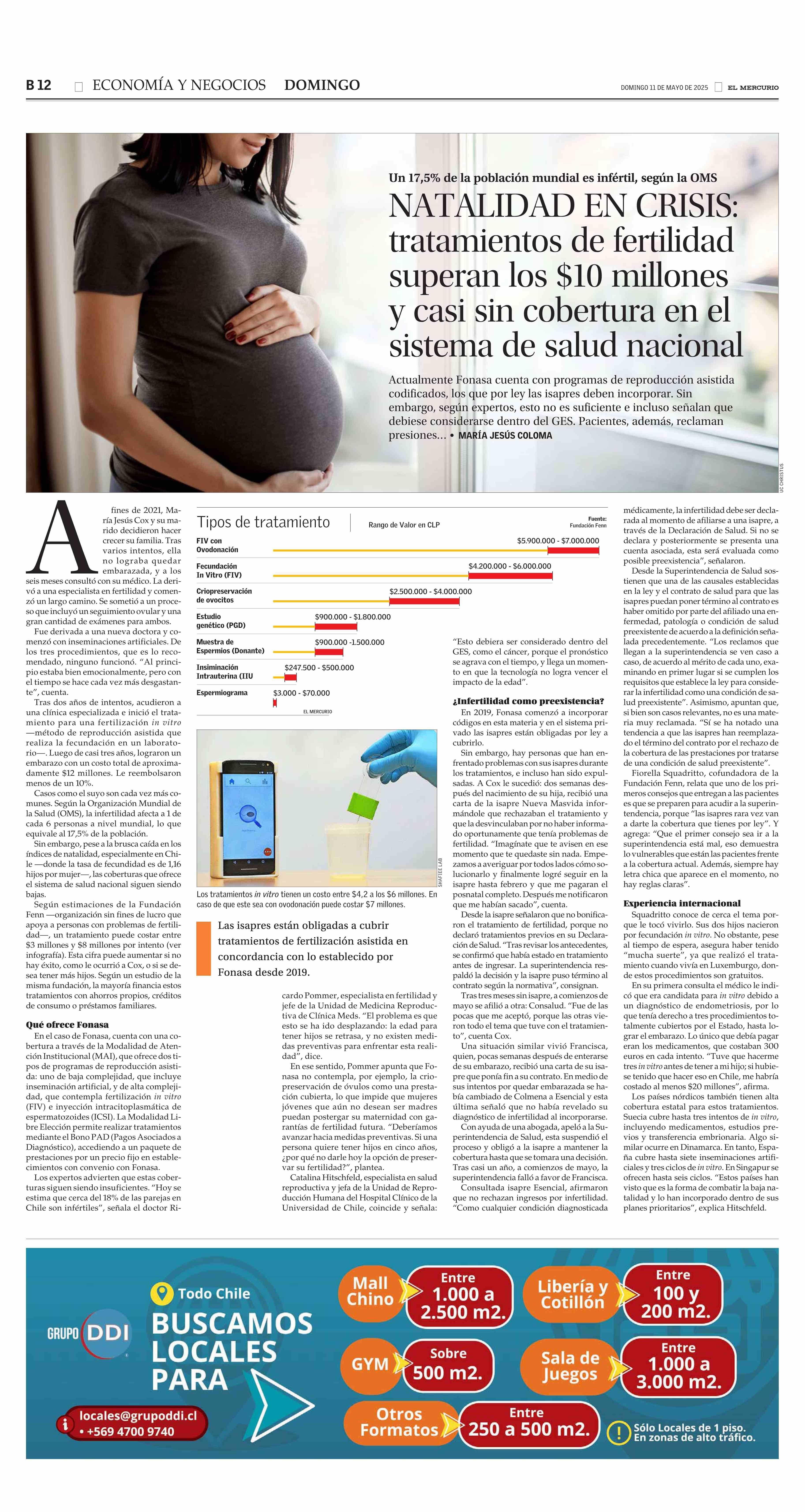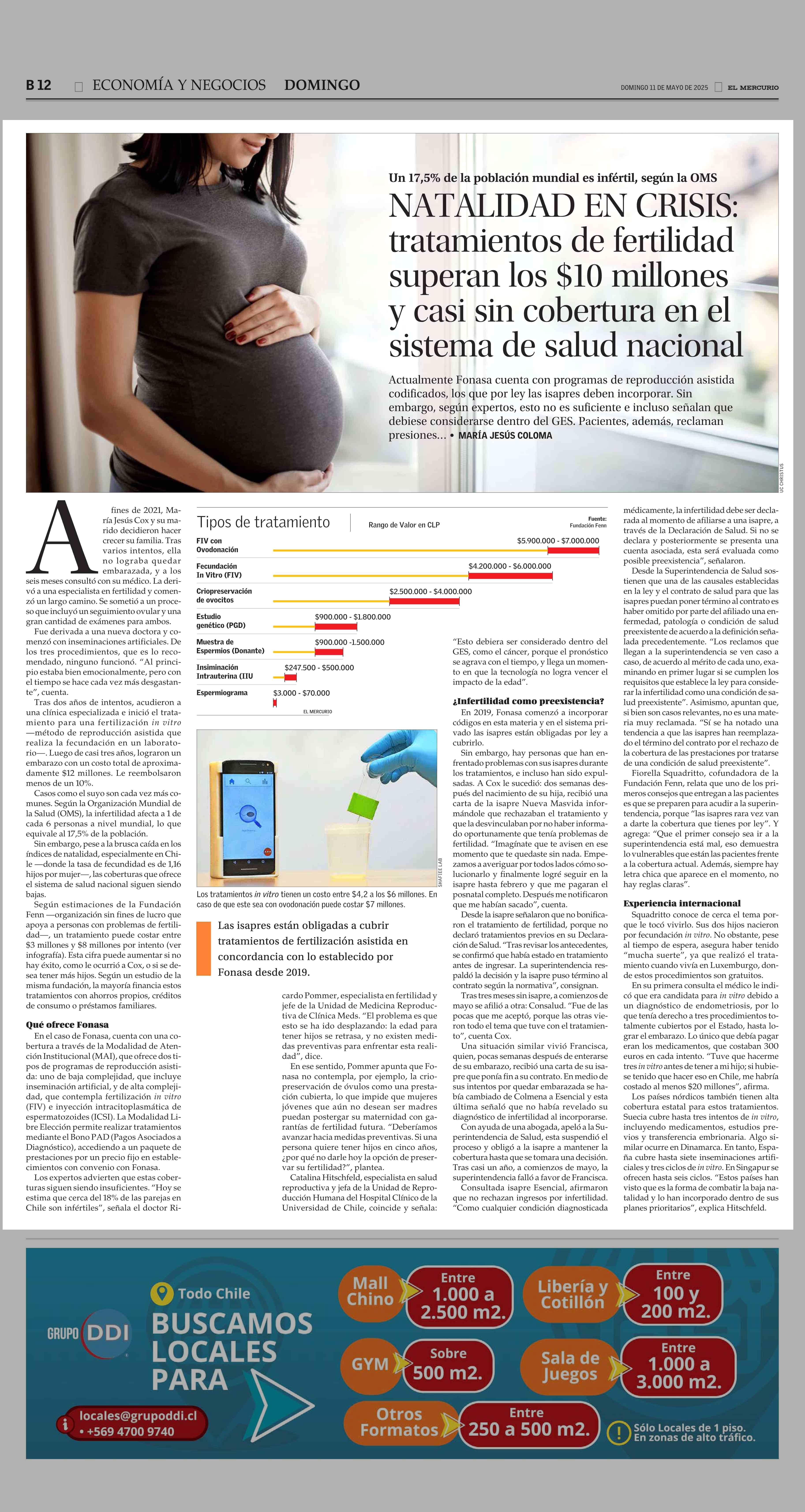 NATALIDAD EN CRISIS: tratamientos de fertilidad superan los $10 millones y Casi sin cobertura en el sistema de salud nacional 11-05-2025 El Mercurio |