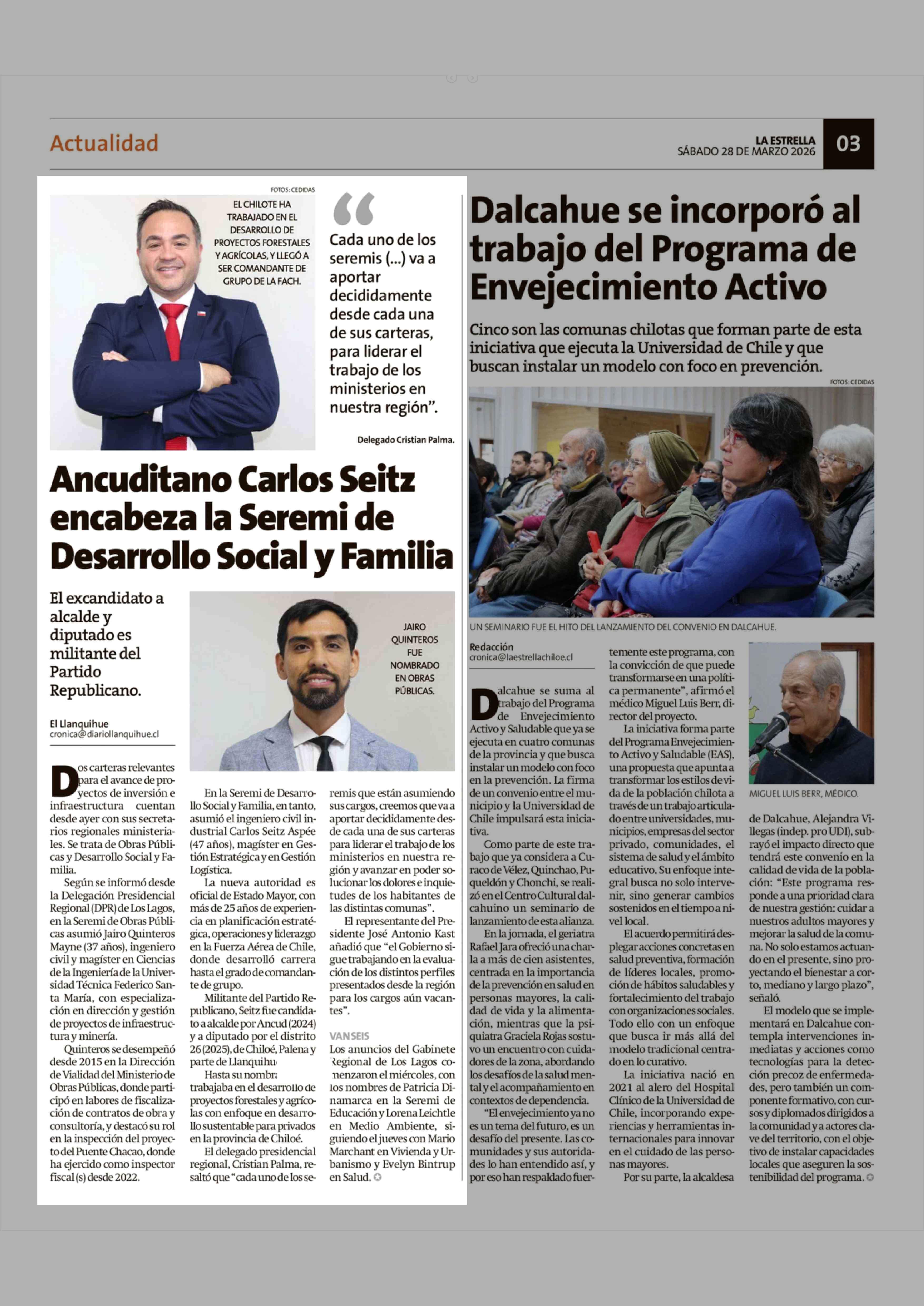 Ancuditano Carlos Seitz encabeza la Seremi de Desarrollo Social y Familia 28-03-2026 La Estrella de Chiloé |