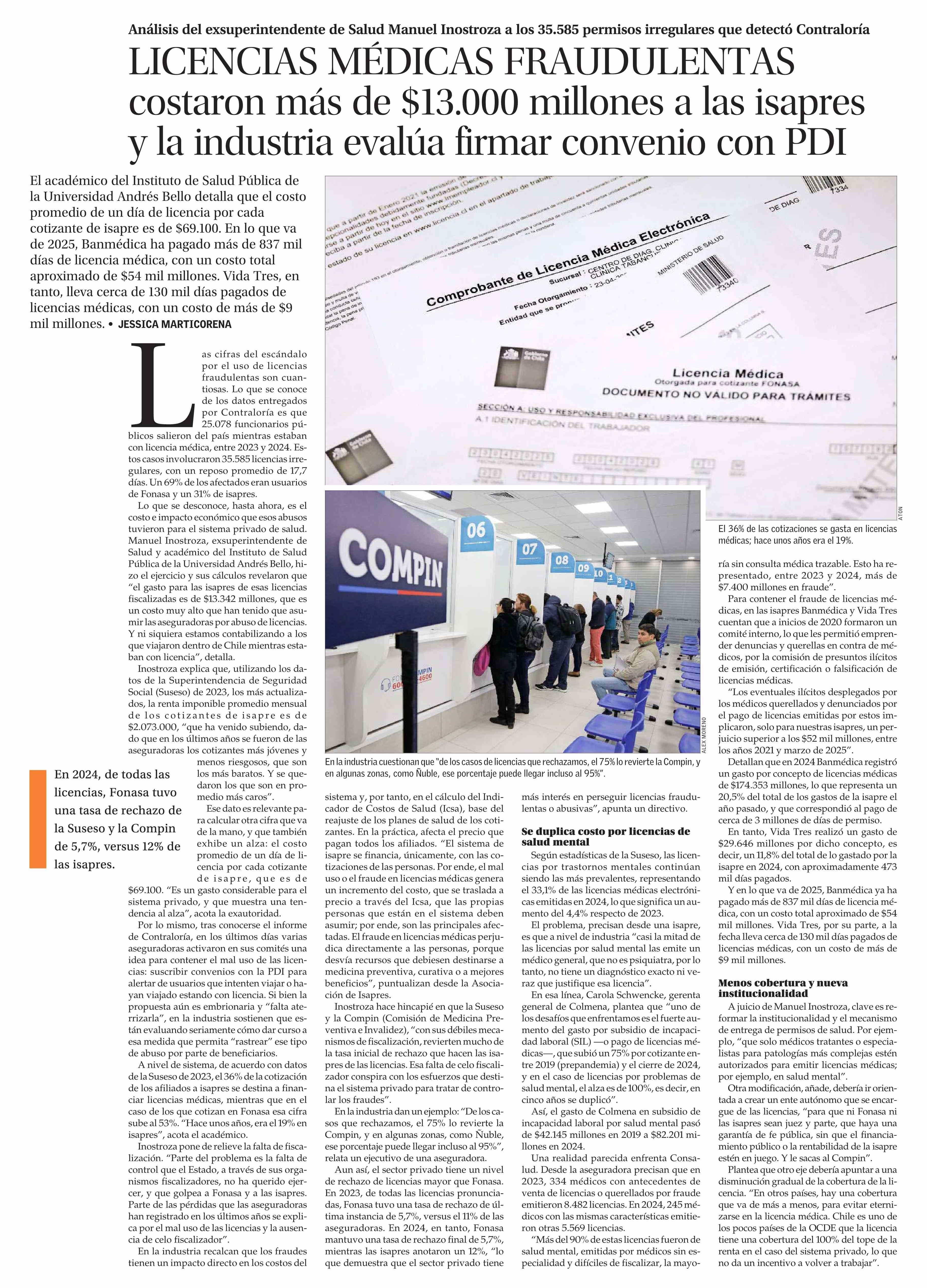 LICENCIAS MÉDICAS FRAUDULENTAS costaron más de $13.000 millones a las isapres y la industria evalúa firmar convenio con PDI 01-06-2025 El Mercurio |