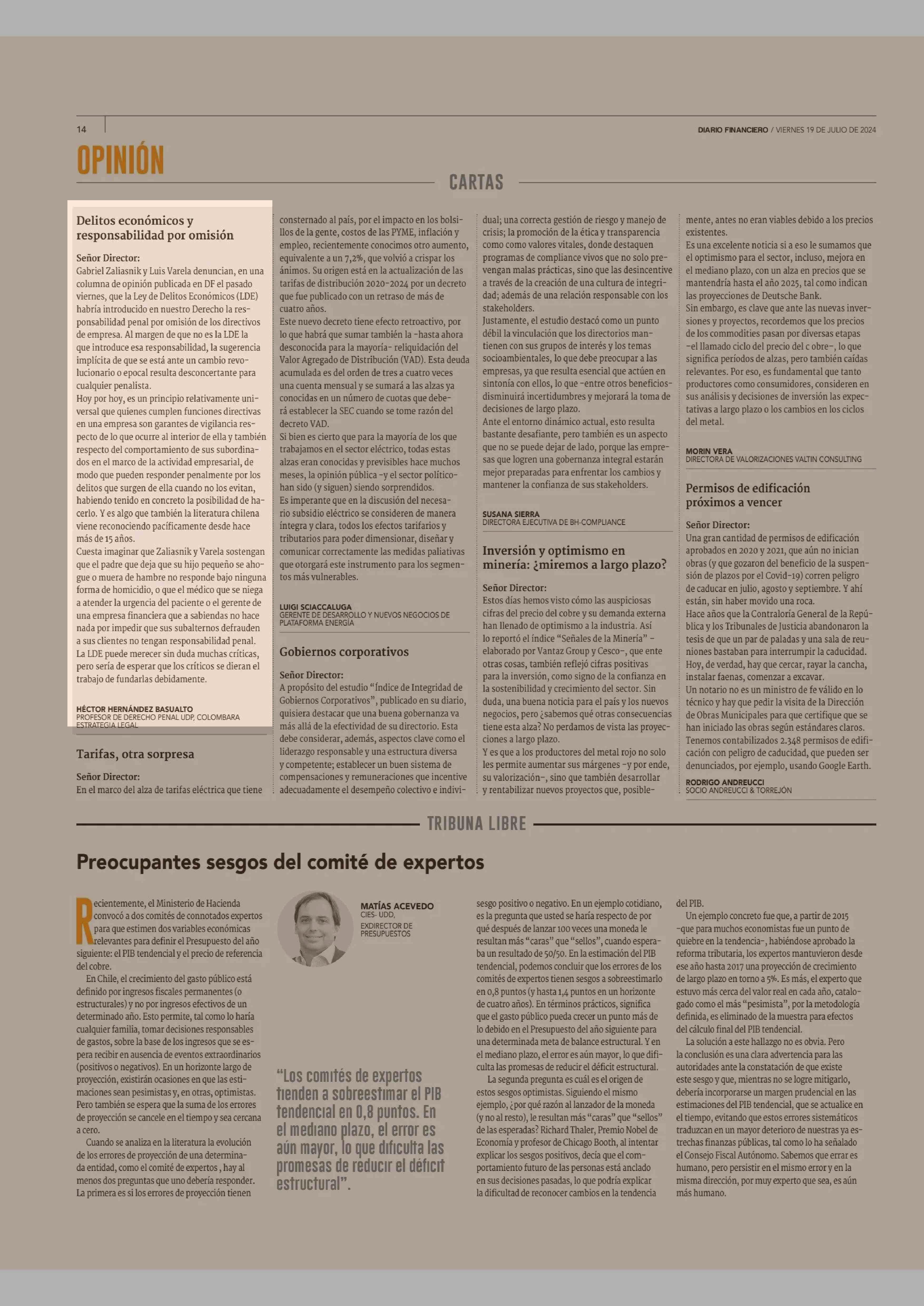 CARTAS: Delitos económicos y responsabilidad por omisión 19-07-2024 Diario Financiero |