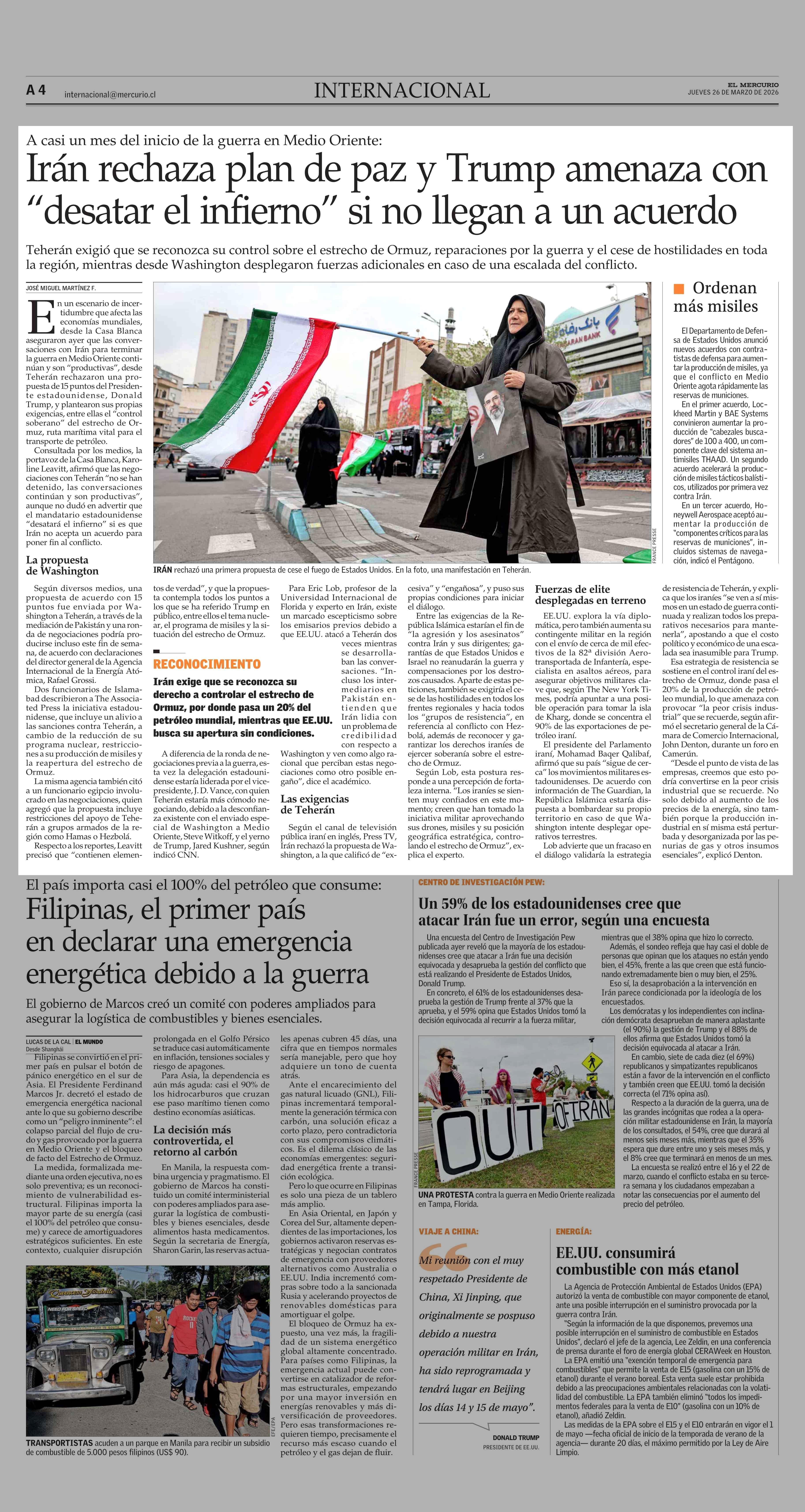 Irán rechaza plan de paz y Trump amenaza con “desatar el infierno” si no llegan a un acuerdo 26-03-2026 El Mercurio |