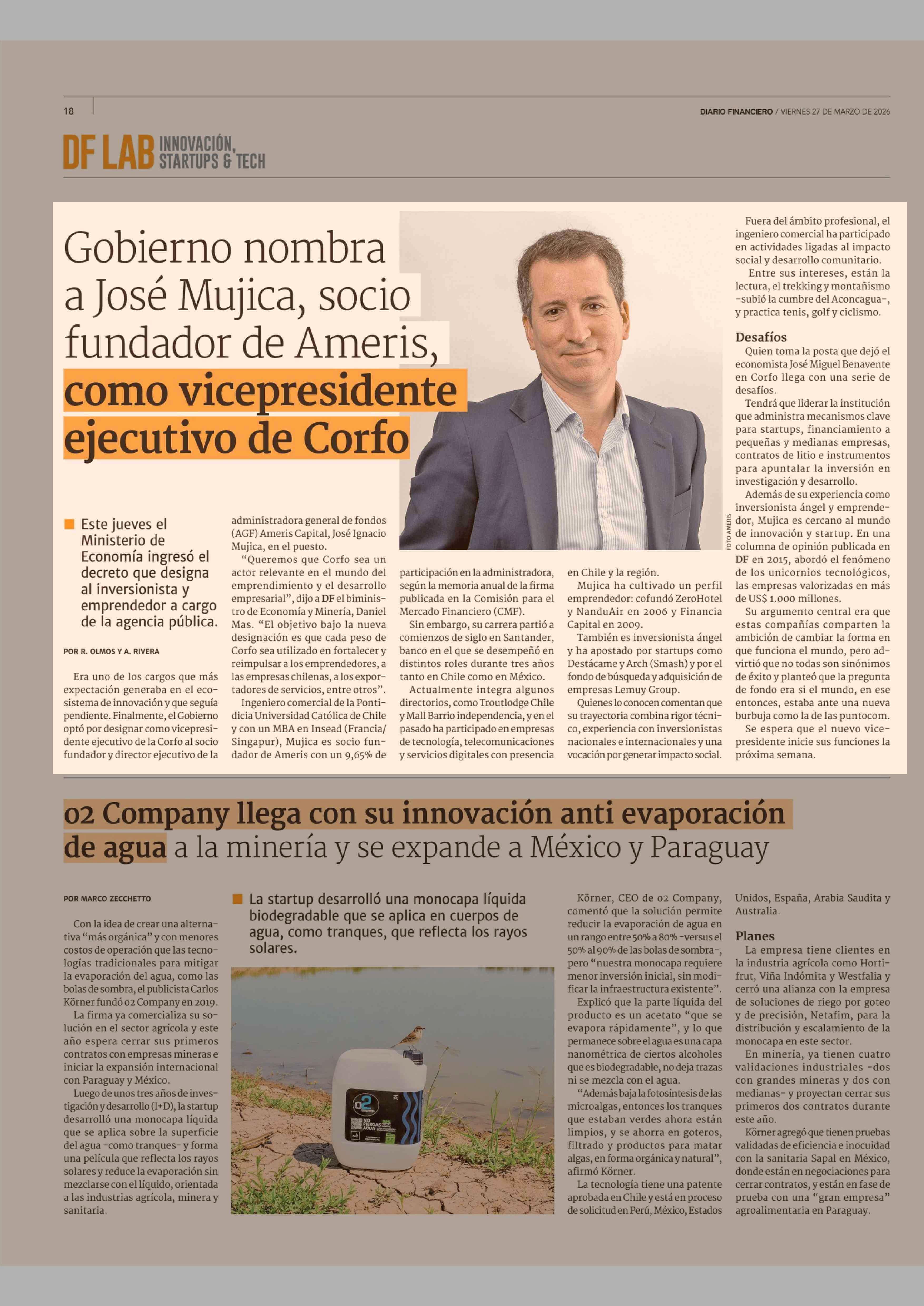 Gobierno nombra a José Mujica, socio fundador de Ameris, como vicepresidente ejecutivo de Corfo 27-03-2026 Diario Financiero |