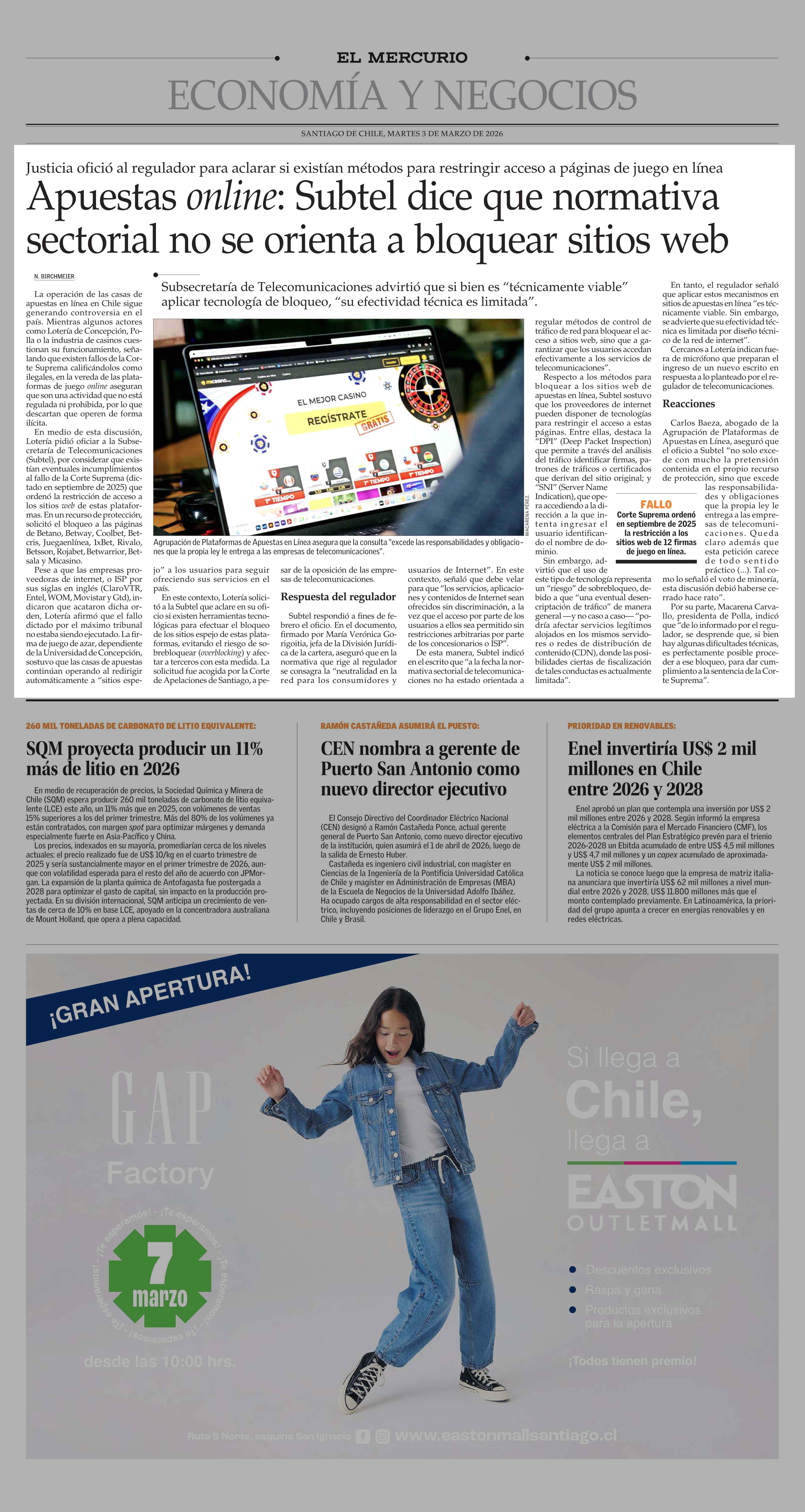 Apuestas online: Subtel dice que normativa sectorial no se orienta a bloquear sitios web 03-03-2026 El Mercurio |