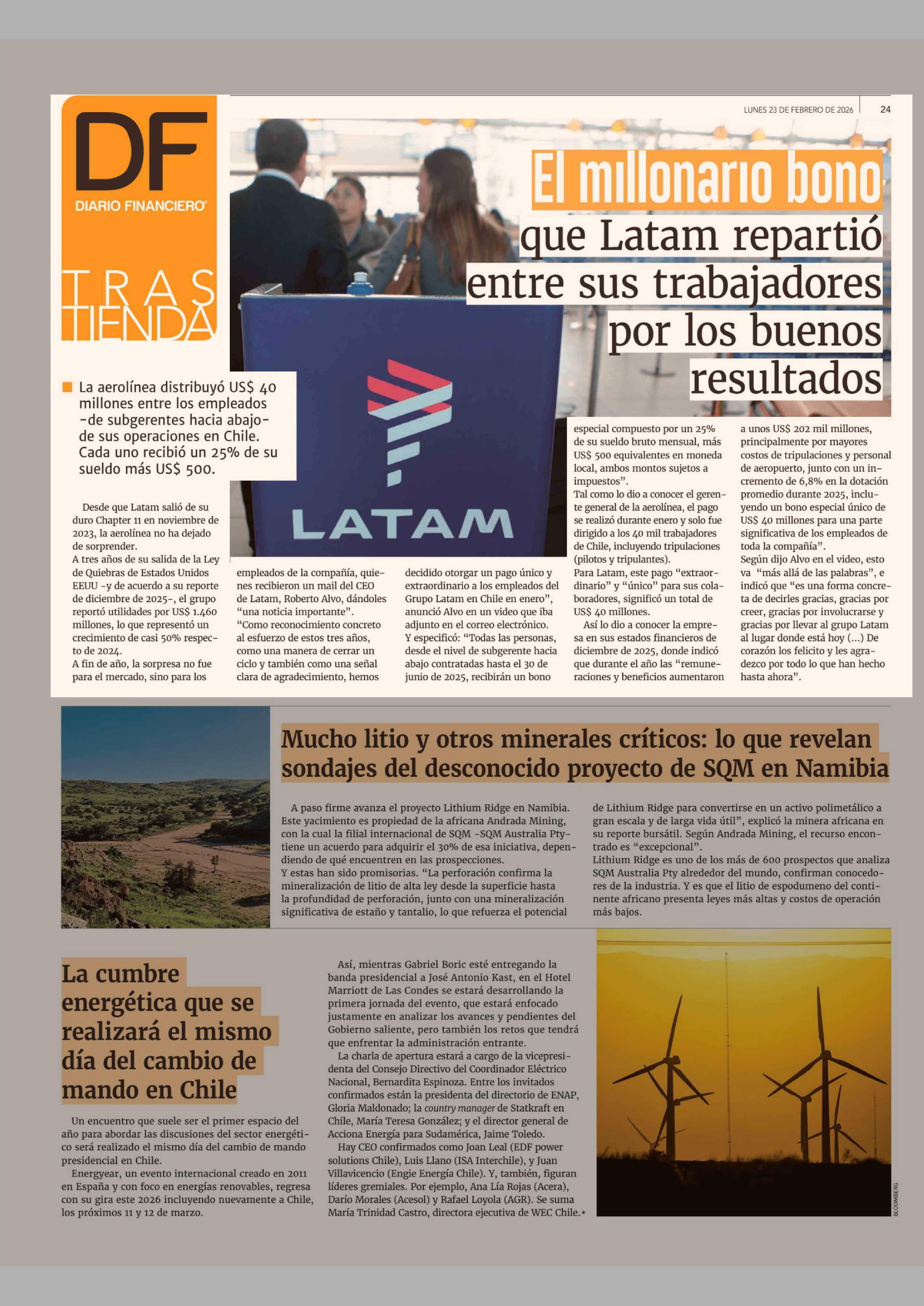 El millonario bono que Latam repartió entre sus trabajadores por los buenos resultados 23-02-2026 Diario Financiero |