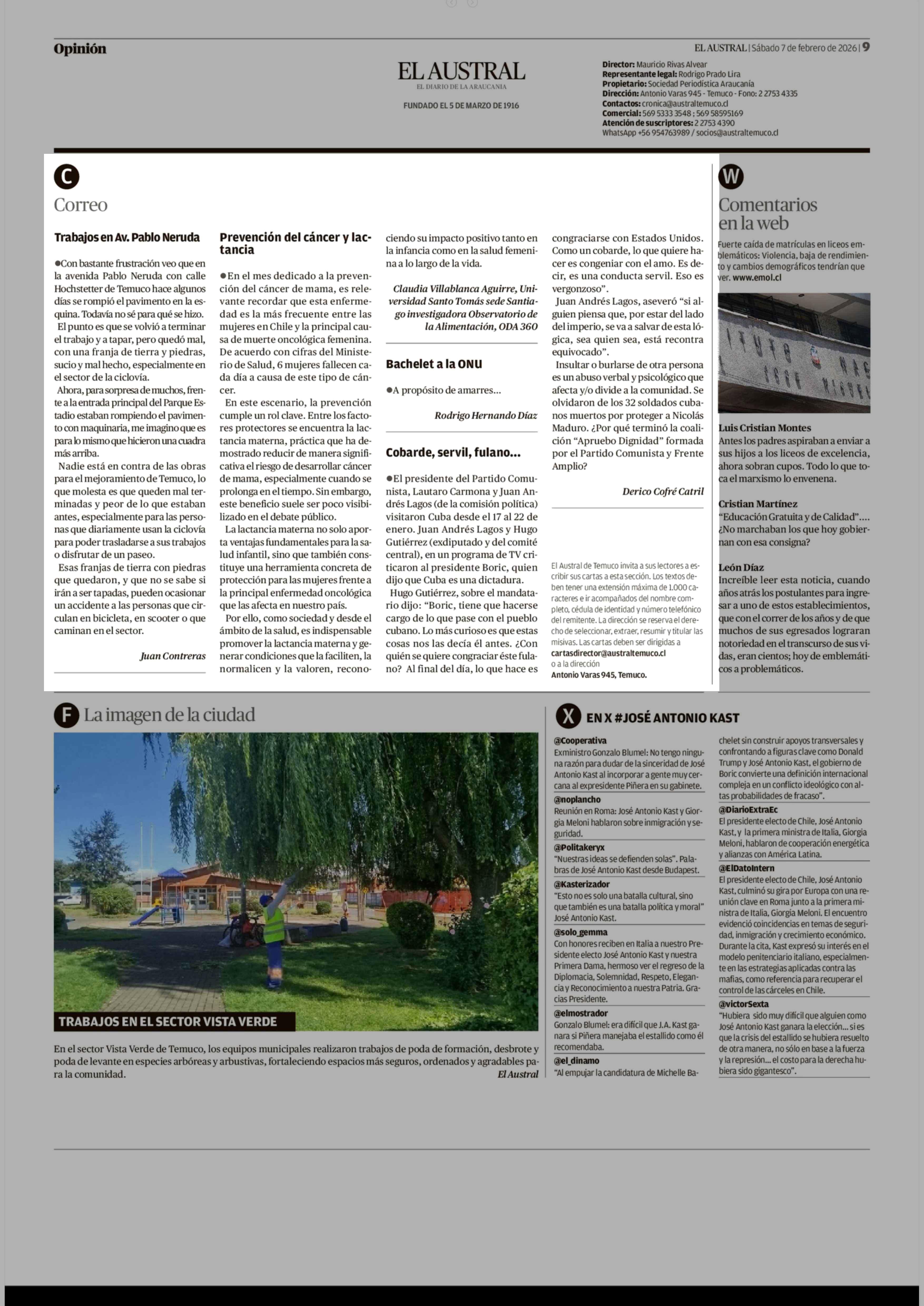 Cartas: Trabajos en Av. Pablo Neruda 07-02-2026 El Austral de la Araucanía |