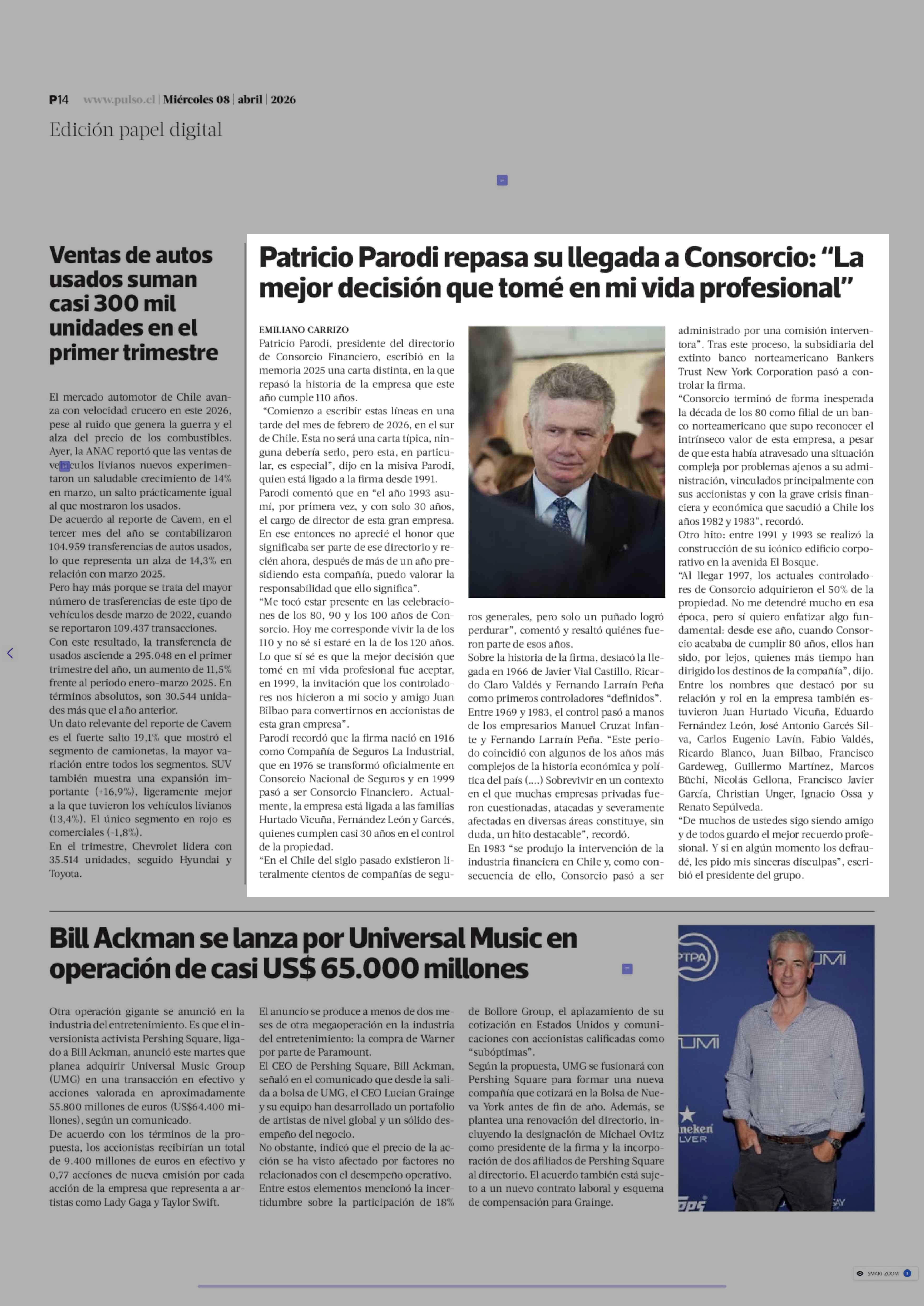 Patricio Parodi repasa su llegada a Consorcio: "La mejor decisión que tomé en mi vida profesional" 08-04-2026 La Tercera |