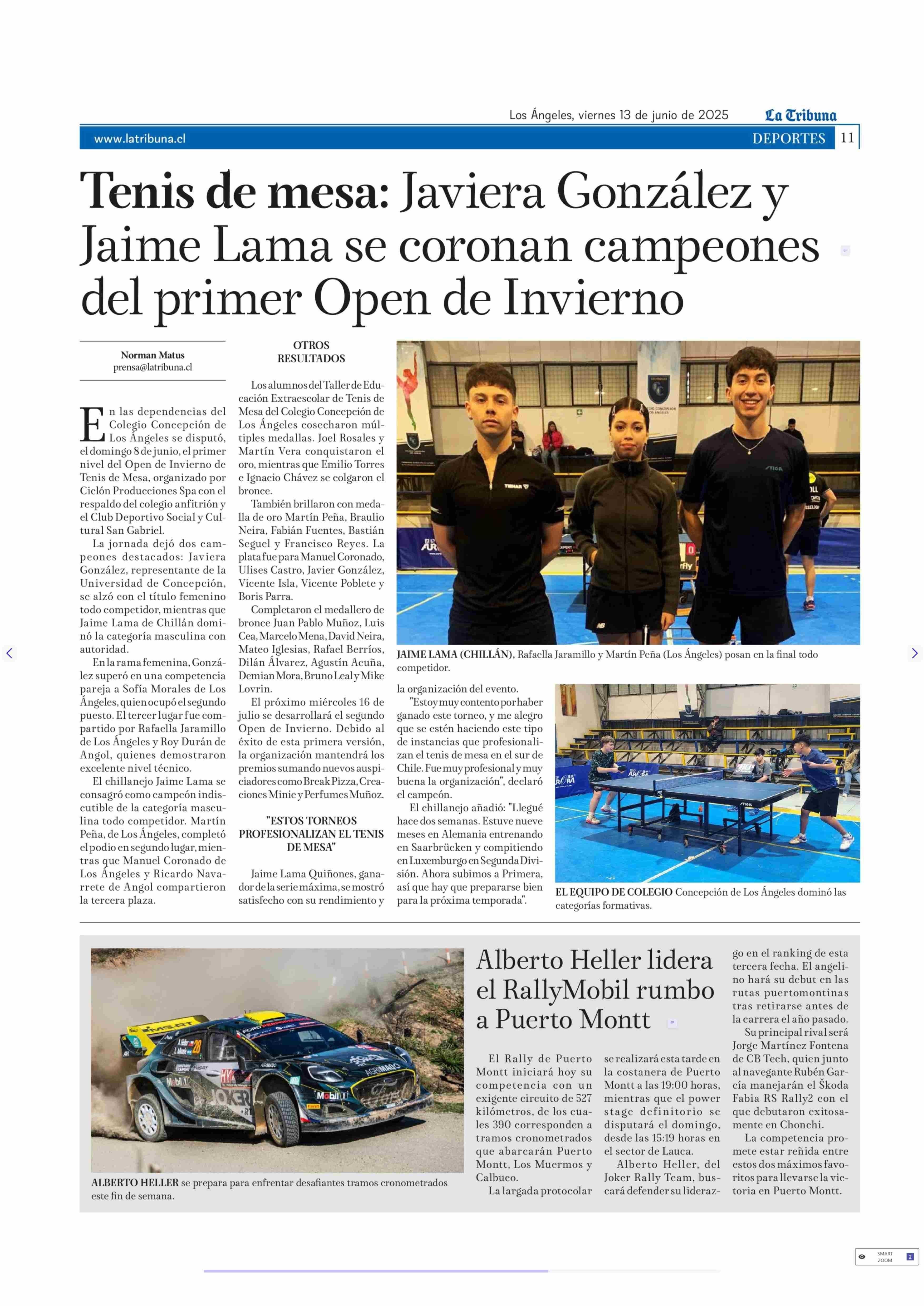 Tenis de mesa: Javiera González y Jaime Lama se coronan campeones del primer Open de Invierno 13-06-2025 La Tribuna |
