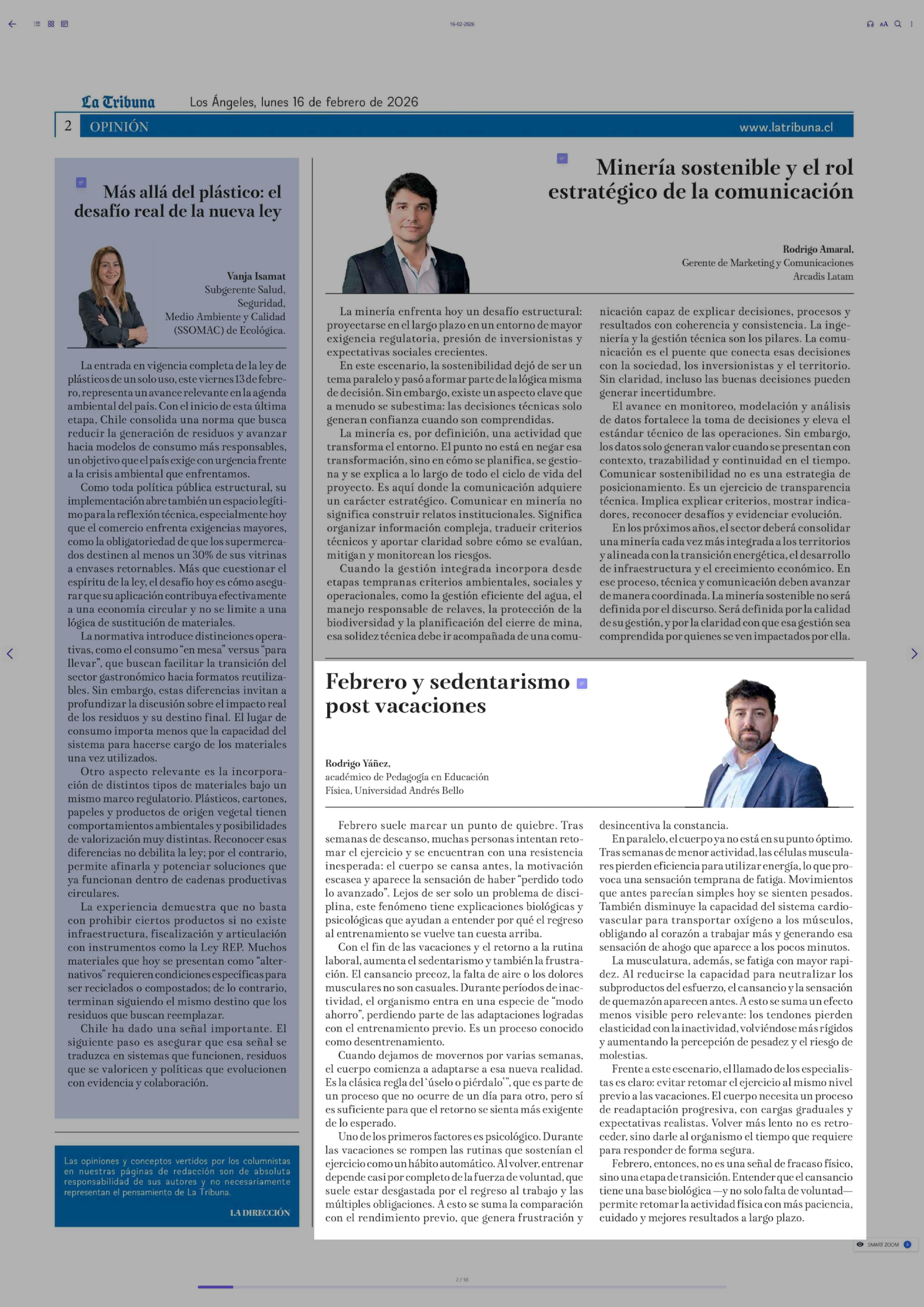 Columnas de Opinión: Febrero y sedentarismo post vacaciones 16-02-2026 La Tribuna |