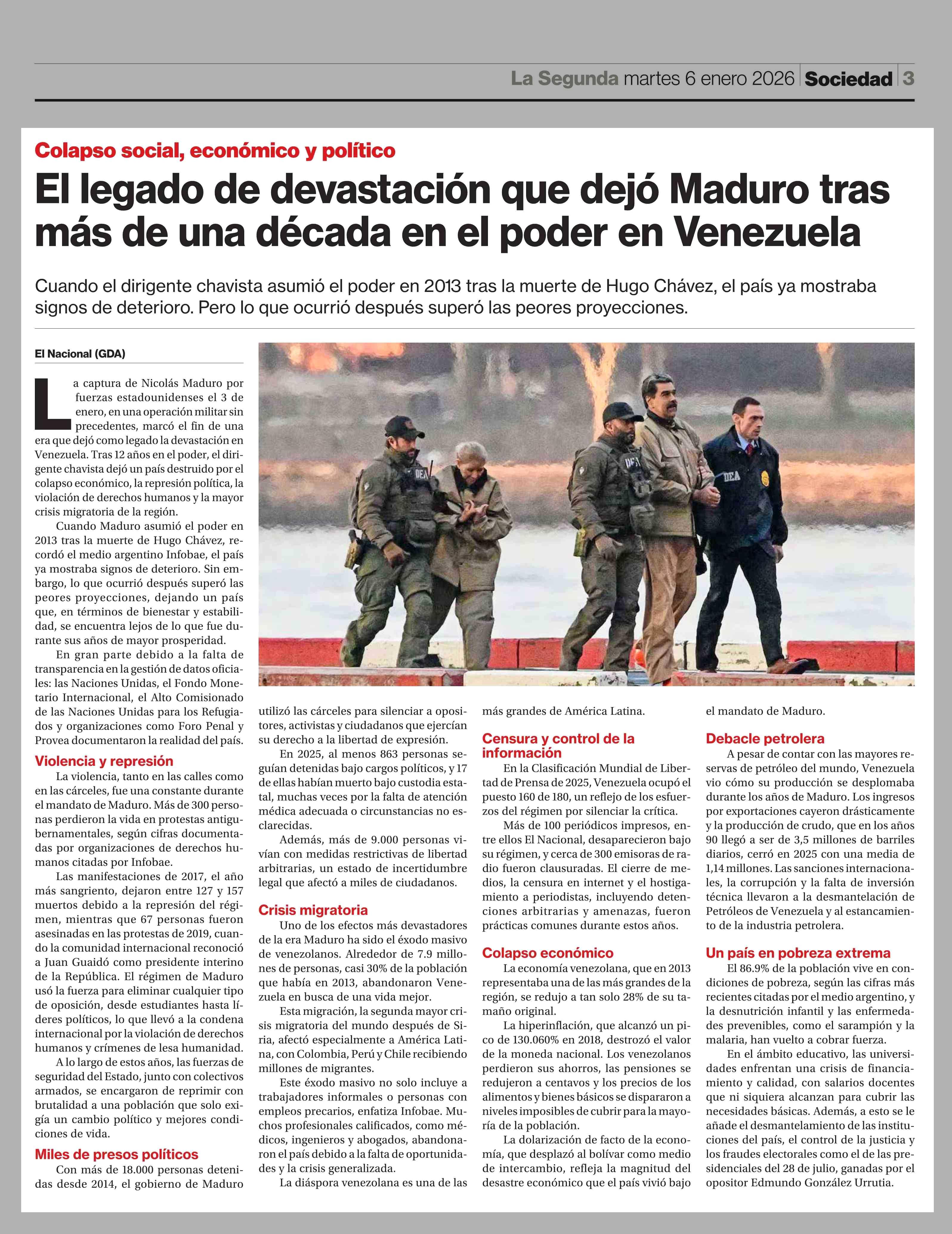 El legado de devastación que dejó Maduro tras más de una década en el poder en Venezuela 06-01-2026 La Segunda |