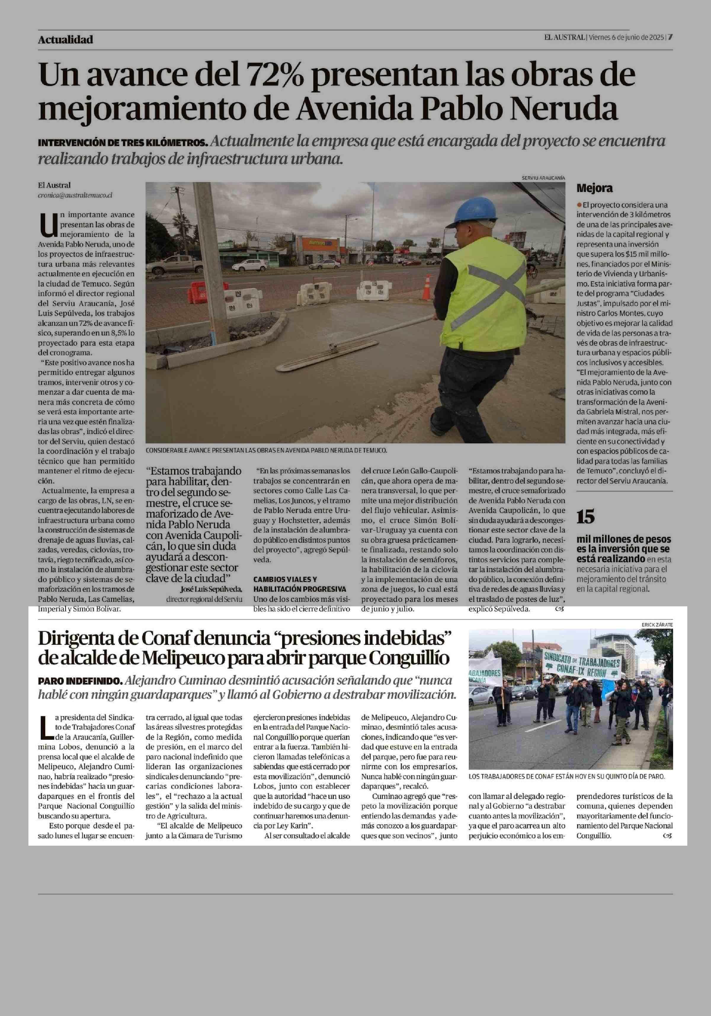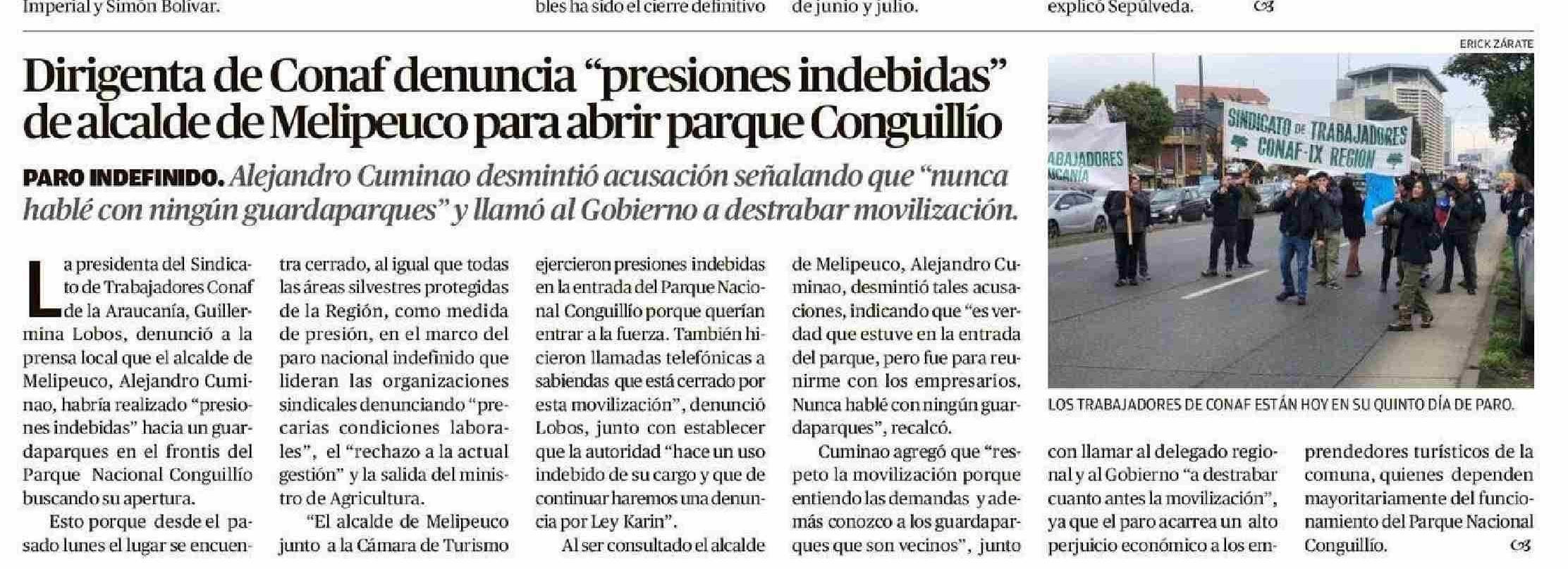 Dirigenta de Conaf denuncia “presiones indebidas” de alcalde de Melipeuco para abrir parque Conguillío 06-06-2025 El Austral de la Araucanía |