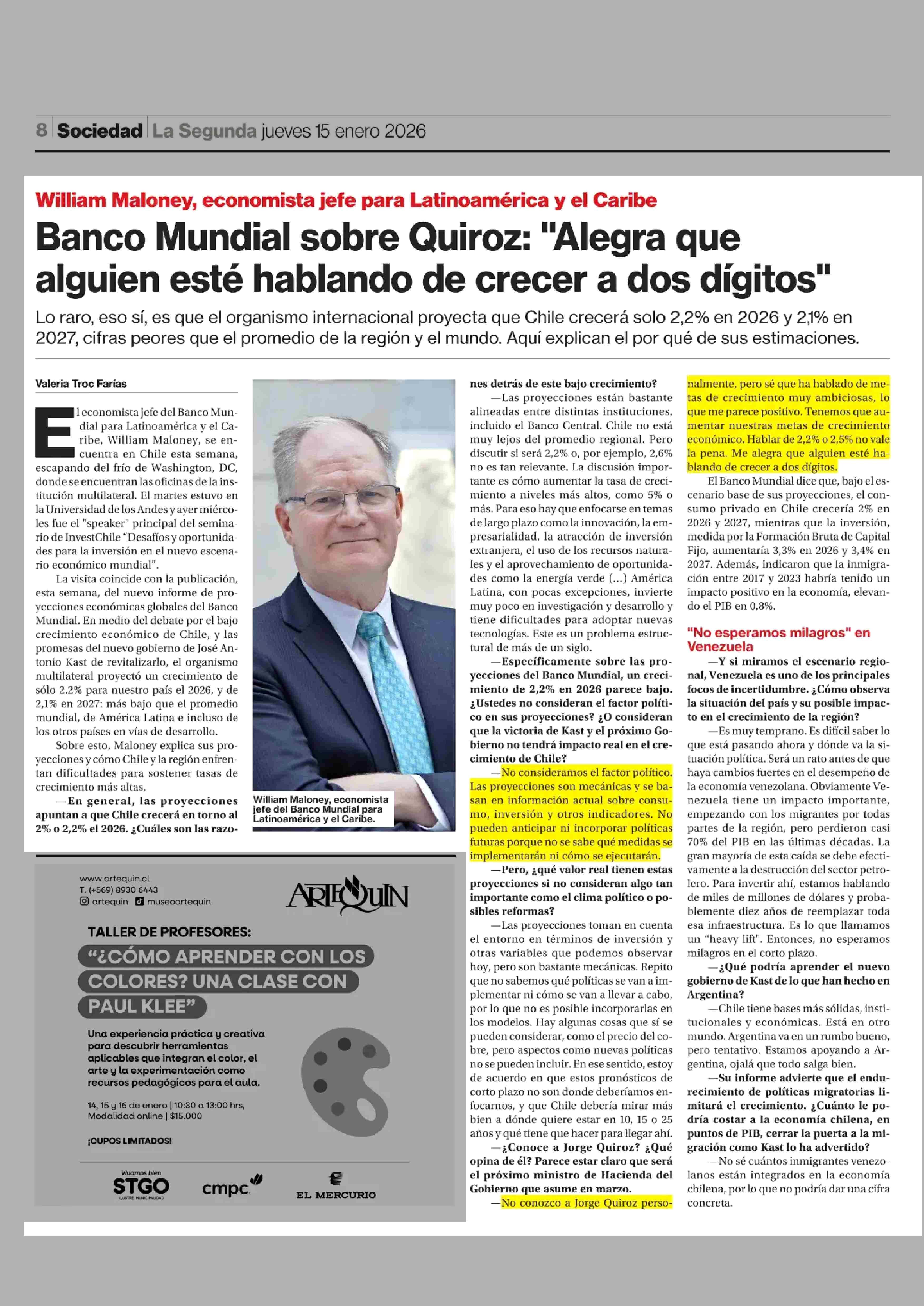 Banco Mundial sobre Quiroz: "Alegra que alguien esté hablando de crecer a dos dígitos 15-01-2026 La Segunda |