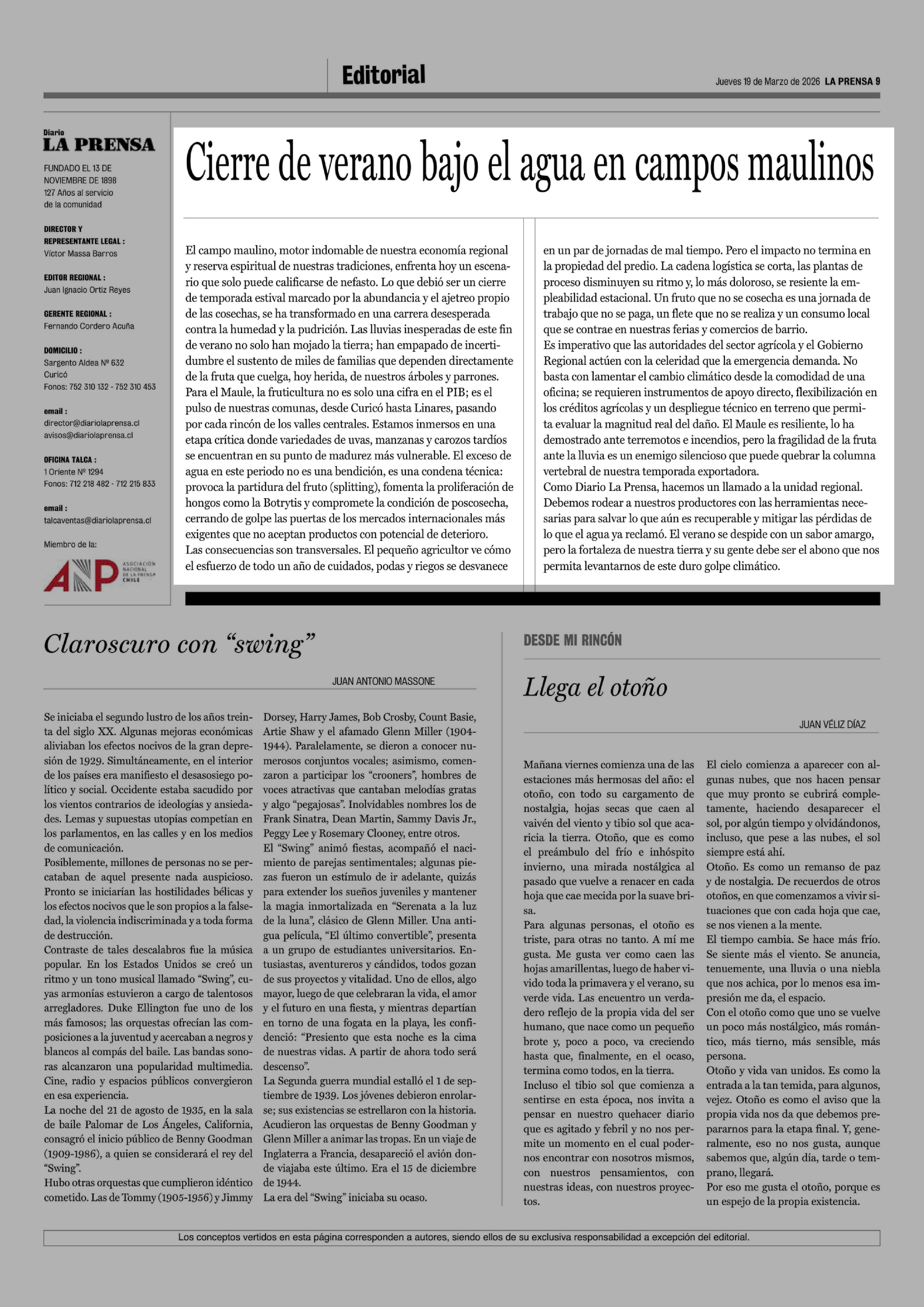Editorial: Cierre de verano bajo el agua en campos maulinos 19-03-2026 La Prensa de Curicó |