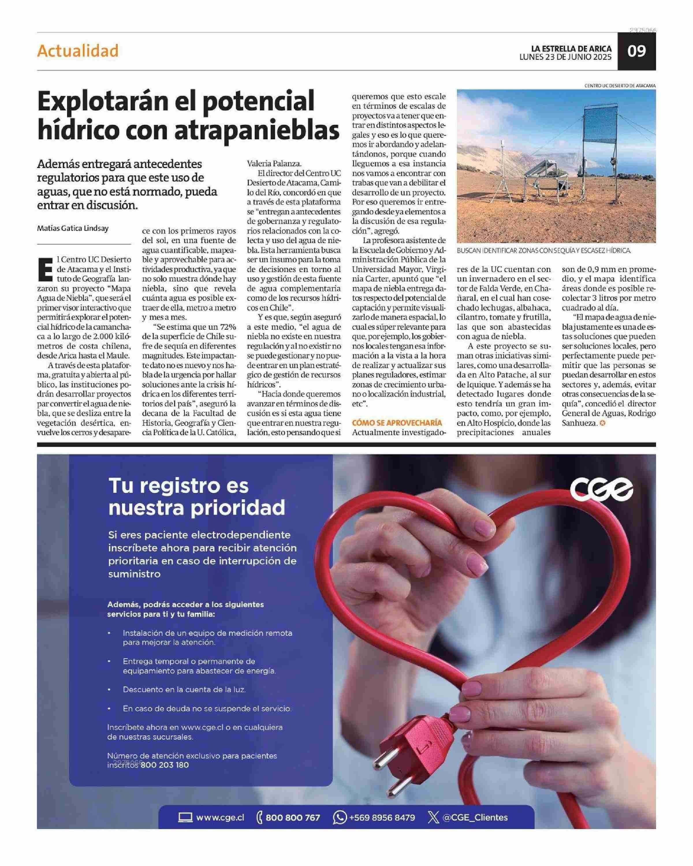 Explotarán el potencial hídrico con atrapanieblas 23-06-2025 La Estrella de Arica |