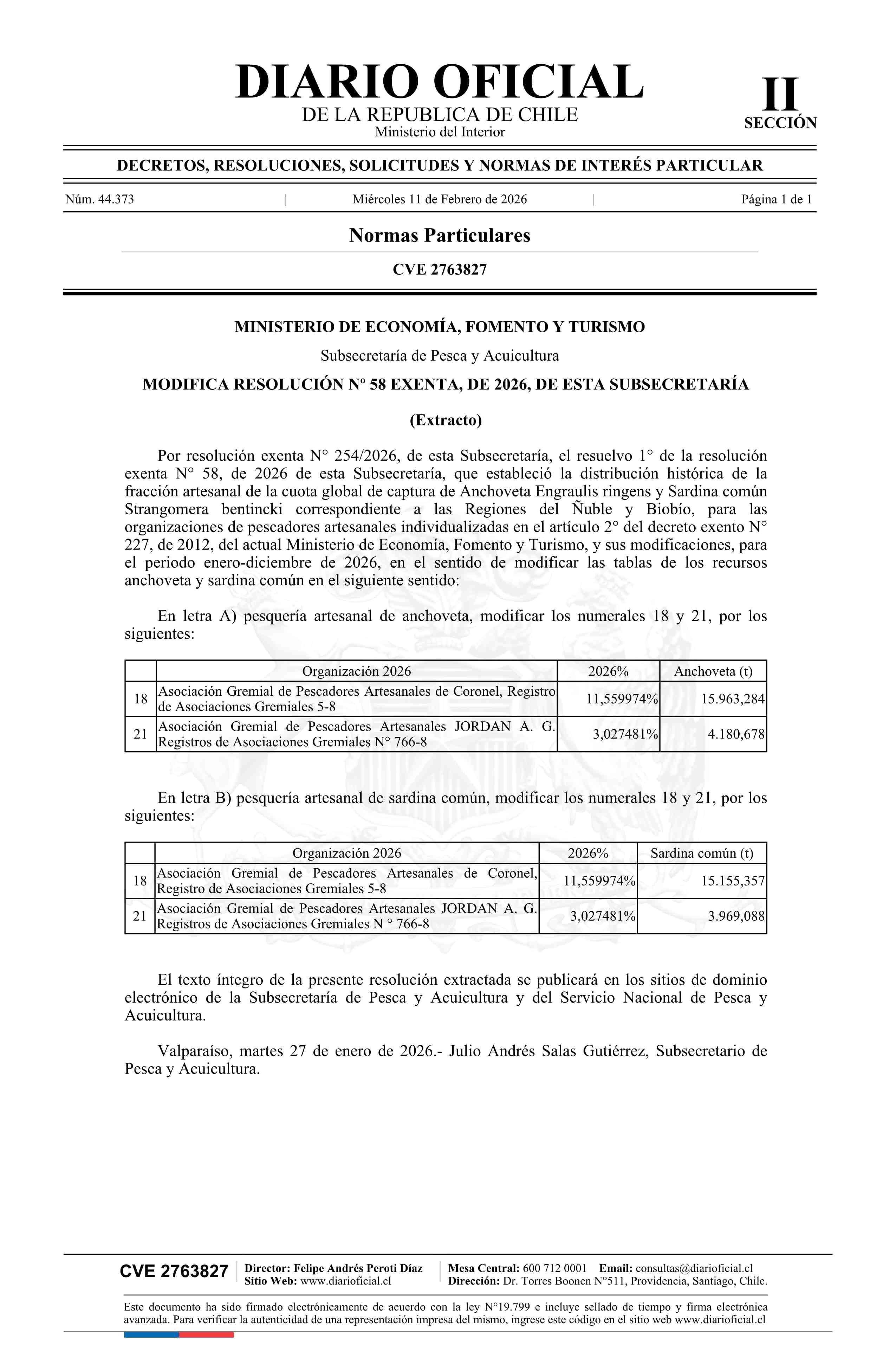Extracto de resolución exenta número 254, de 2026.- Modifica resolución N° 58 exenta, de 2026 11-02-2026 Diario Oficial Edición Electrónica |