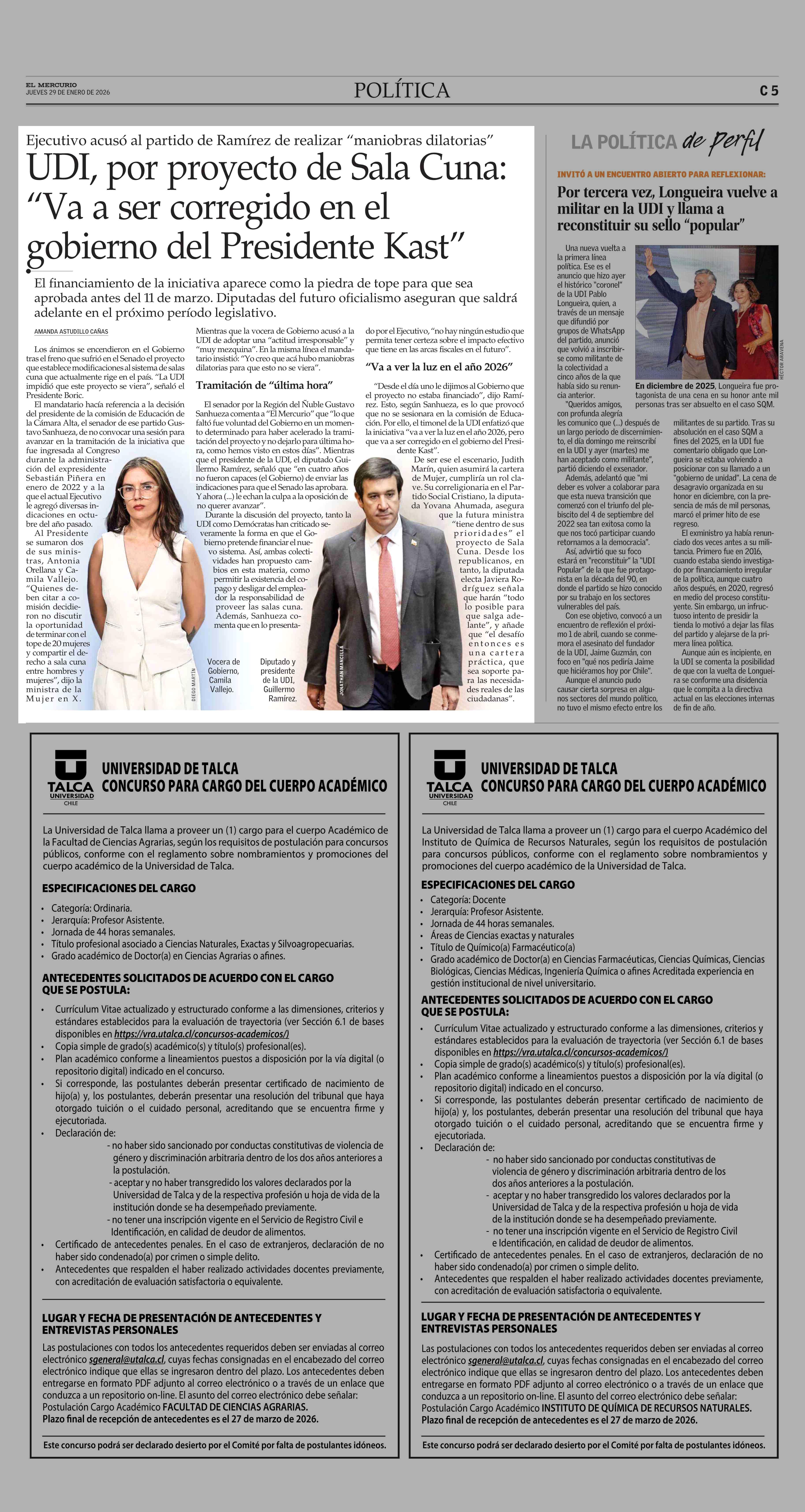 UDI, por proyecto de Sala Cuna: “Va a ser corregido en el gobierno del Presidente Kast” 29-01-2026 El Mercurio |