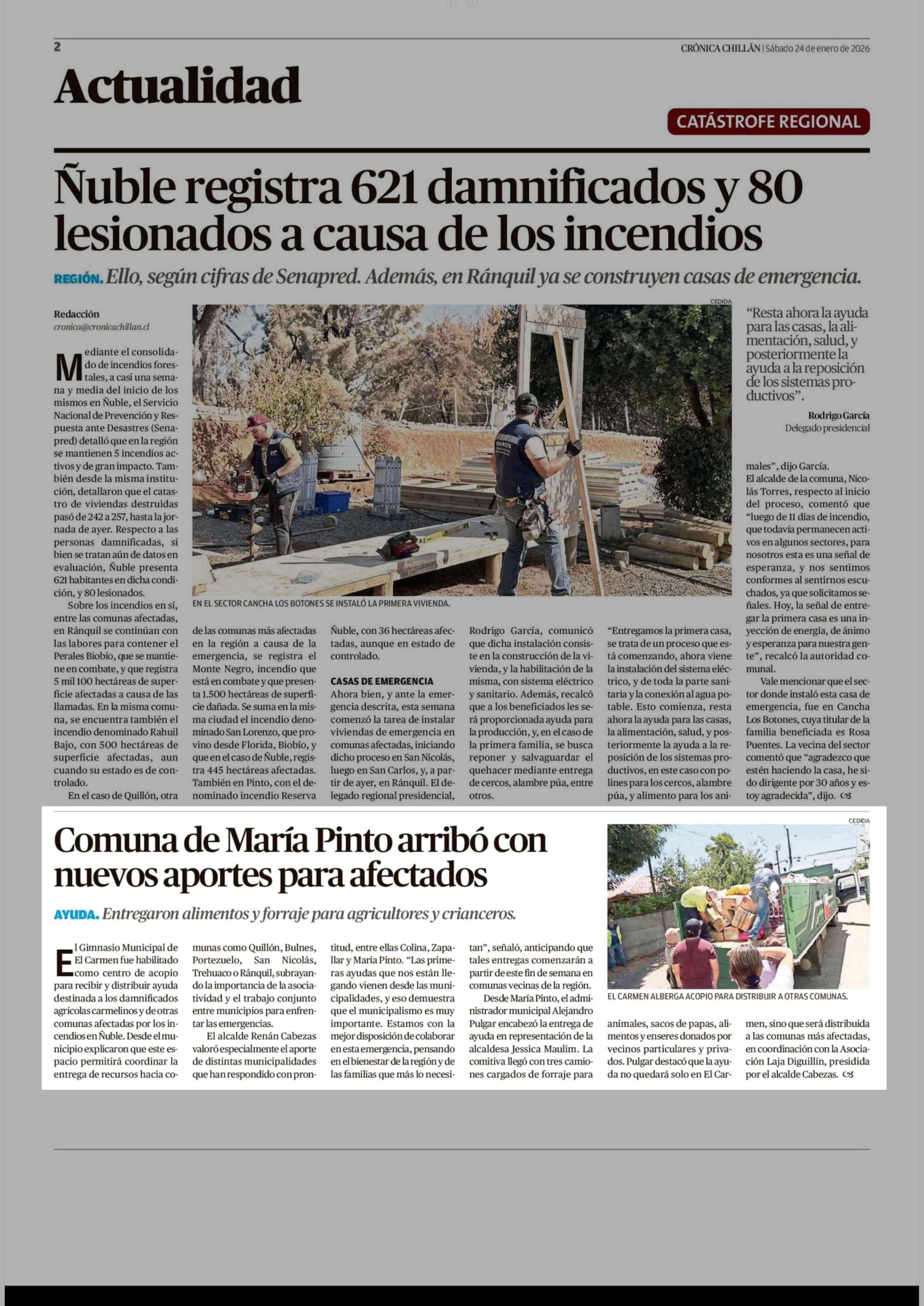 Comuna de María Pinto arribó con nuevos aportes para afectados 24-01-2026 Crónica de Chillán |