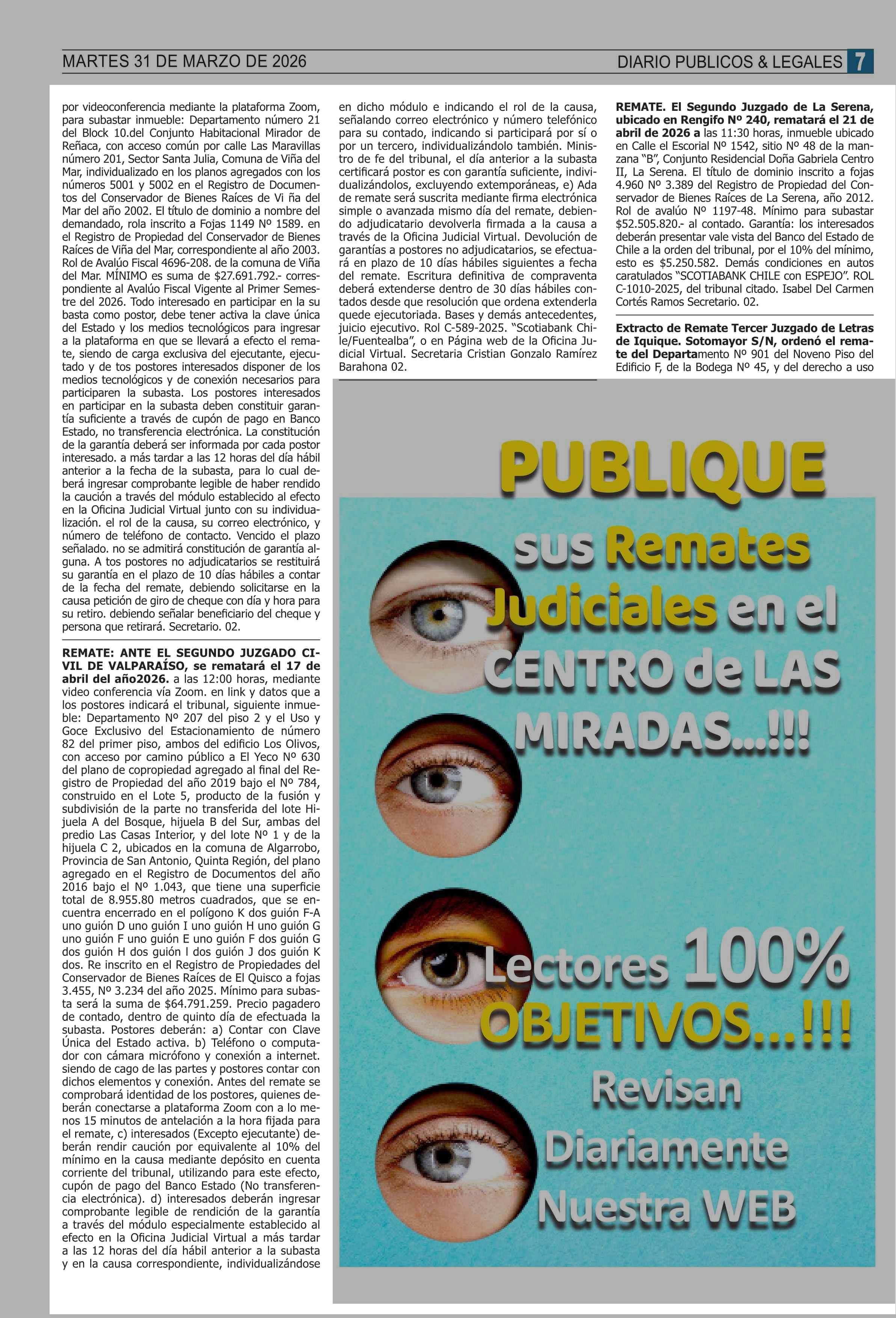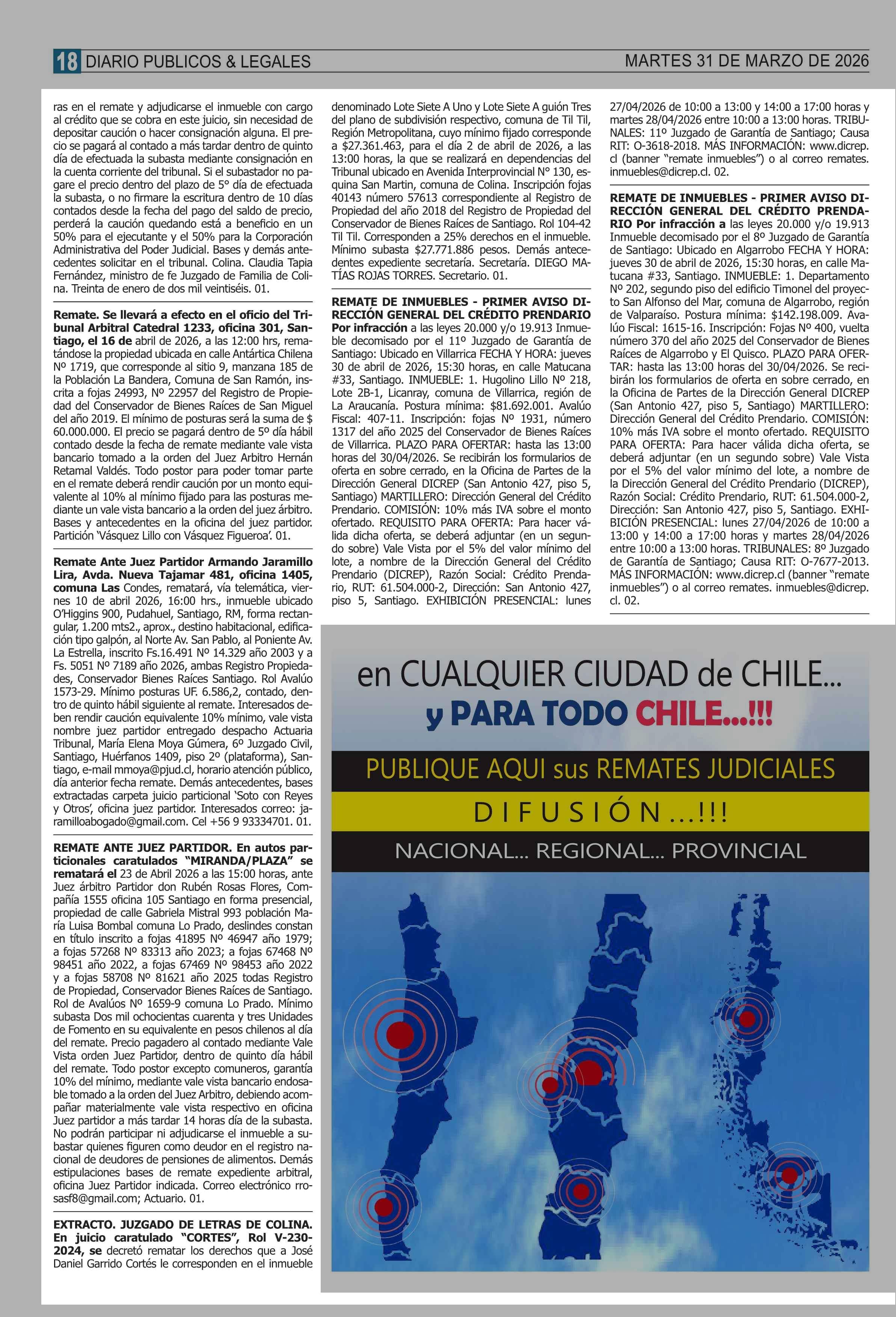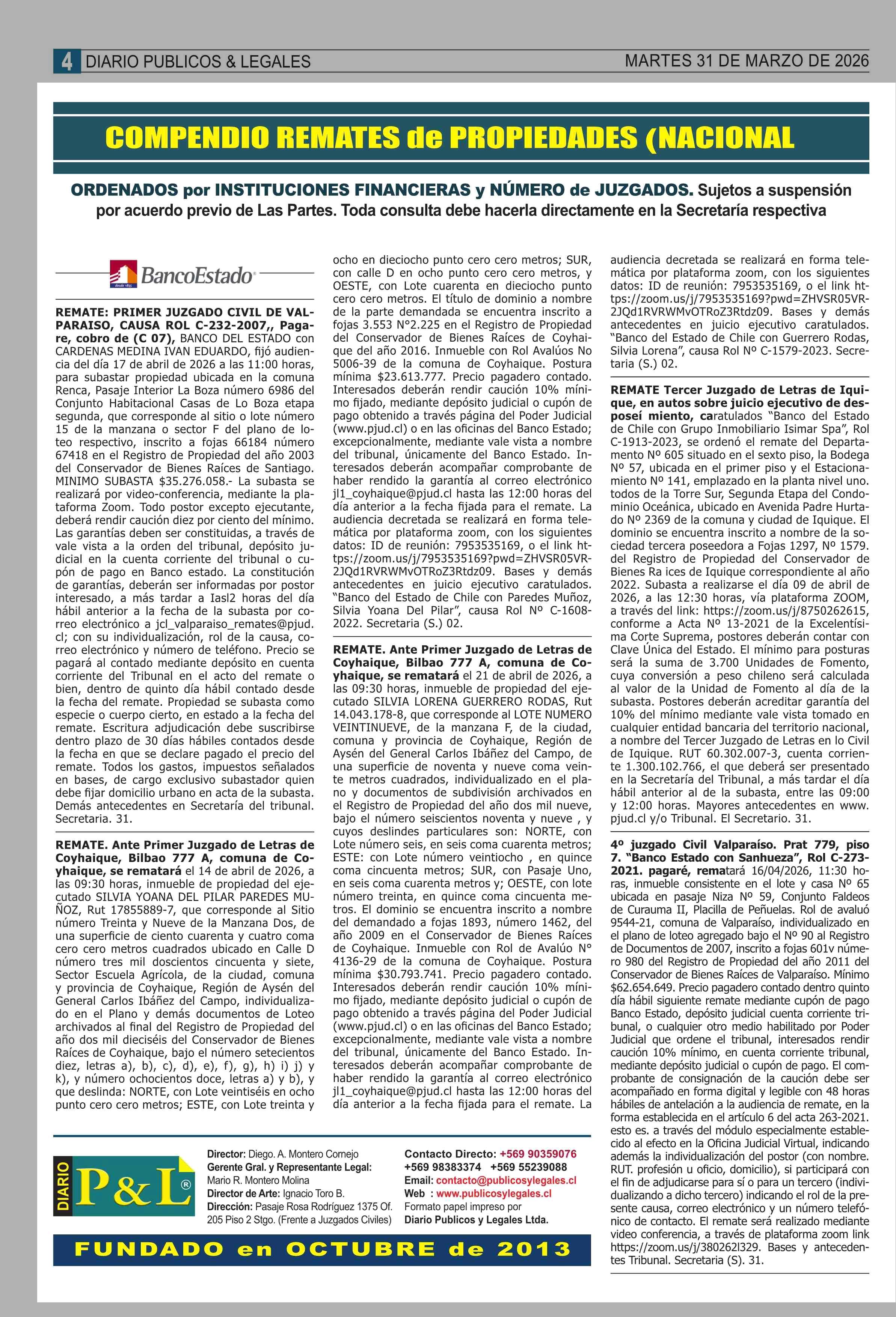 REMATES: COMPENDIO REMATES de PROPIEDADES (NACIONAL 31-03-2026 P&L Públicos y Legales |