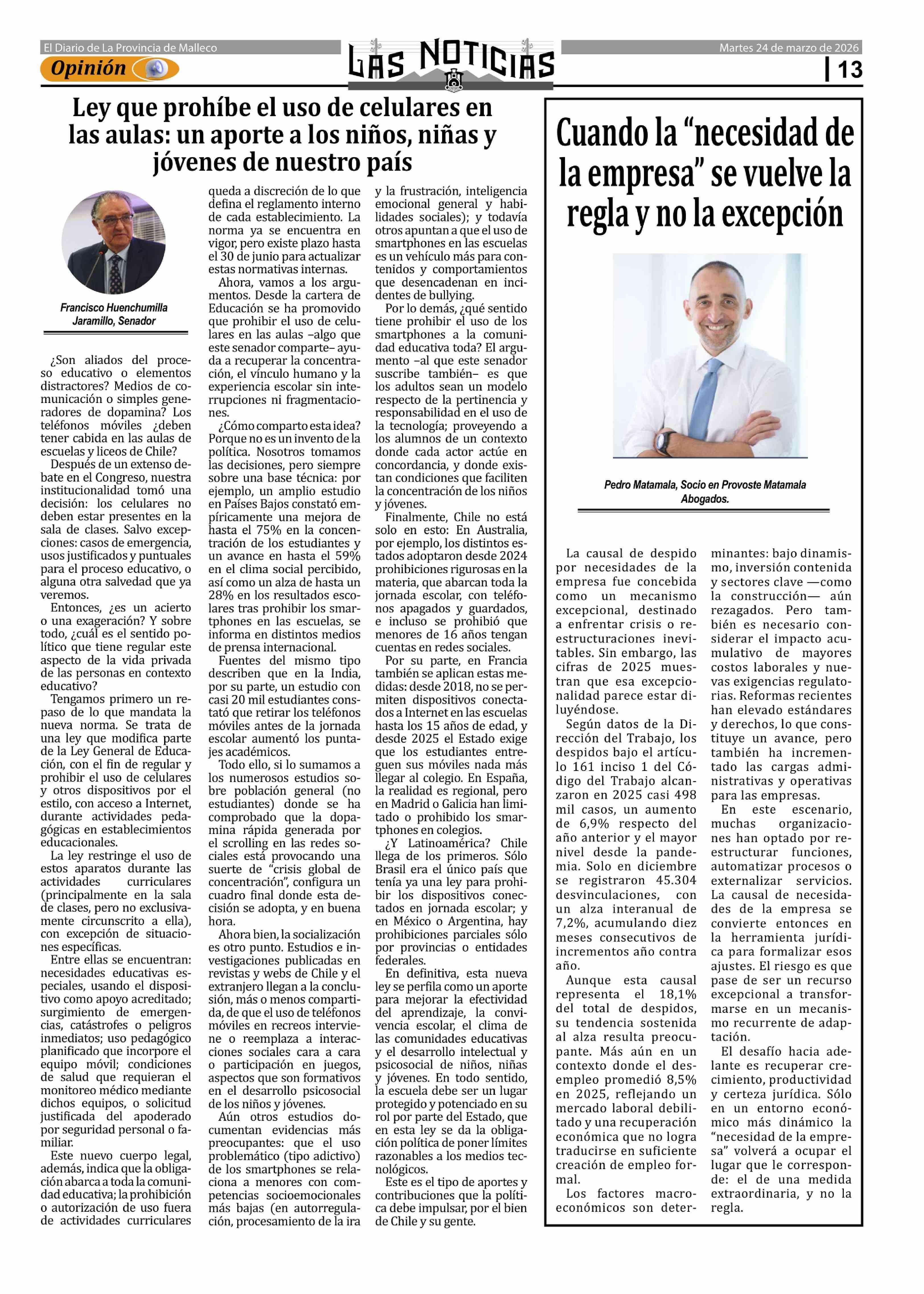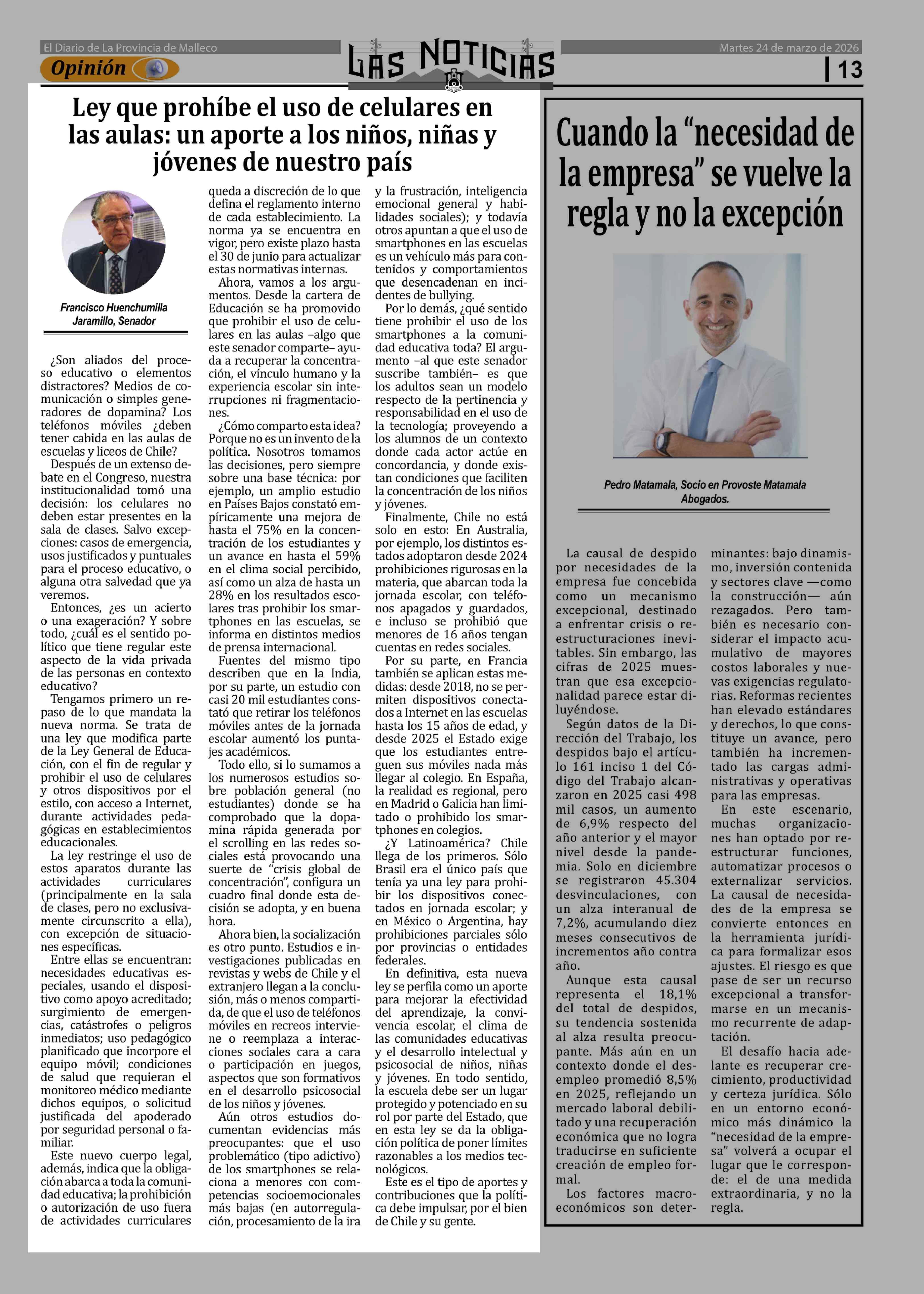 Columnas de Opinión: Ley que prohíbe el uso de celulares en las aulas: un aporte a los niños, niñas y jóvenes de nuestro país 24-03-2026 Las Noticias |