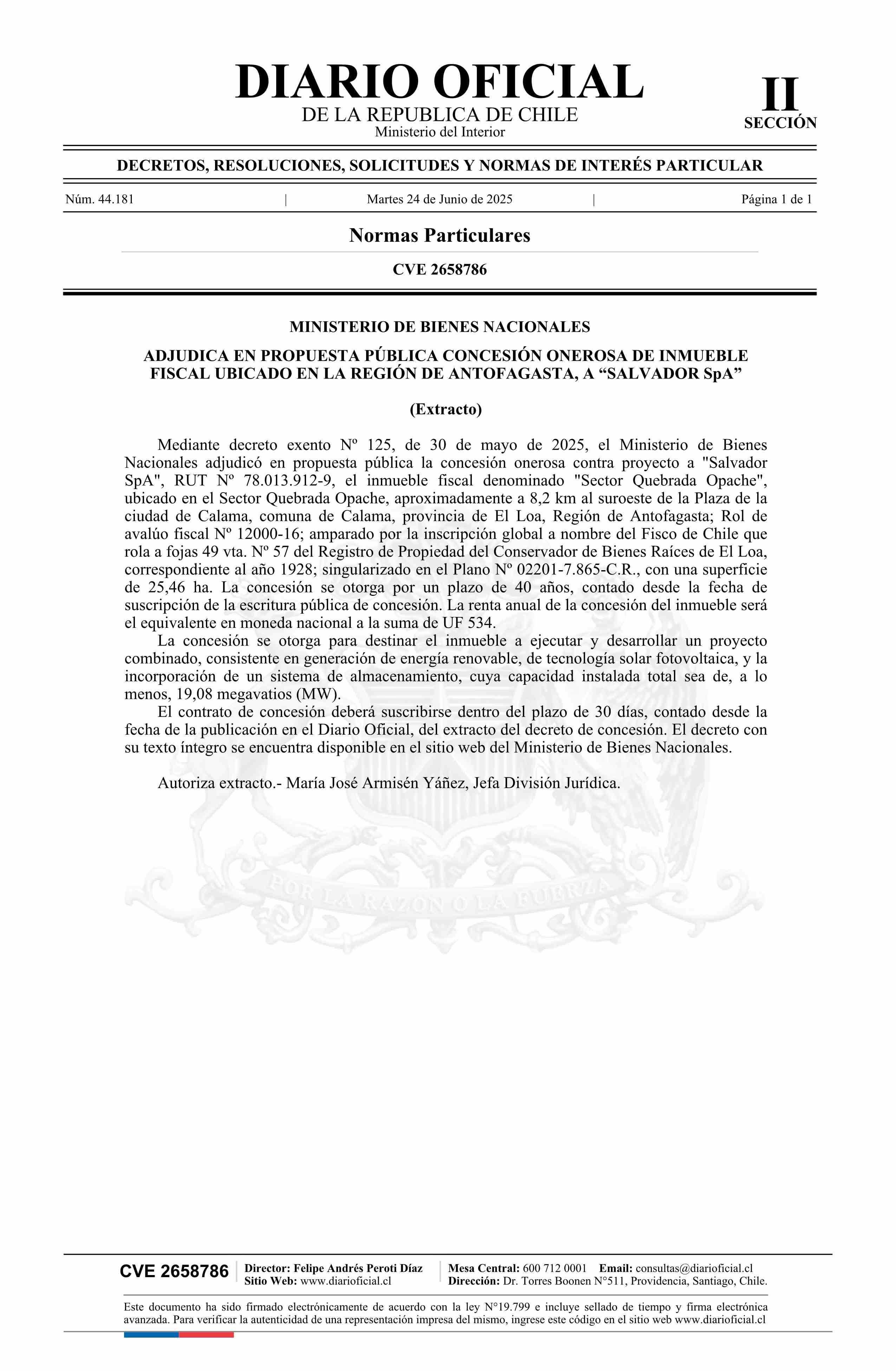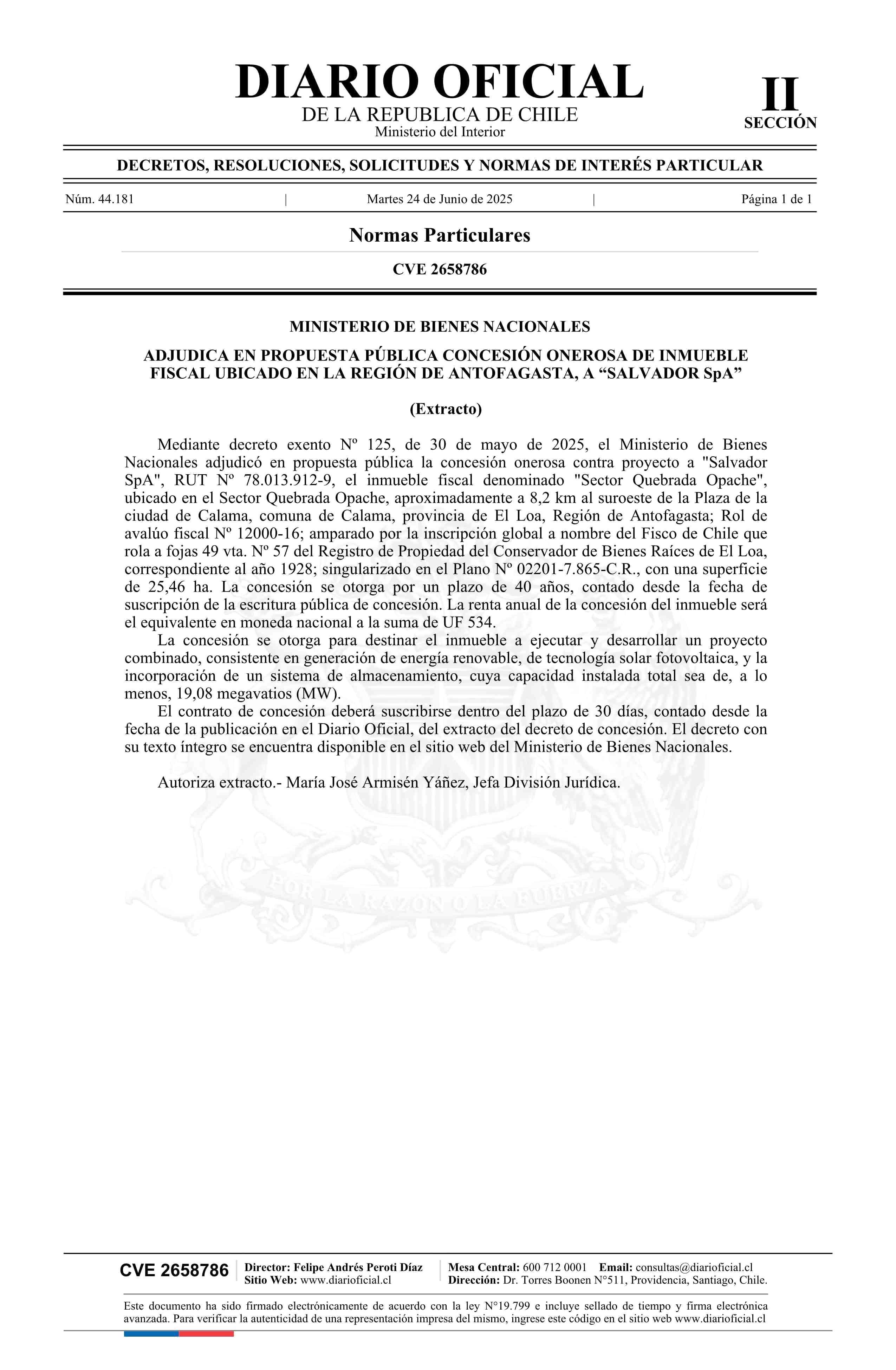 | Título: | Extracto de decreto exento número 125, de 2025.- Adjudica en propuesta pública concesión onerosa de inmueble fiscal ubicado en la Región de Antofagasta, a Salvador SpA |