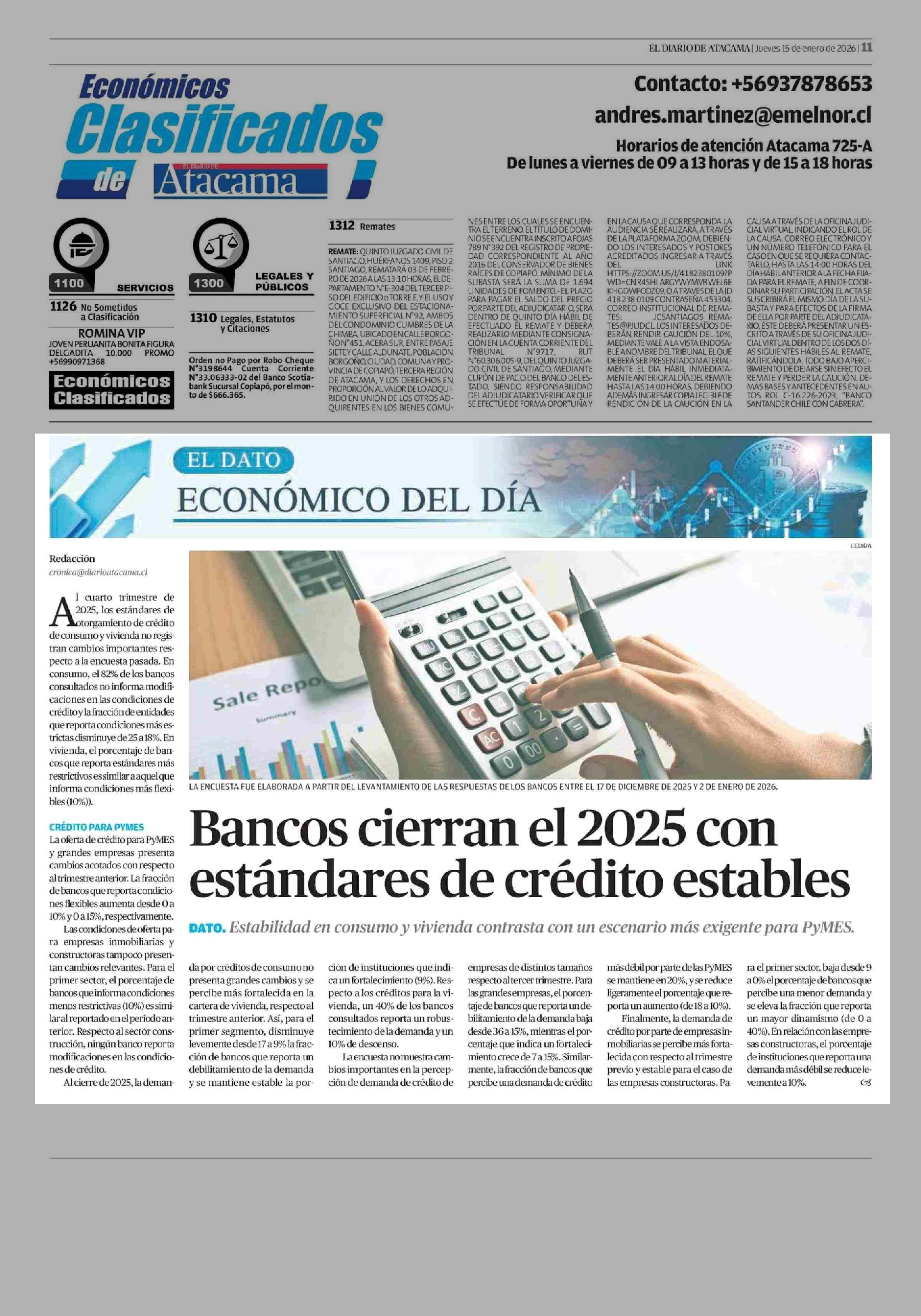Bancos cierran el 2025 con estándares de crédito estables 15-01-2026 El Diario de Atacama |