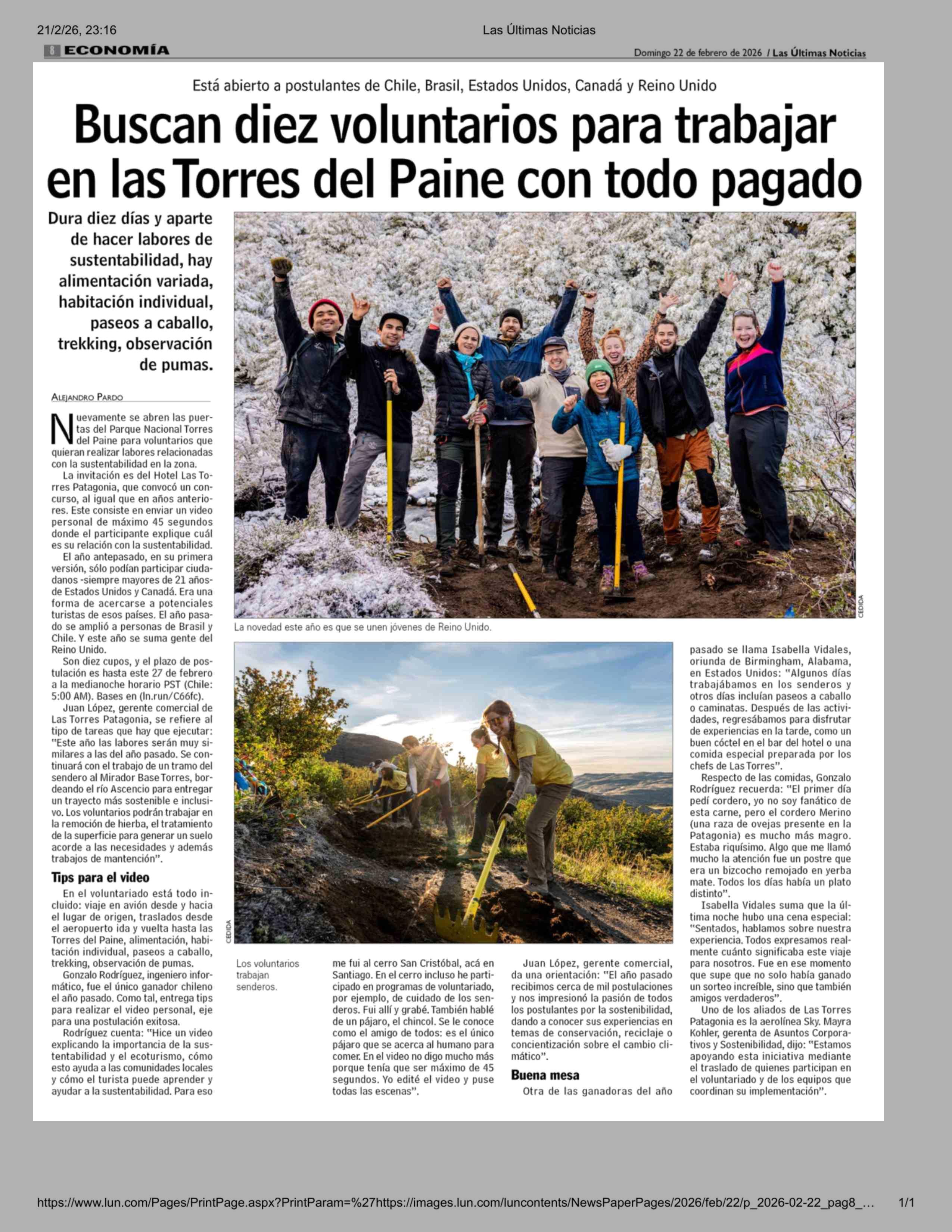 Buscan diez voluntarios para trabajar en las Torres del Paine con todo pagado 22-02-2026 Las Últimas Noticias |