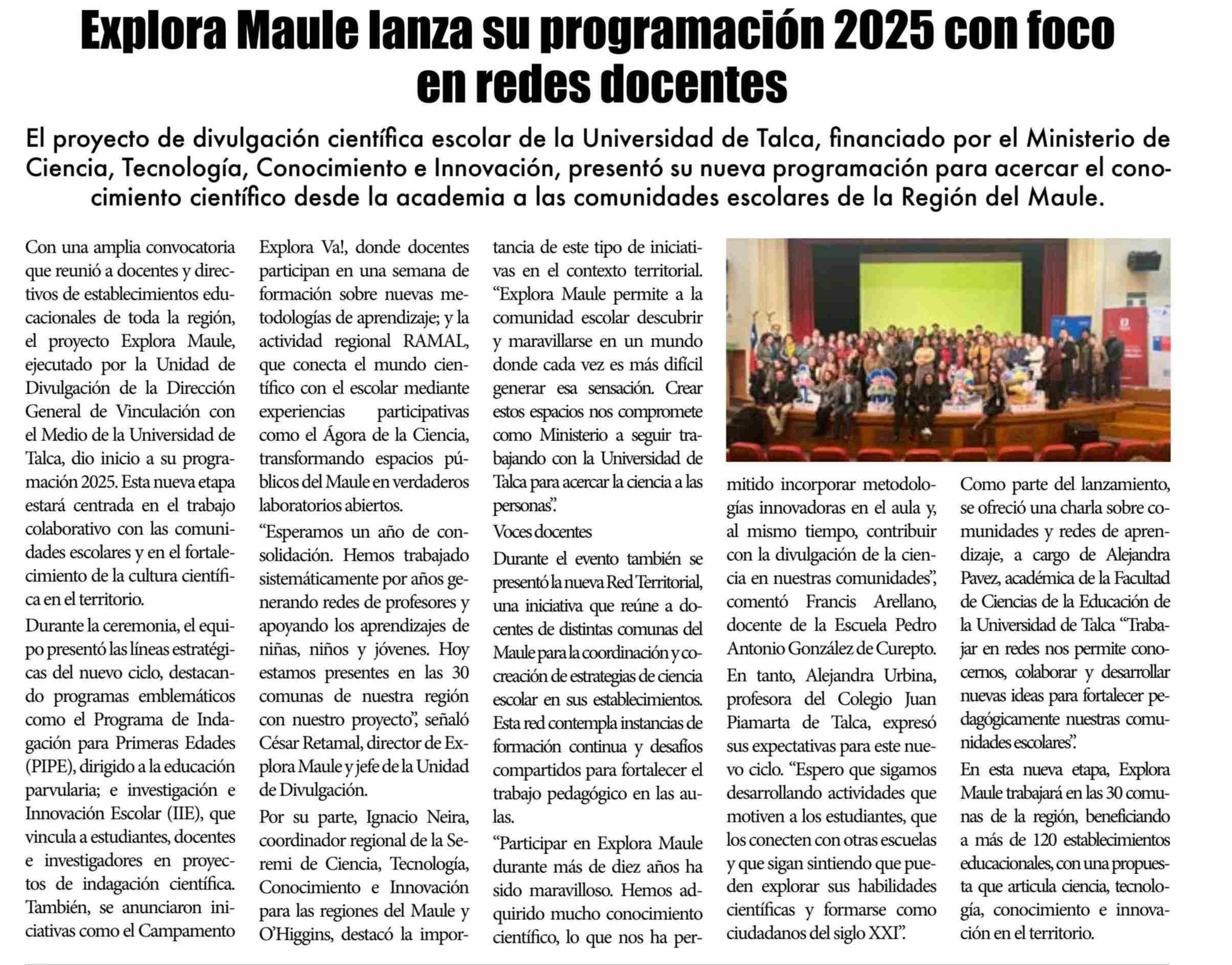 | Título: | Explora Maule lanza su programación 2025 con foco en redes docentes |