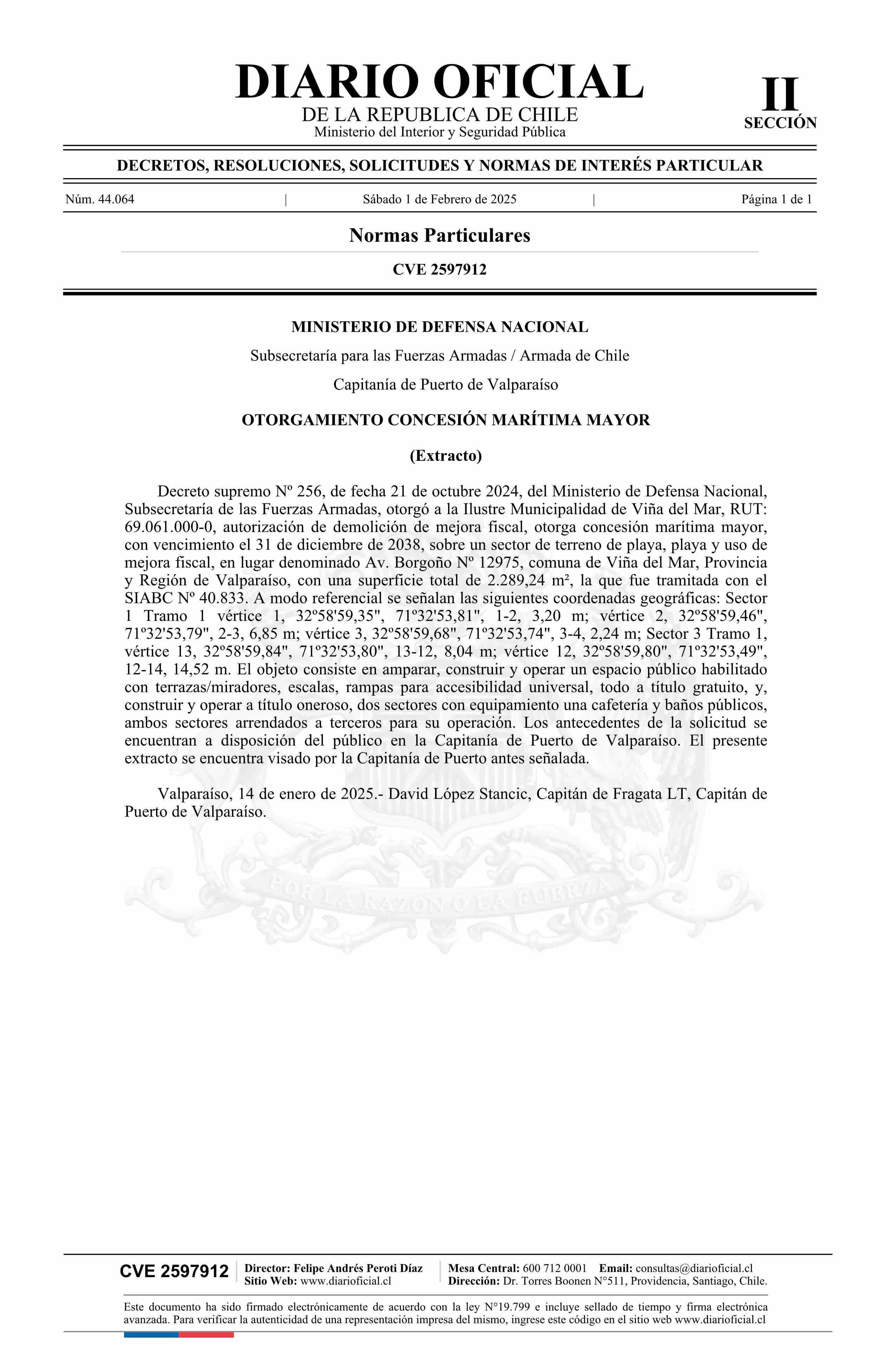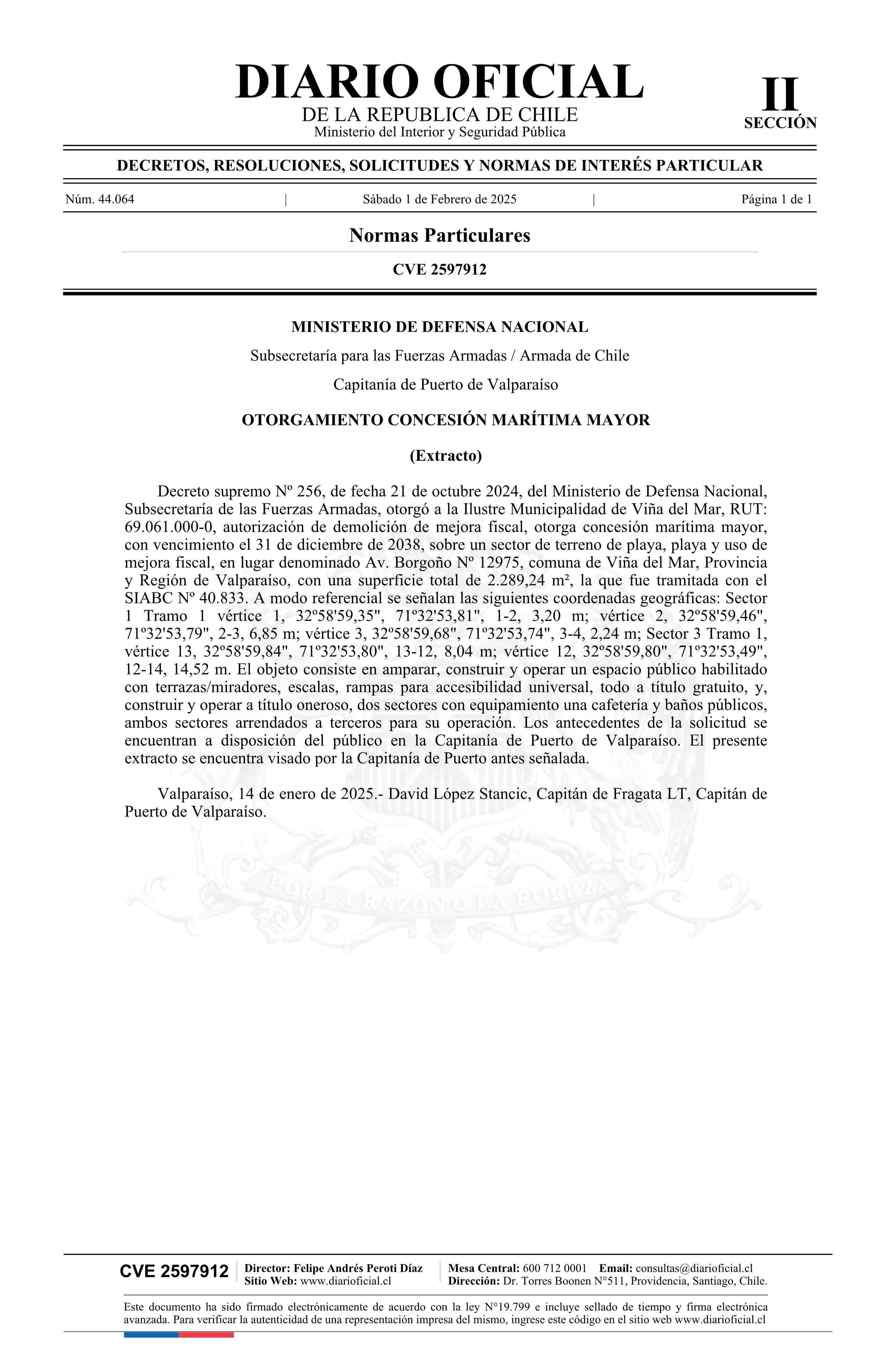 Extracto de decreto número 256, de 2024.- Otorga concesión marítima mayor 01-02-2025 Diario Oficial Edición Electrónica |