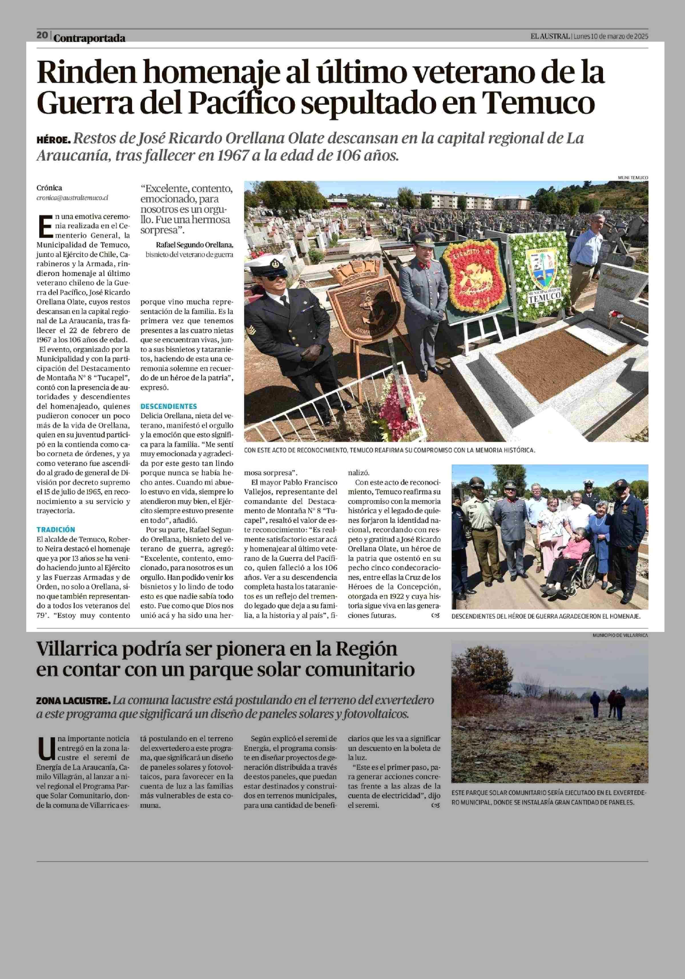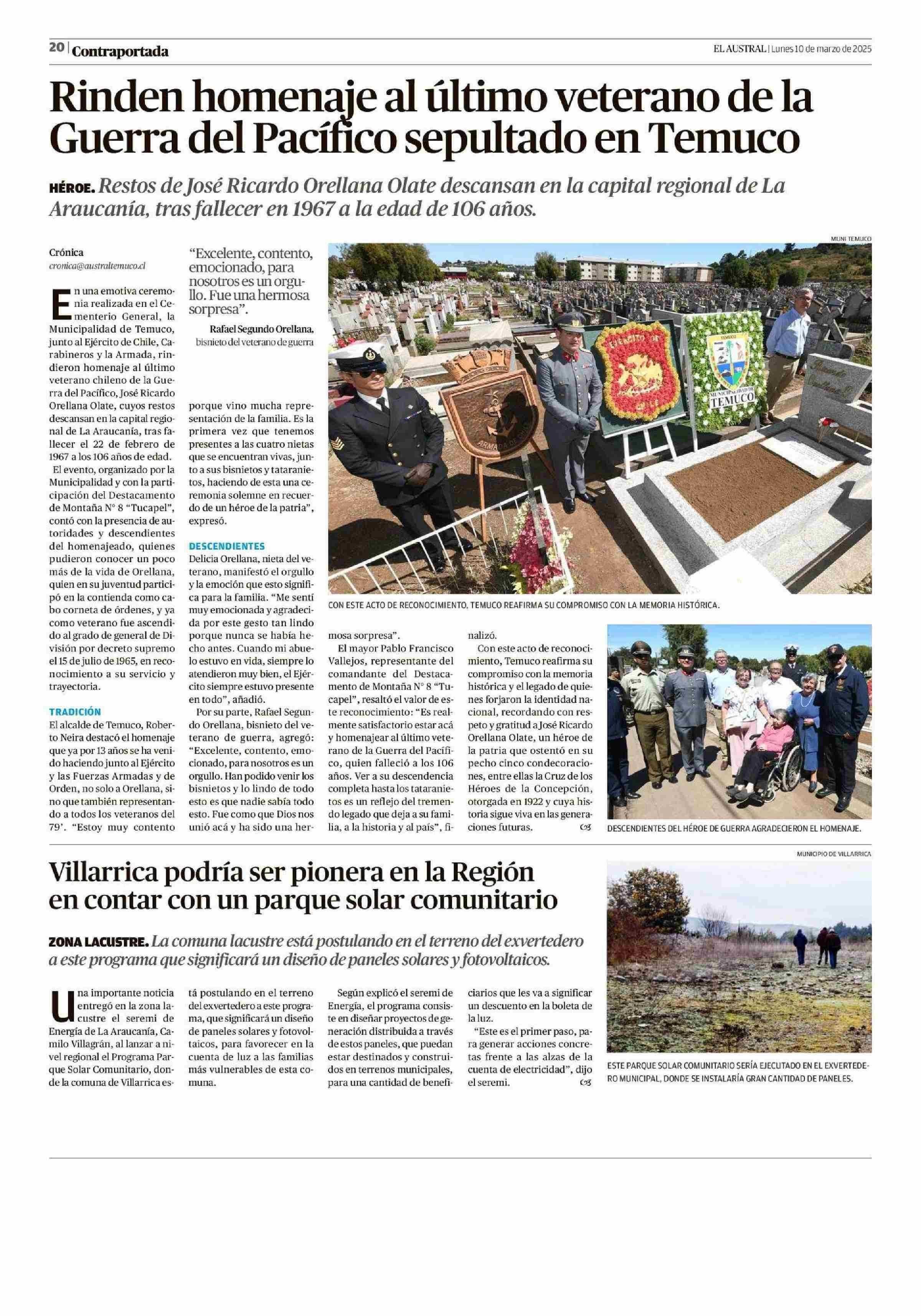 Rinden homenaje al último veterano de la Guerra del Pacífico sepultado en Temuco 10-03-2025 El Austral de la Araucanía |