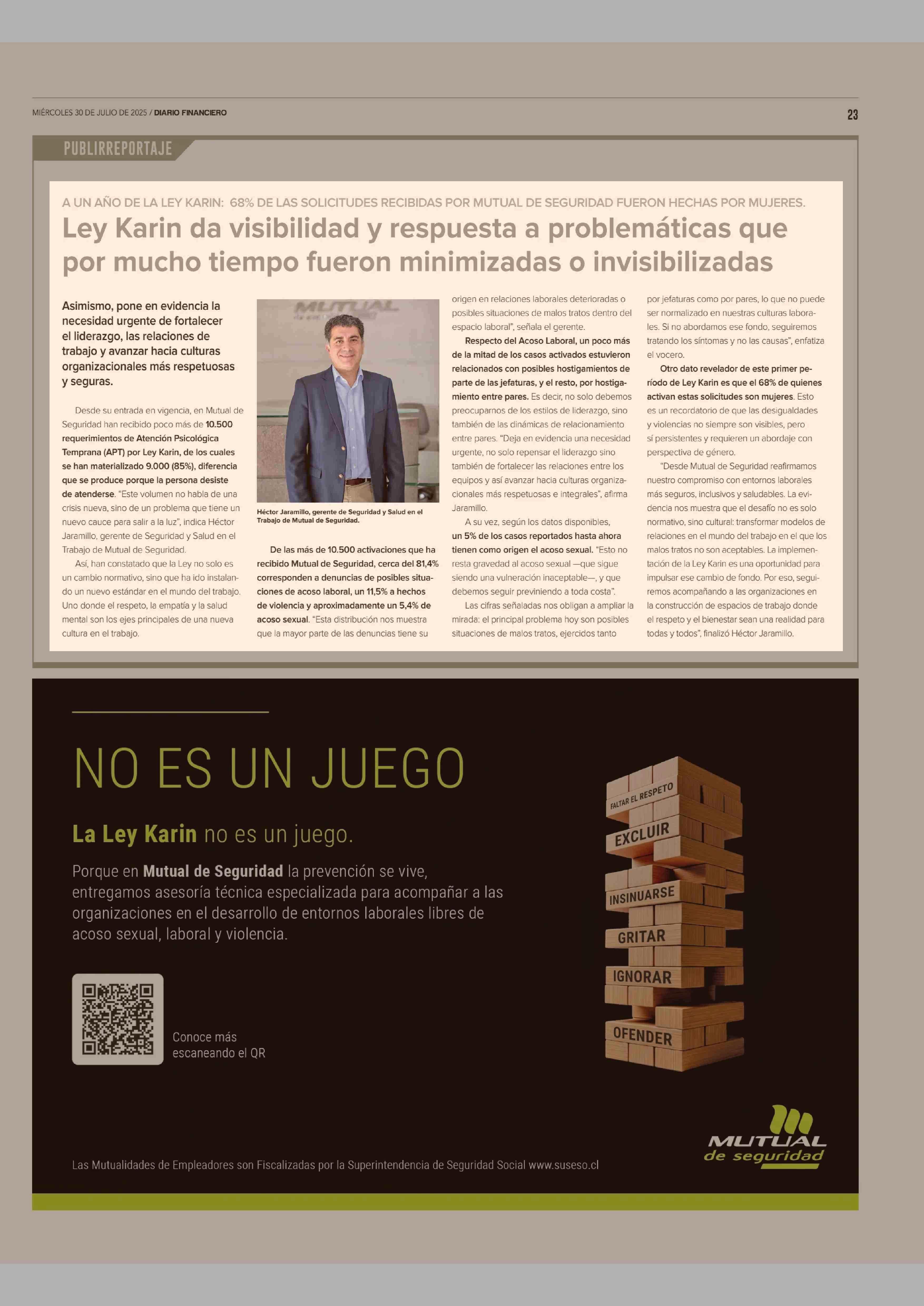Ley Karin da visibilidad y respuesta a problemáticas que por mucho tiempo fueron minimizadas o invisibilizadas 30-07-2025 Diario Financiero |