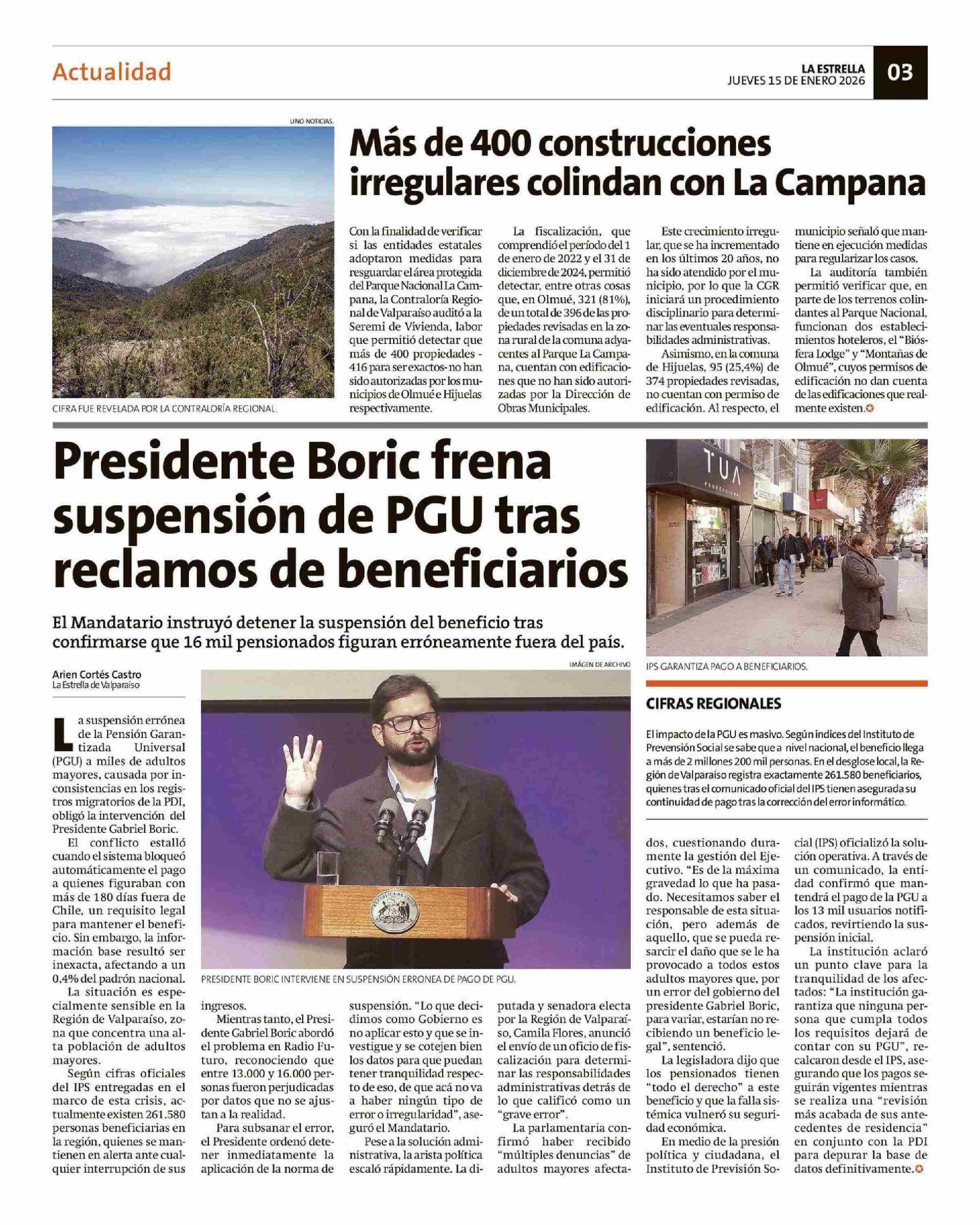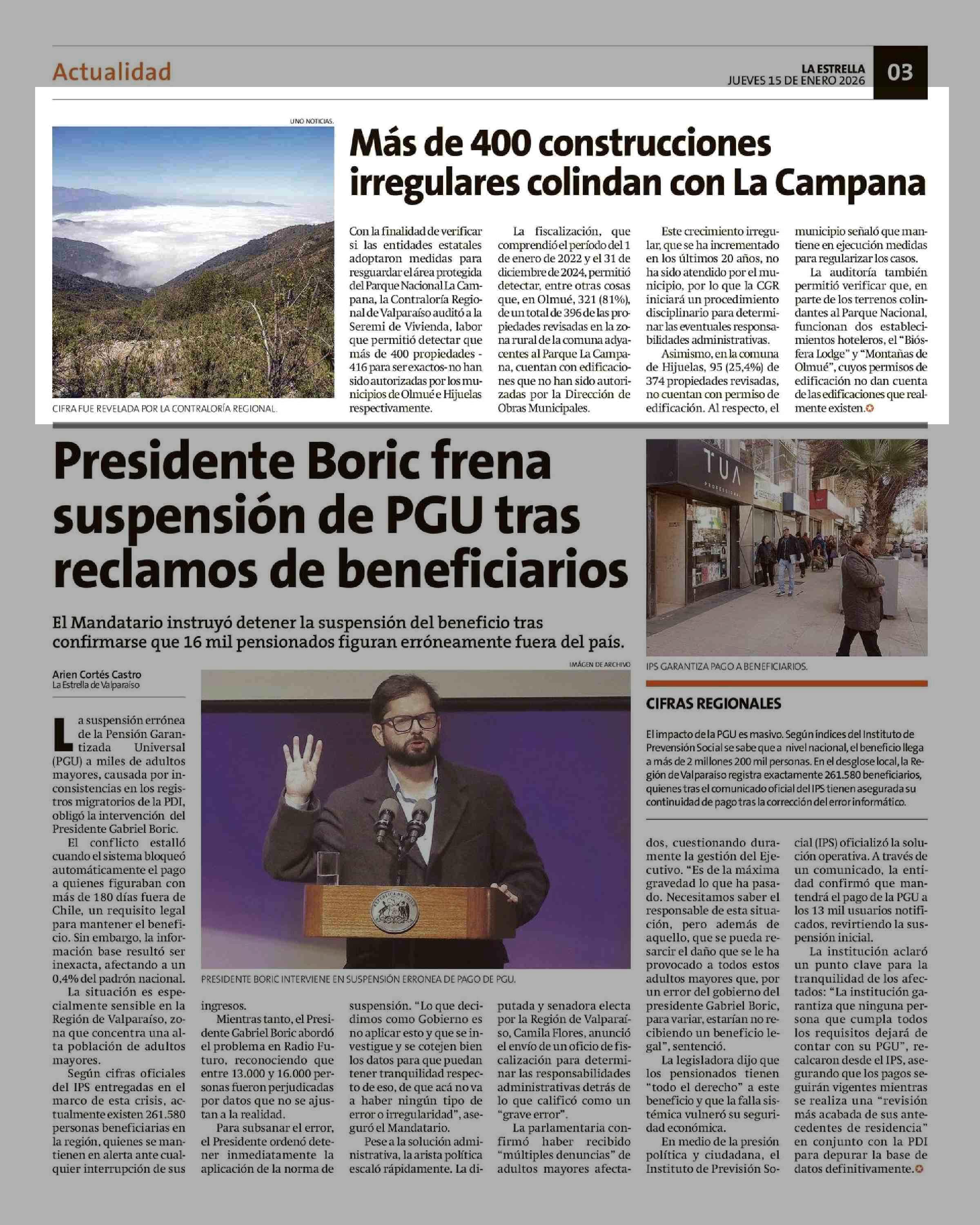 Más de 400 construcciones irregulares colindan con La Campana 15-01-2026 La Estrella de Valparaíso |