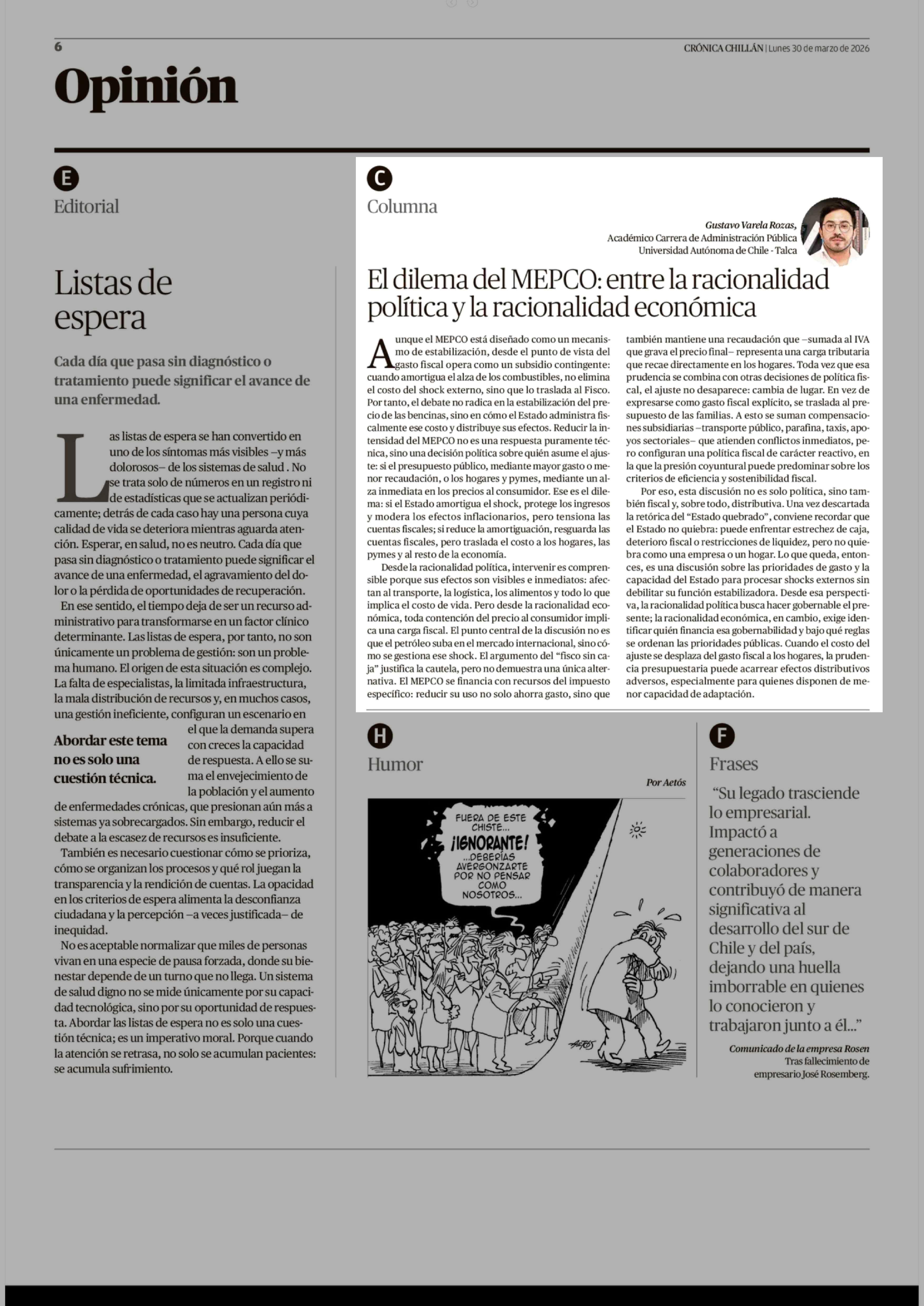 Columnas de Opinión: El dilema del MEPCO: entre la racionalidad política y la racionalidad económica 30-03-2026 Crónica de Chillán |