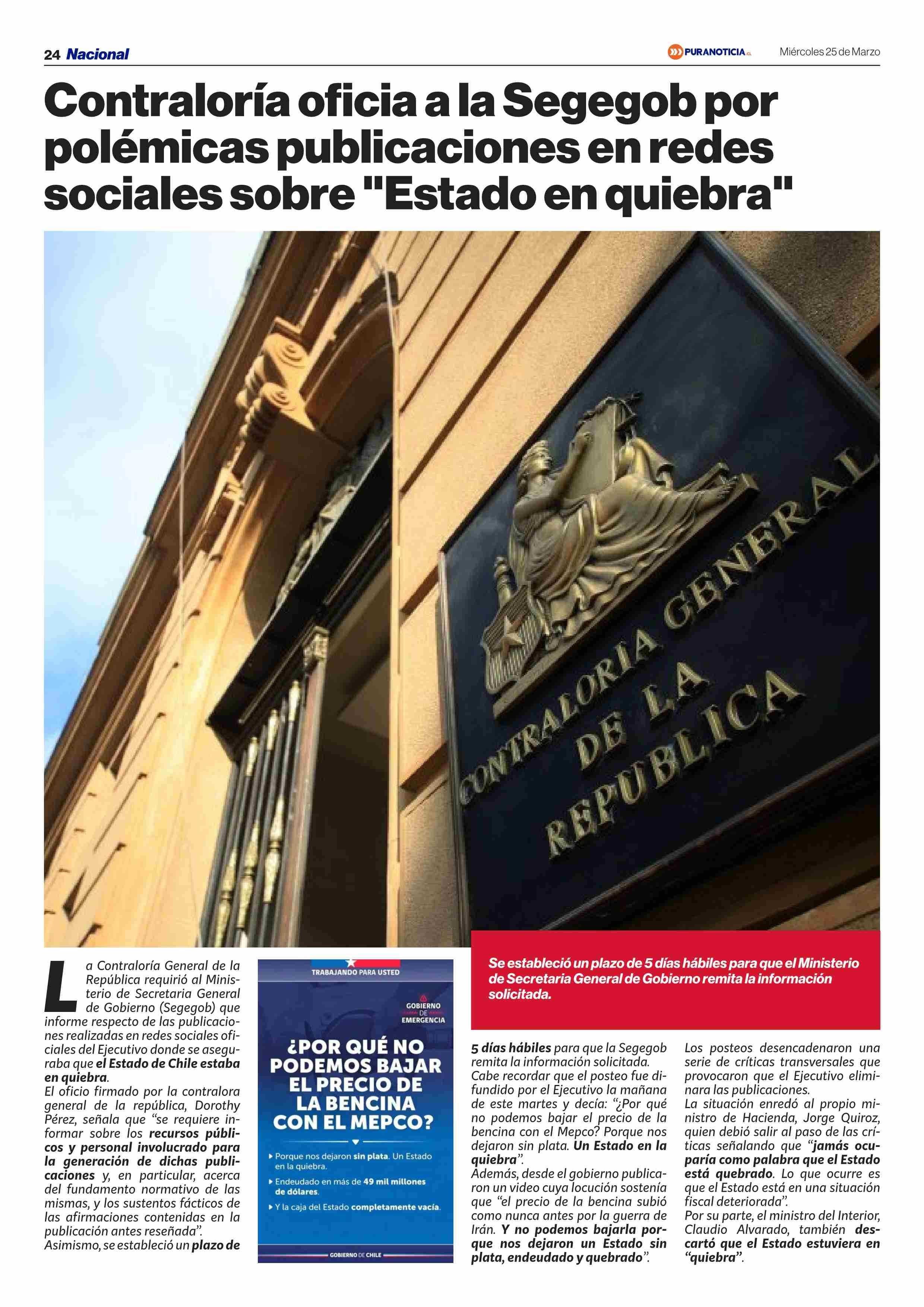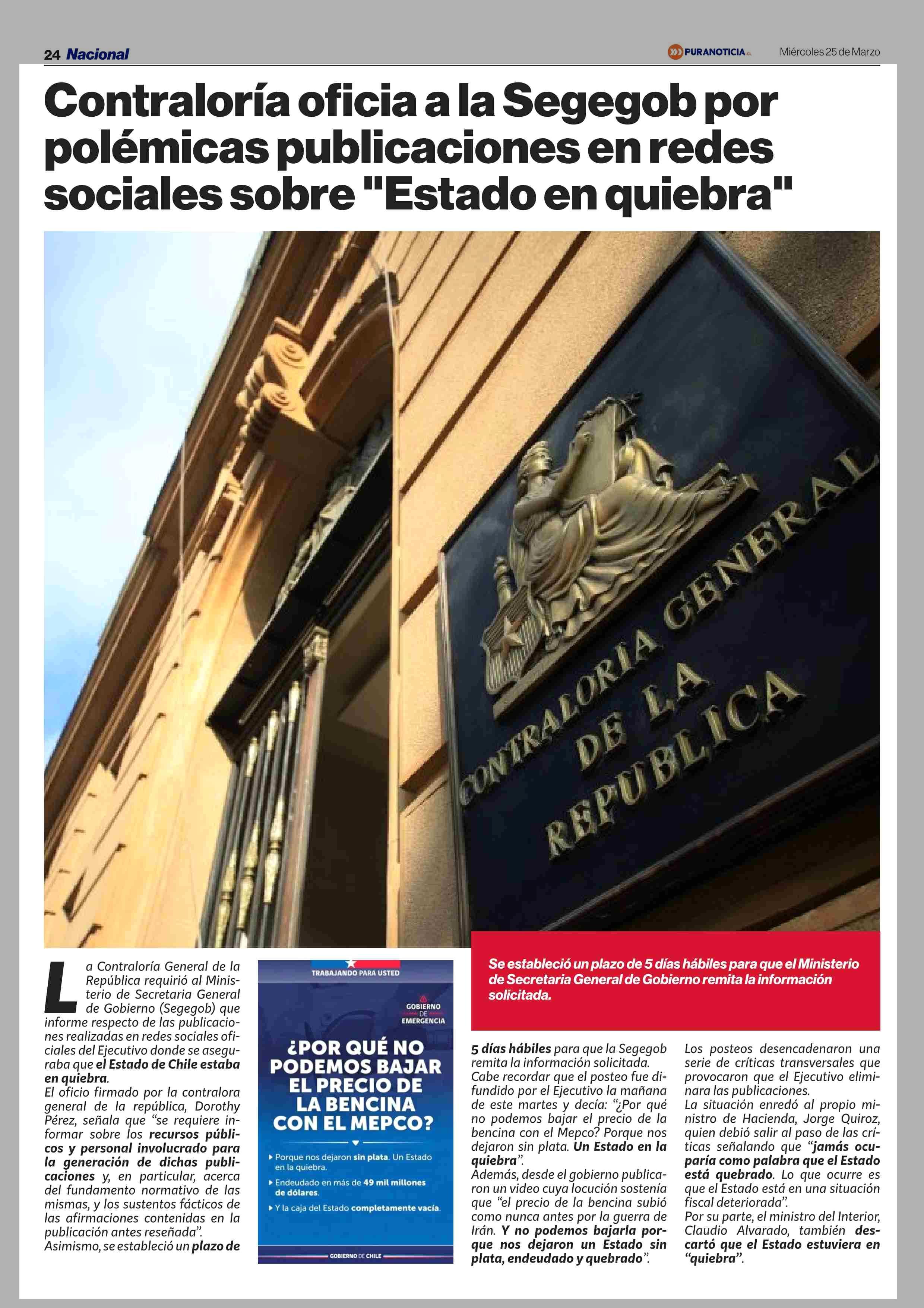 Contraloría oficia a la Segegob por polémicas publicaciones en redes sociales sobre "Estado en quiebra" 25-03-2026 Puranoticia.cl |