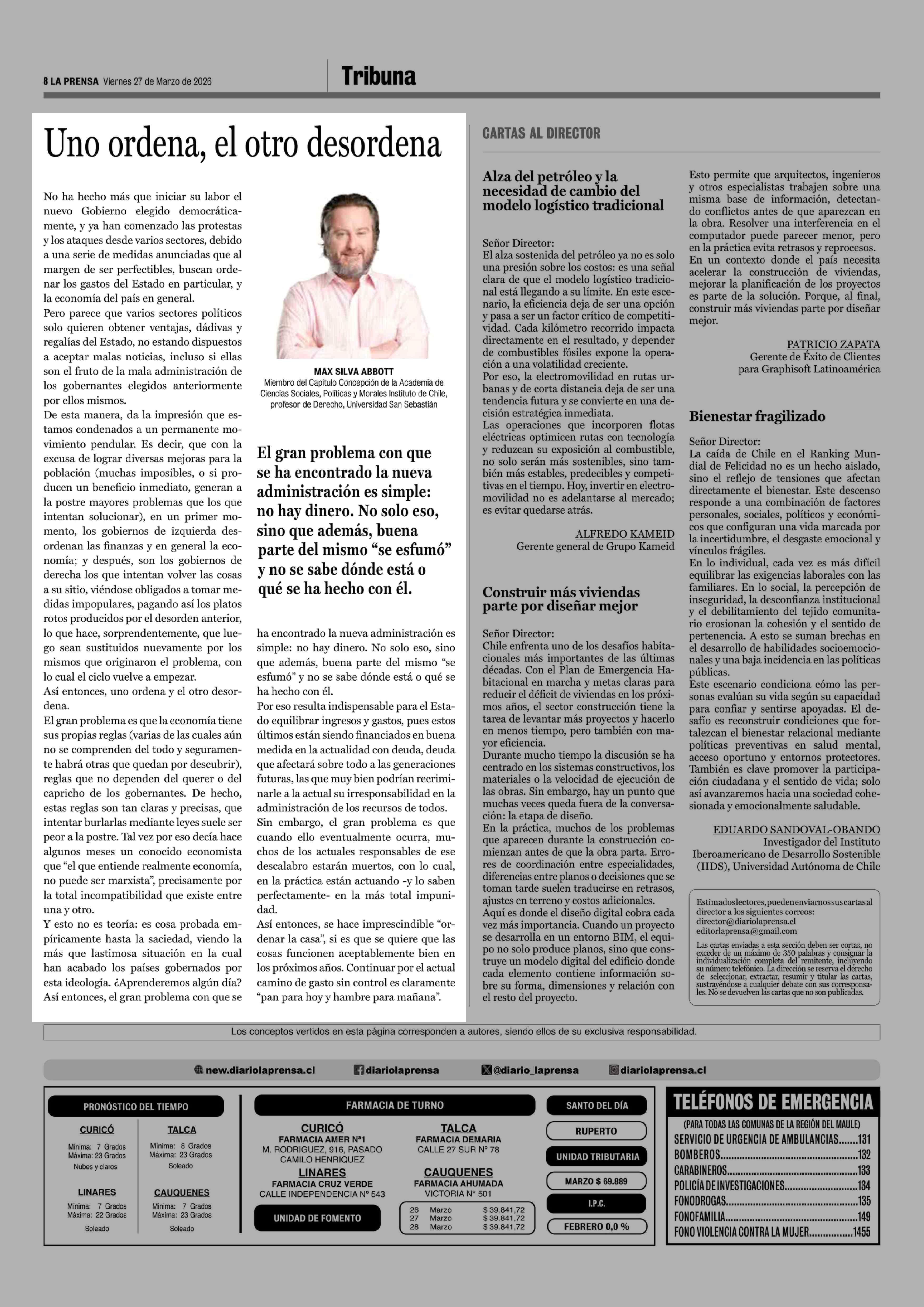 Columnas de Opinión: Uno ordena, el otro desordena 27-03-2026 La Prensa de Curicó |