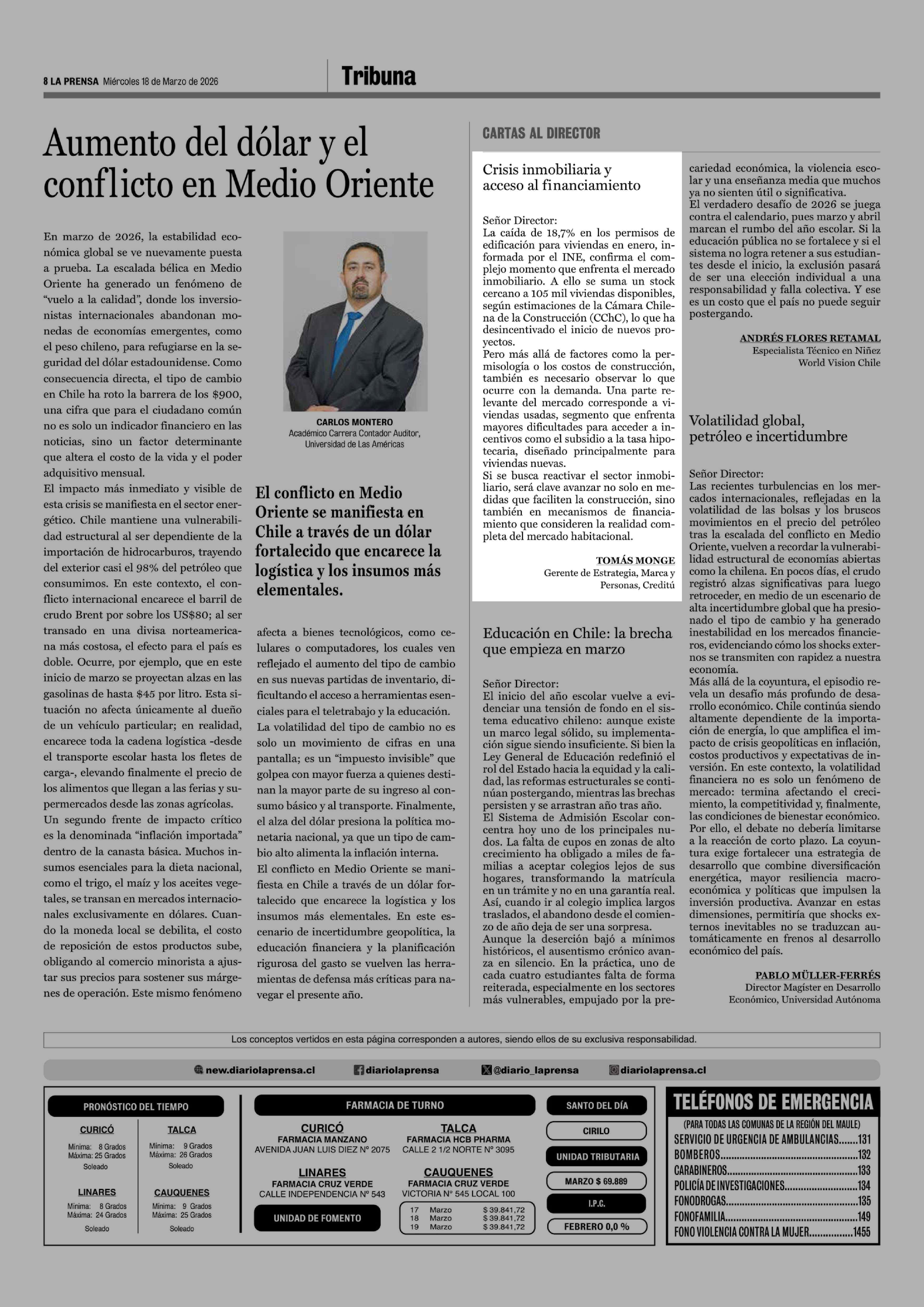 Cartas: Crisis inmobiliaria y acceso al financiamiento 18-03-2026 La Prensa de Curicó |