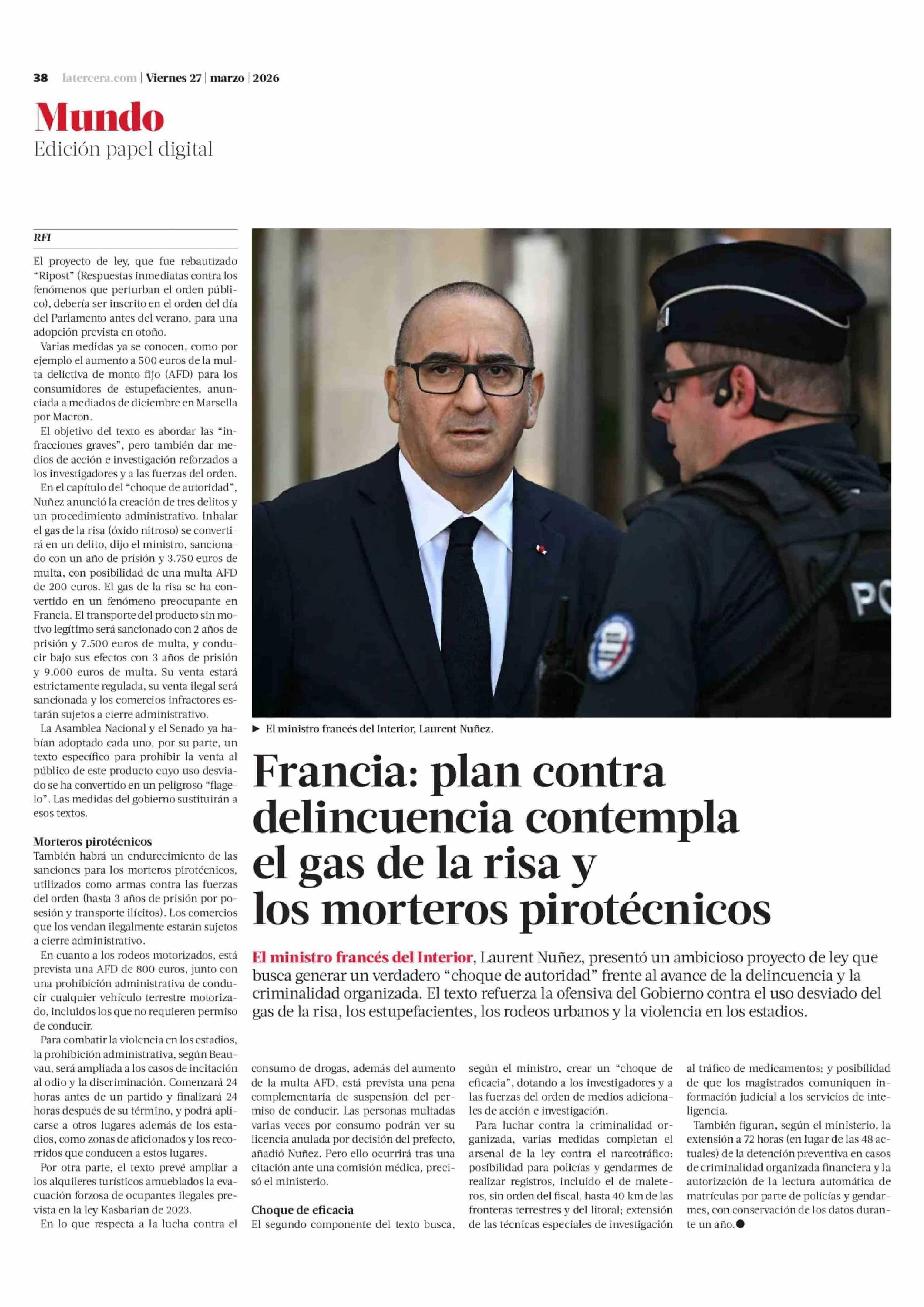 Francia: plan contra delincuencia contempla el gas de la risa y los morteros pirotécnicos 27-03-2026 La Tercera |
