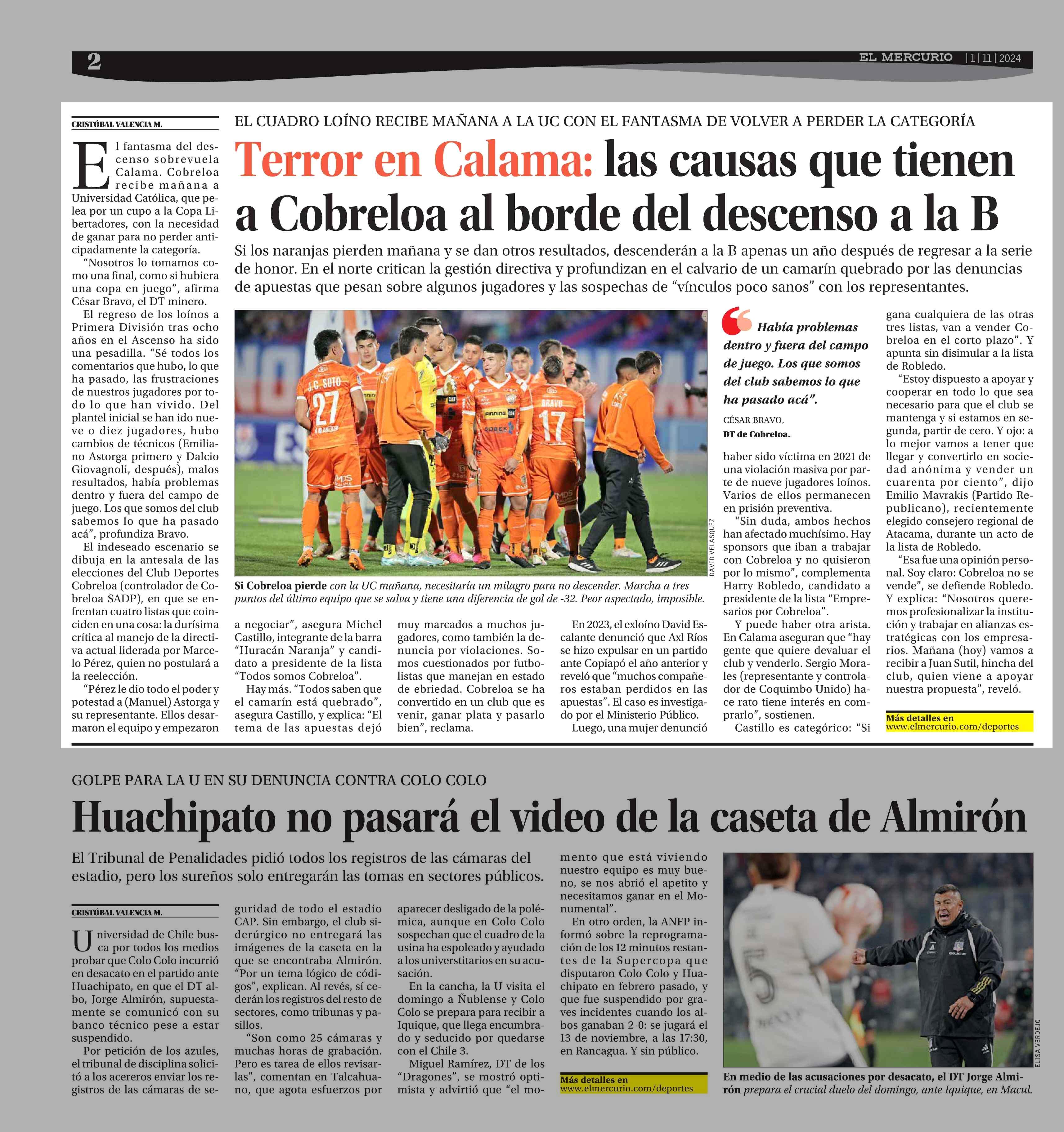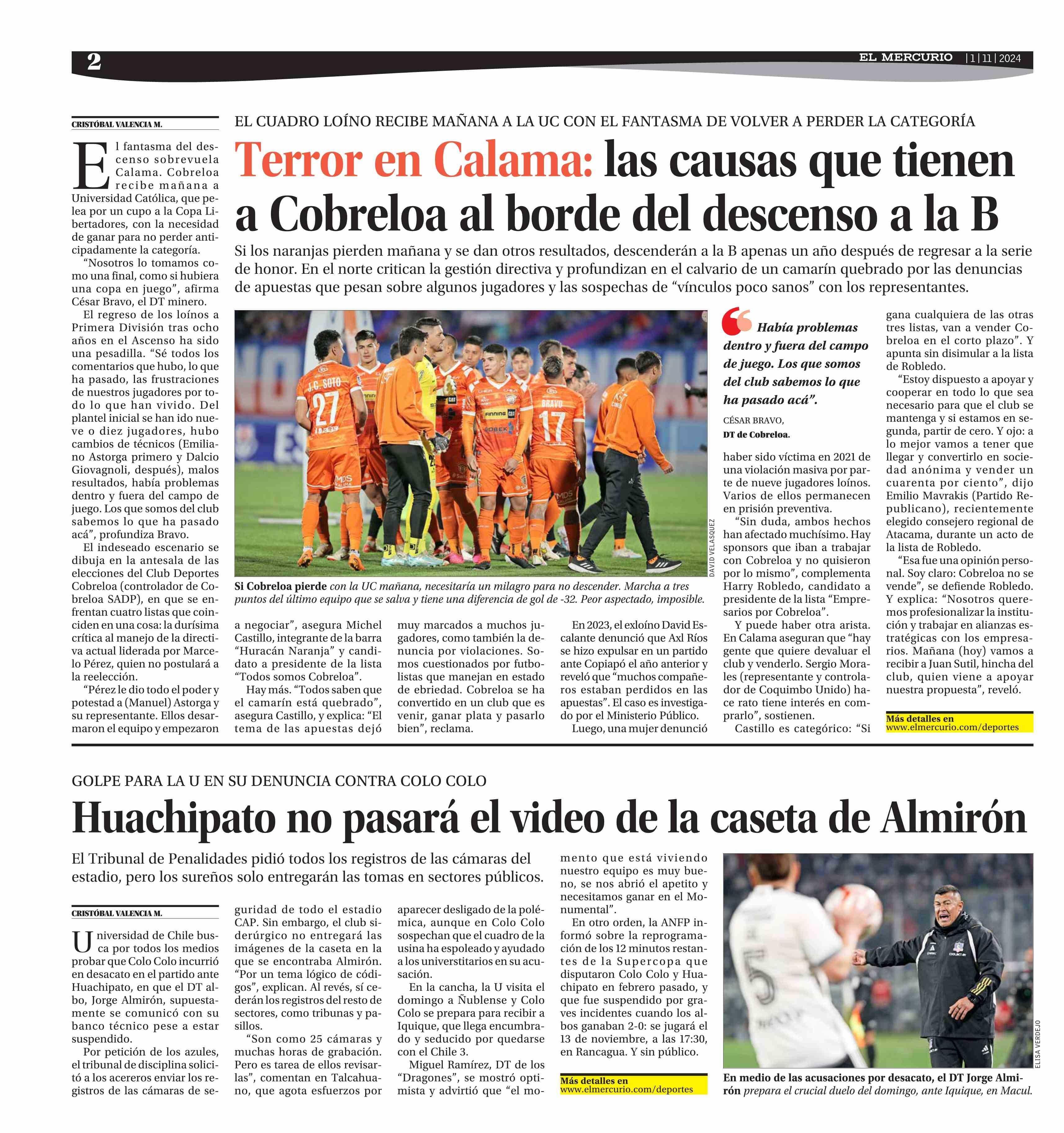 Terror en Calama: las causas que tienen a Cobreloa al borde del descenso a la B 01-11-2024 El Mercurio |