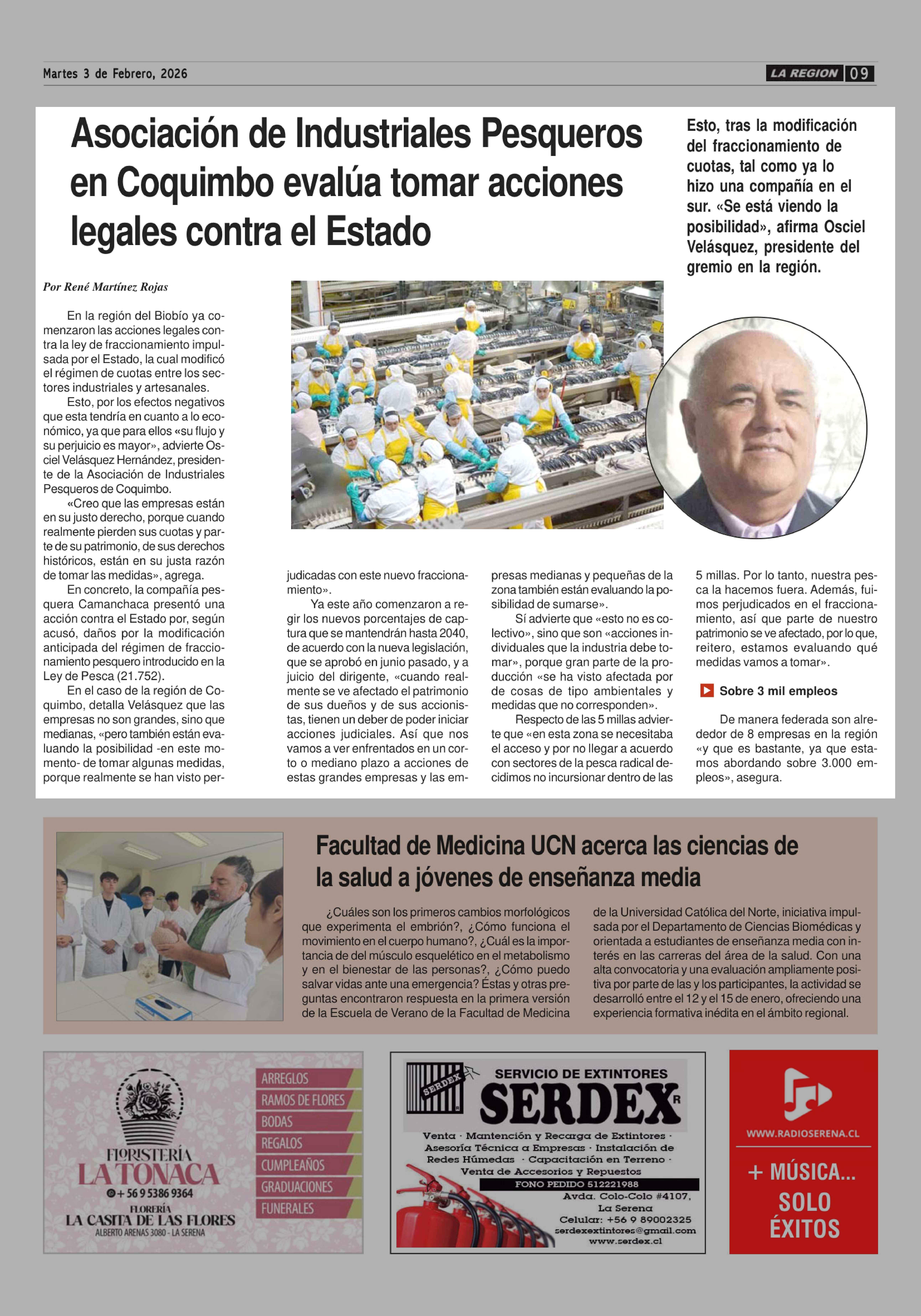 Asociación de Industriales Pesqueros en Coquimbo evalúa tomar acciones legales contra el Estado 03-02-2026 Diario la Región |