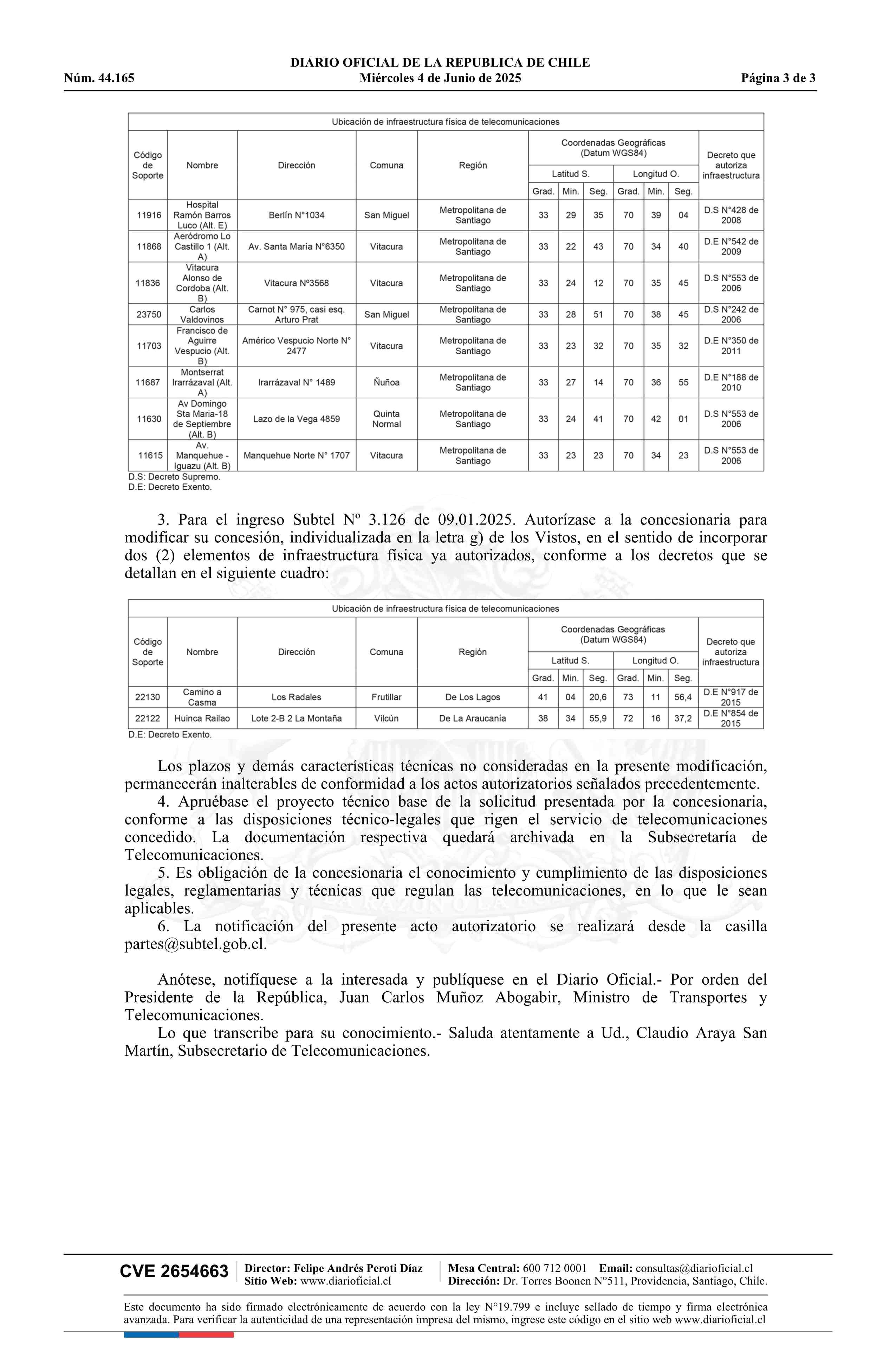 Decreto exento número 342, de 2025.- Modifica concesión de servicio intermedio de telecomunicaciones, que únicamente provea infraestructura física para telecomunicaciones, a la empresa Sites Chile S.A.