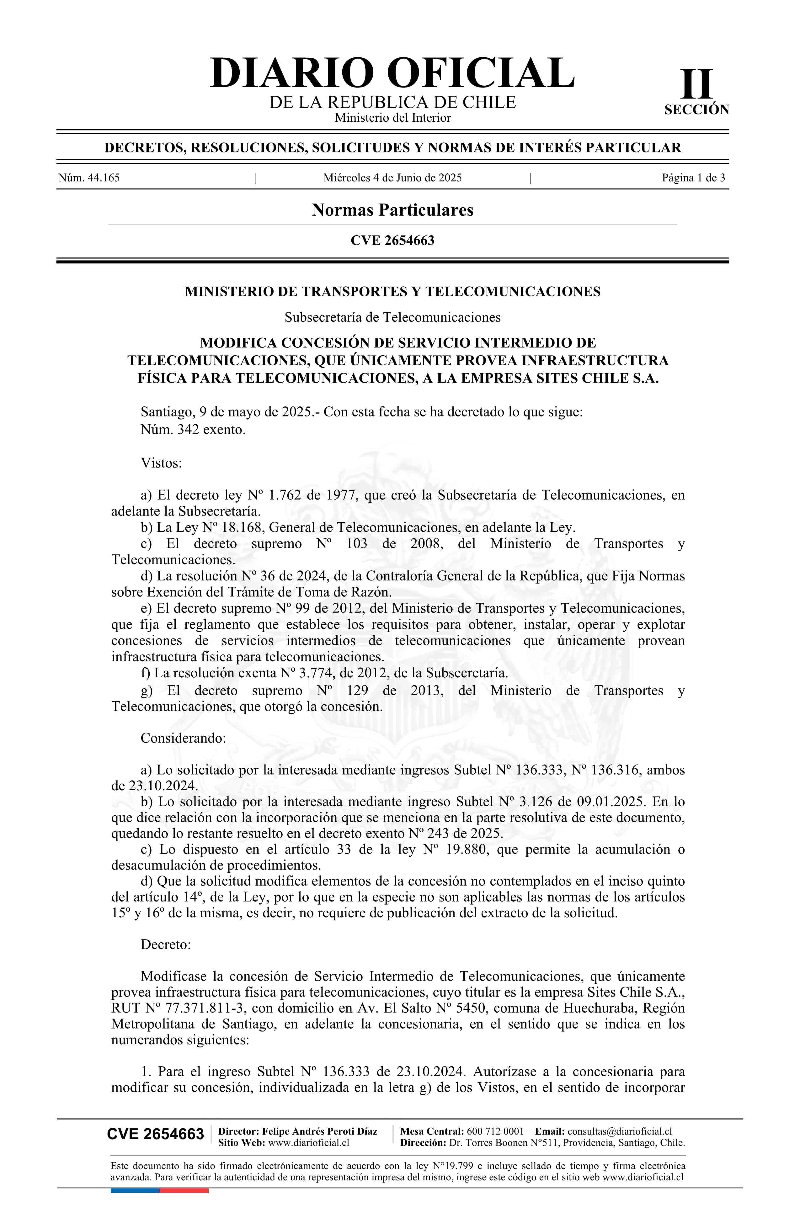 Título: Decreto exento número 342, de 2025.- Modifica concesión de servicio intermedio de telecomunicaciones, que únicamente provea infraestructura física para telecomunicaciones, a la empresa Sites Chile S.A.