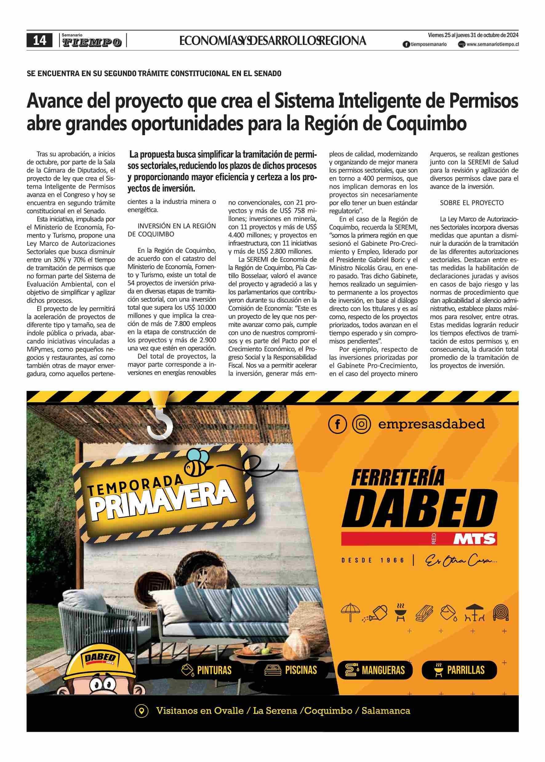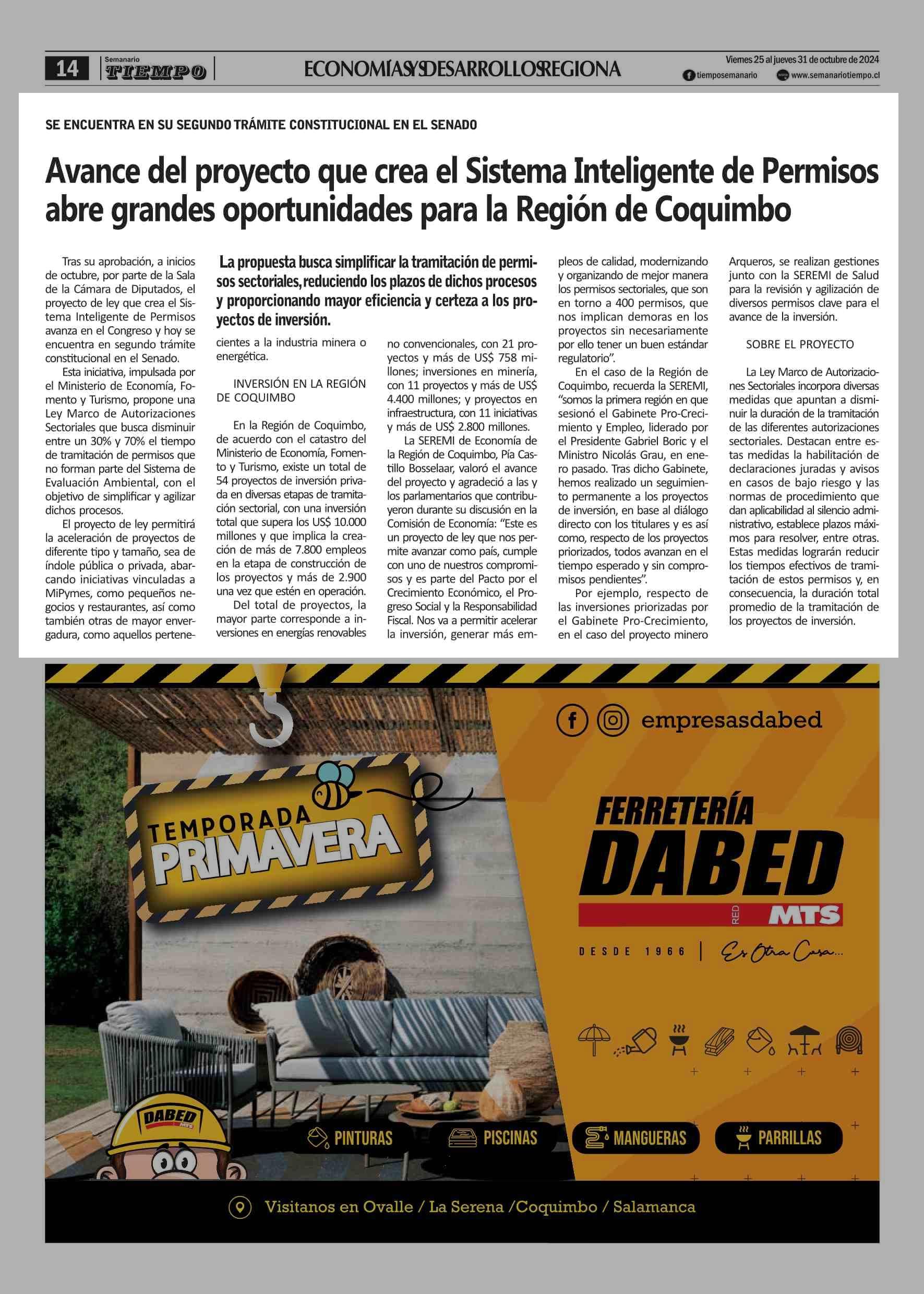 Avance del proyecto que crea el Sistema Inteligente de Permisos abre grandes oportunidades para la Región de Coquimbo 25-10-2024 Semanario Tiempo |