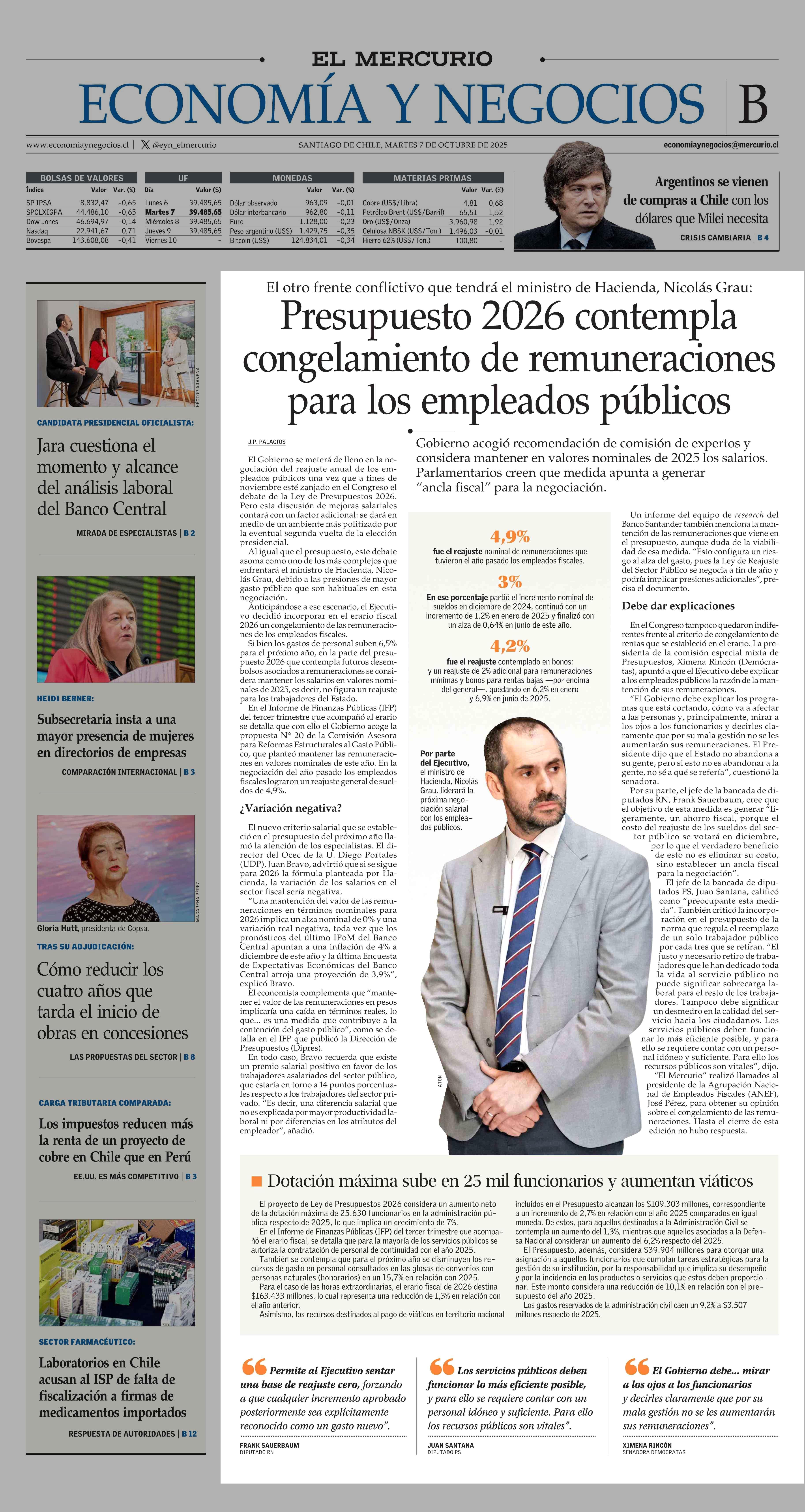 Presupuesto 2026 contempla congelamiento de remuneraciones para los empleados públicos 07-10-2025 El Mercurio |