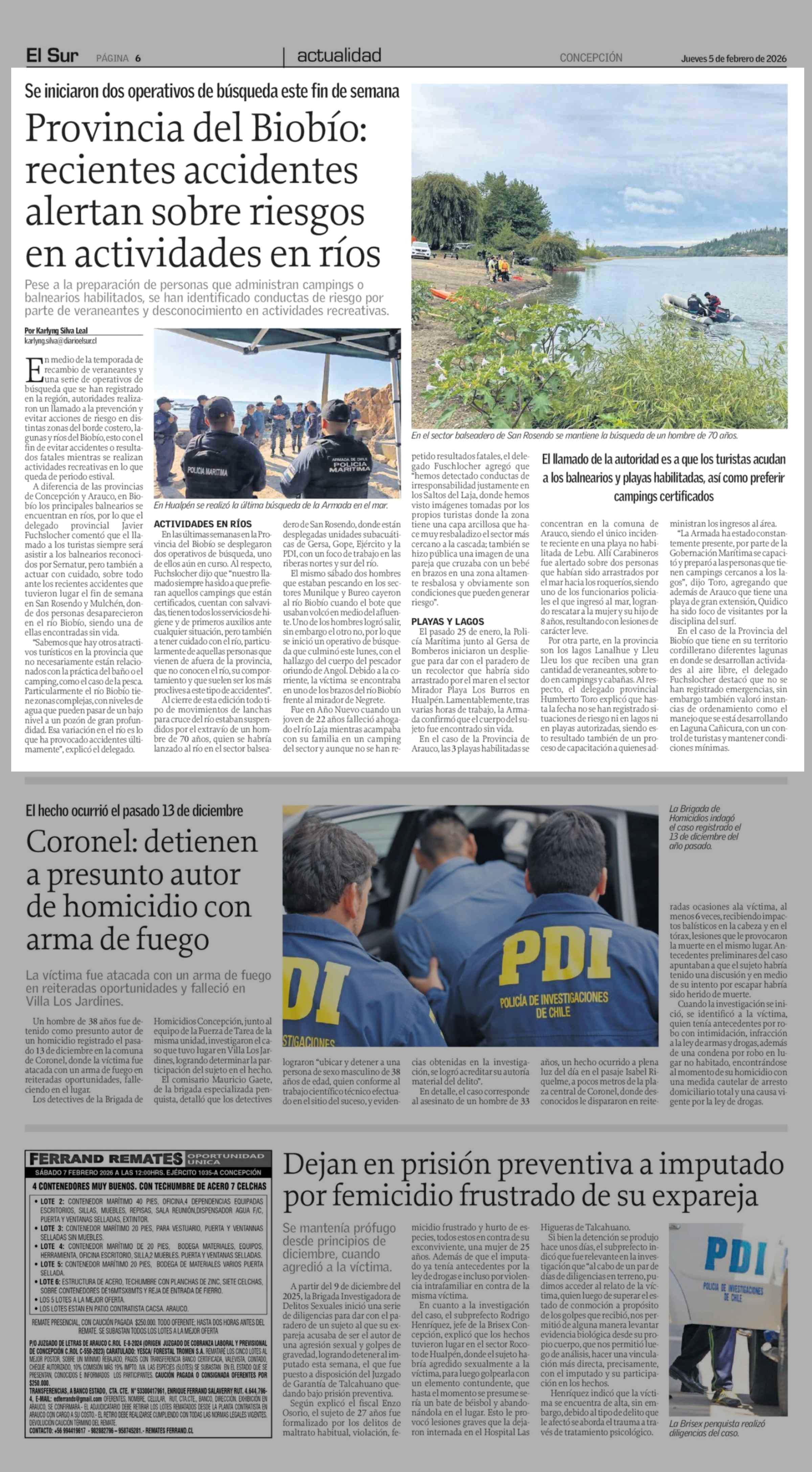 Provincia del Biobío: recientes accidentes alertan sobre riesgos en actividades en ríos 05-02-2026 El Sur |