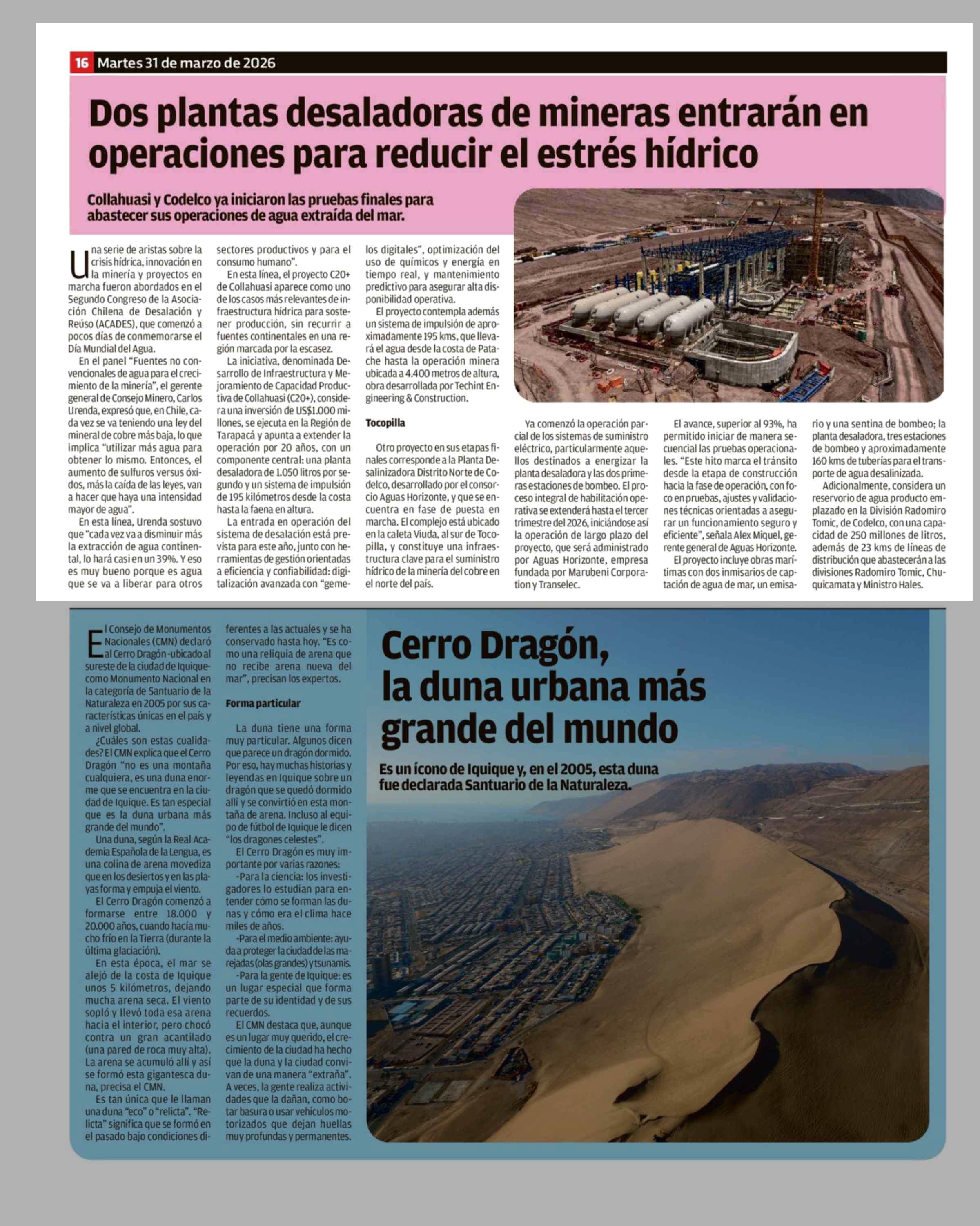 Dos plantas desaladoras de mineras entrarán en operaciones para reducir el estrés hídrico 31-03-2026 El Mercurio de Valparaíso |