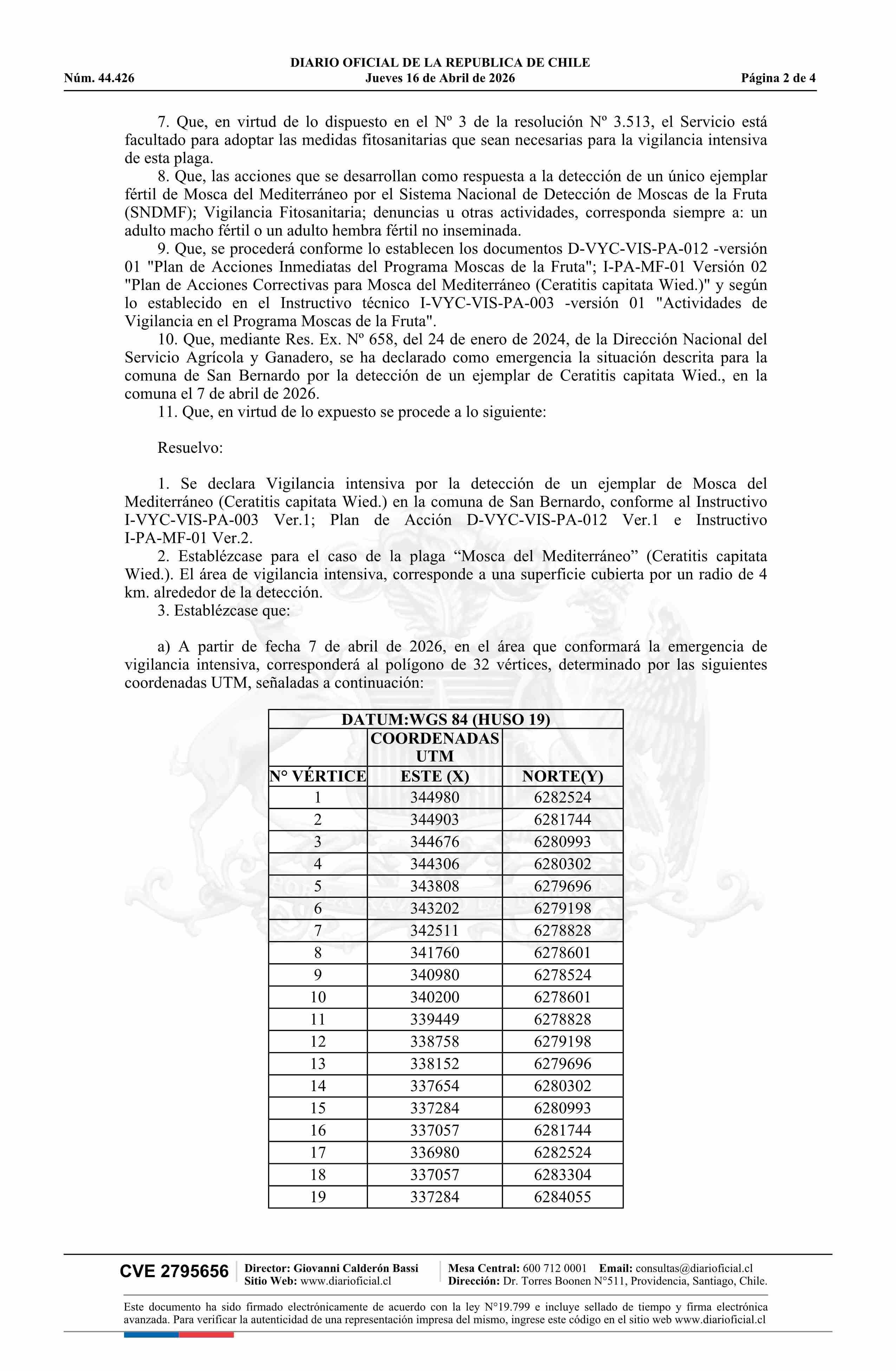 Título: Resolución exenta número 682, de 2026.- Se activa vigilancia intensiva ante la detección de un único ejemplar adulto de Mosca del Mediterráneo (Ceratitis capitata Wied). Comuna de San Bernardo