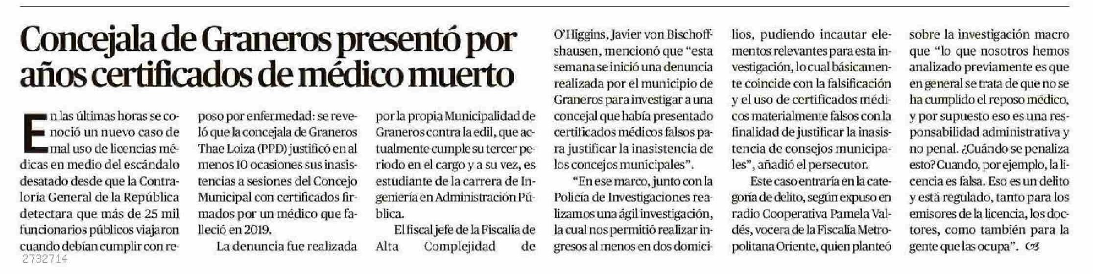 | Título: | Concejala de Graneros presentó por años certificados de médico muerto |