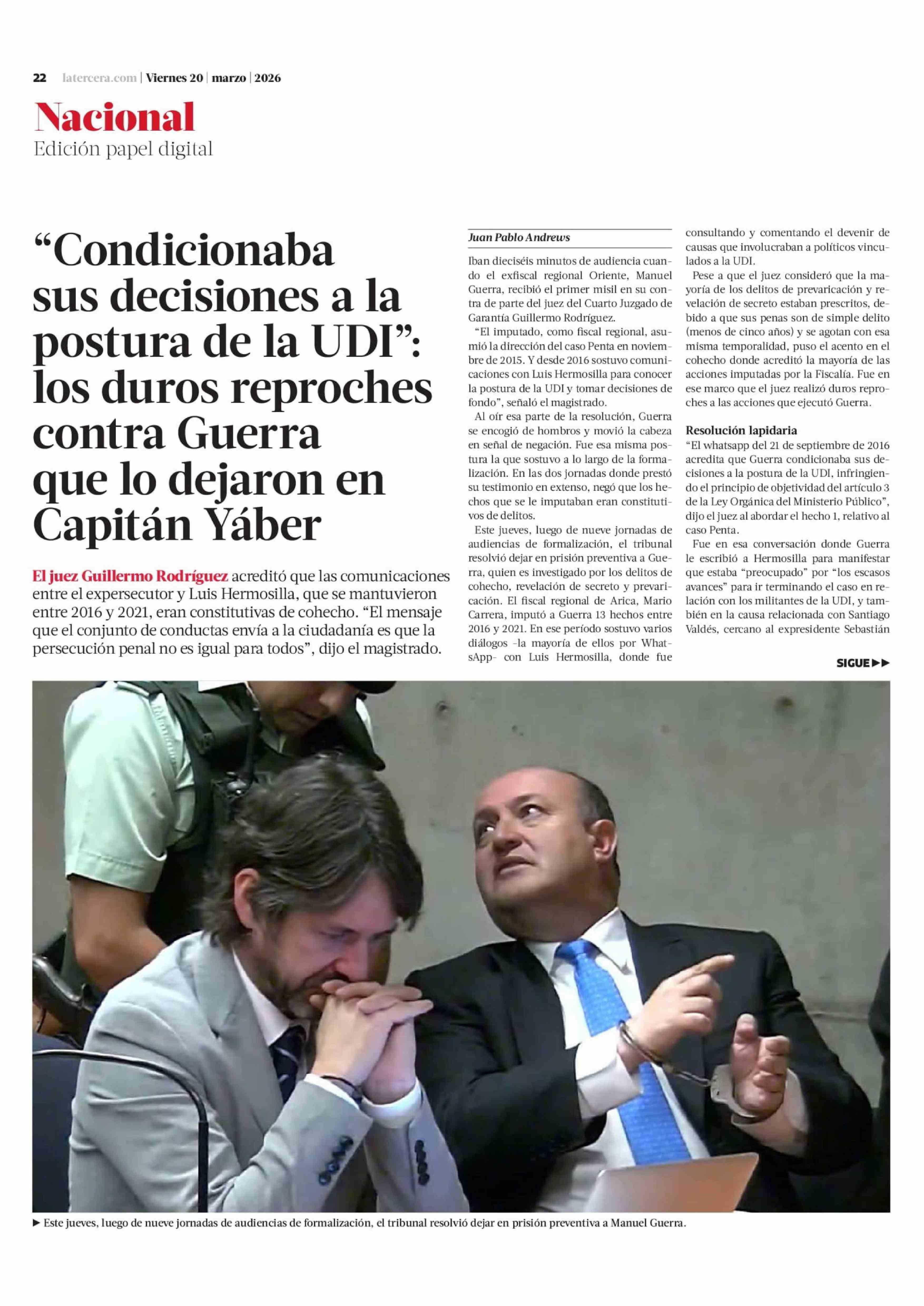 "Condicionaba sus decisiones a la postura de la UDI": los duros reproches contra Guerra que lo dejaron en Capitán Yáber 20-03-2026 La Tercera |