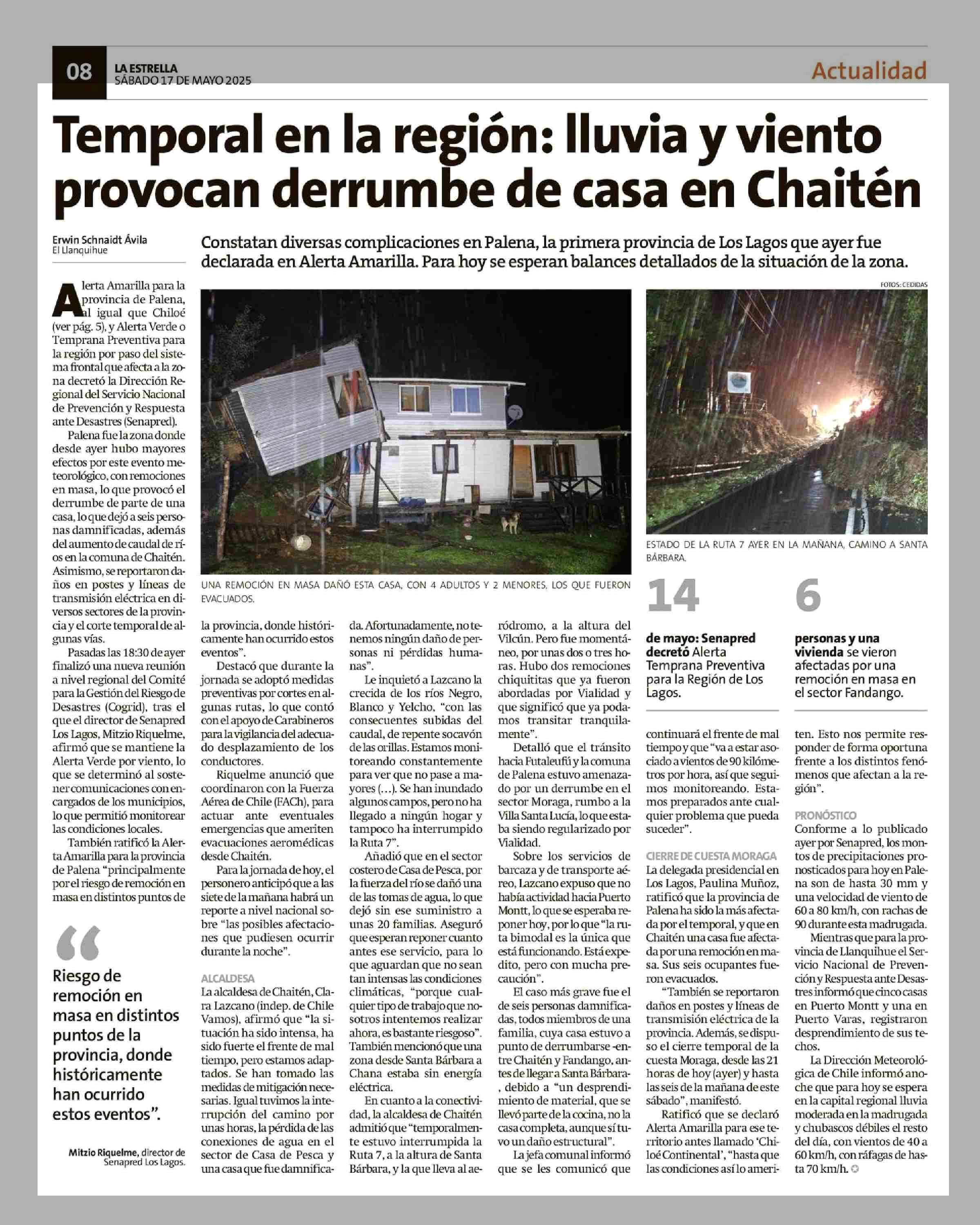 Temporal en la región: lluvia y viento provocan derrumbe de casa en Chaitén 17-05-2025 La Estrella de Chiloé |