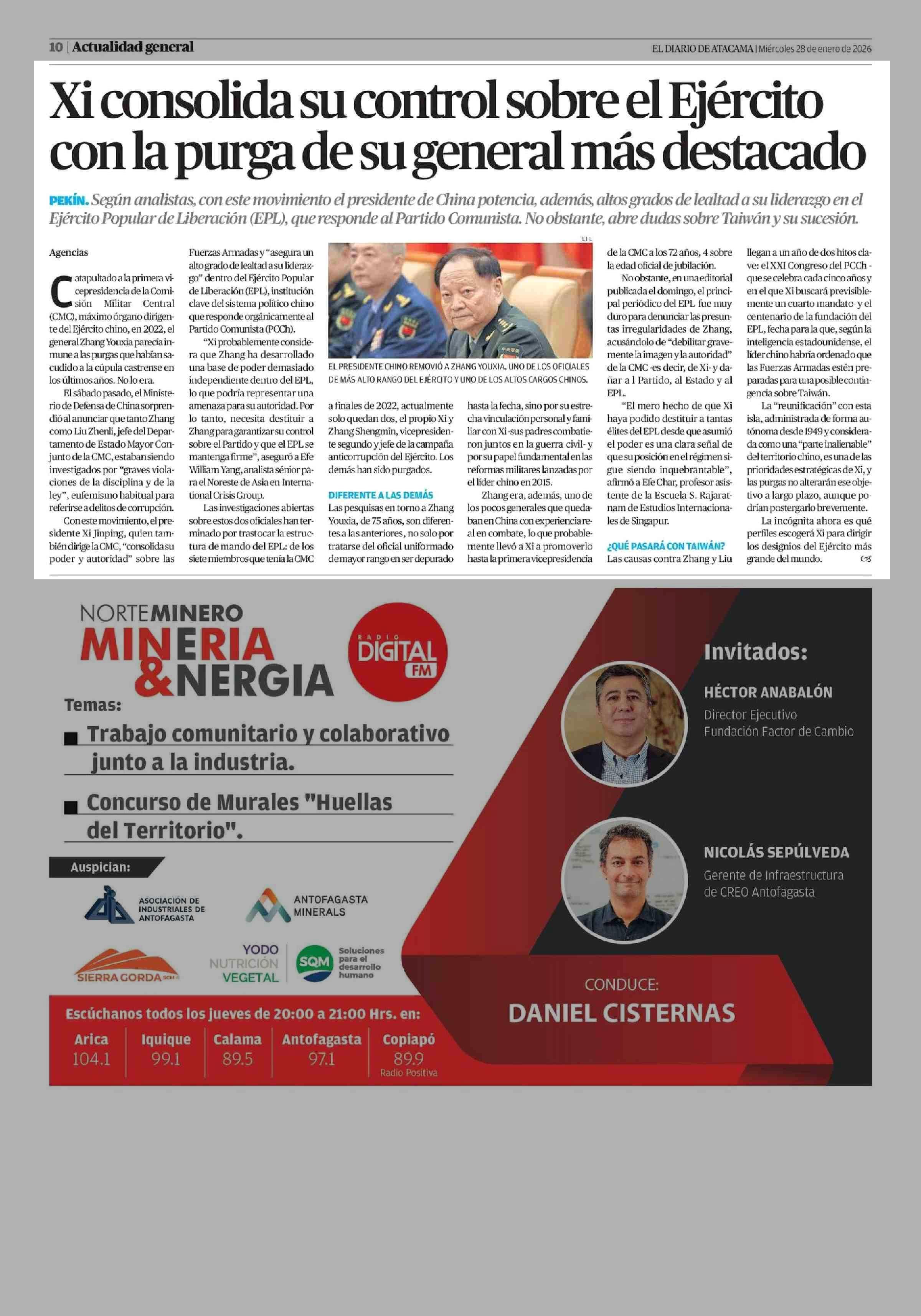 Xi consolida su control sobre el Ejército con la purga de su general más destacado 28-01-2026 El Diario de Atacama |