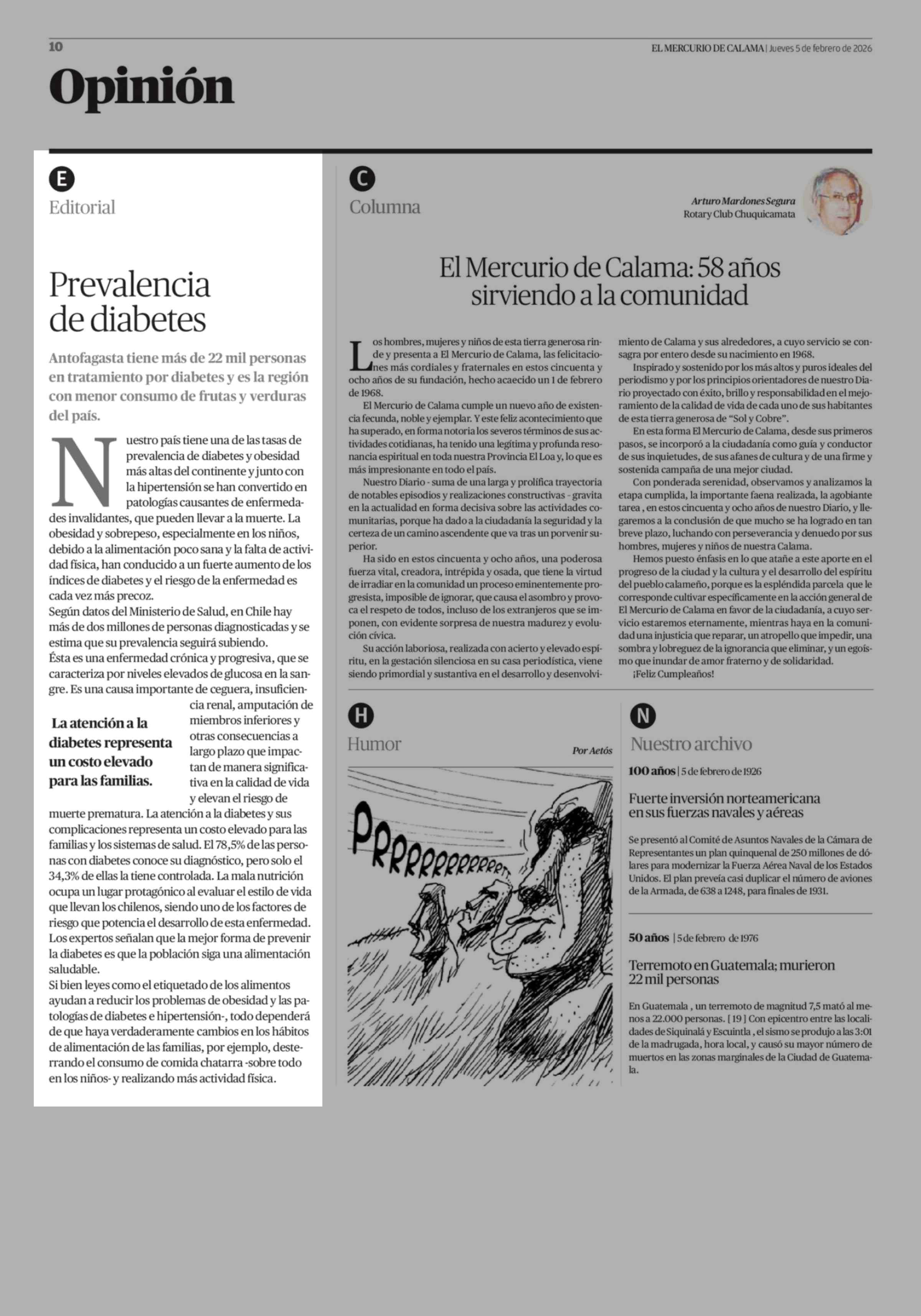 Editorial: Prevalencia de diabetes 05-02-2026 El Mercurio de Calama |